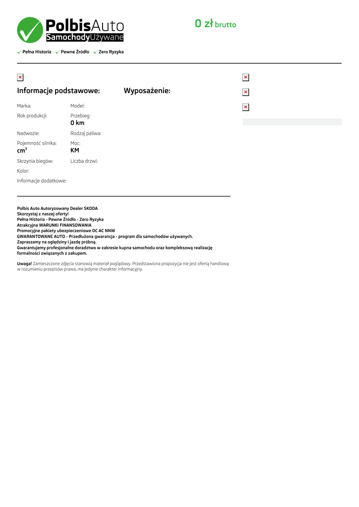 0 zł brutto Informacje podstawowe: Marka: Model: Rok produkcji: Przebieg: Wyposażenie: 0 km Nadwozie: Rodzaj paliwa: Pojemność silnika: Moc: cm3 KM Skrzynia biegów: Liczba drzwi: Kolor: Informacje dodatkowe: Polbis Auto Autoryzowany Dealer SKODA Skorzystaj z naszej oferty! Pełna Historia - Pewne Źródło - Zero Ryzyka Atrakcyjne WARUNKI FINANSOWANIA Promocyjne pakiety ubezpieczeniowe OC AC NNW GWARANTOWANE AUTO - Przedłużona gwarancja - program dla samochodów używanych. Zapraszamy na oględziny i jazdę próbną. Gwarantujemy profesjonalne doradztwo w zakresie kupna samochodu oraz kompleksową realizację formalności związanych z zakupem. Uwaga! Zamieszczone zdjęcia stanowią materiał poglądowy. Przedstawiona propozycja nie jest ofertą handlową w rozumieniu przepisów prawa, ma jedynie charakter informacyjny.