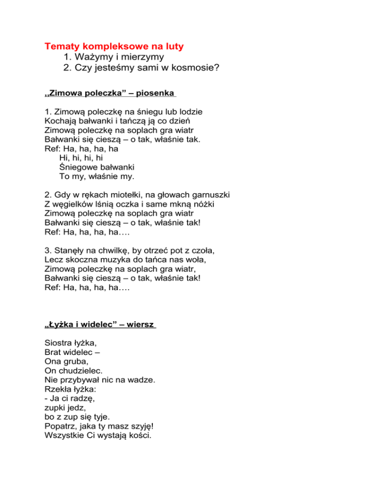 Tematy kompleksowe na luty 1. Ważymy i mierzymy 2. Czy jesteśmy sami w kosmosie? ,,Zimowa poleczka” – piosenka 1. Zimową poleczkę na śniegu lub lodzie Kochają bałwanki i tańczą ją co dzień Zimową poleczkę na soplach gra wiatr Bałwanki się cieszą – o tak, właśnie tak. Ref: Ha, ha, ha, ha Hi, hi, hi, hi Śniegowe bałwanki To my, właśnie my. 2. Gdy w rękach miotełki, na głowach garnuszki Z węgielków lśnią oczka i same mkną nóżki Zimową poleczkę na soplach gra wiatr Bałwanki się cieszą – o tak, właśnie tak! Ref: Ha, ha, ha, ha…. 3. Stanęły na chwilkę, by otrzeć pot z czoła, Lecz skoczna muzyka do tańca nas woła, Zimową poleczkę na soplach gra wiatr, Bałwanki się cieszą – o tak, właśnie tak! Ref: Ha, ha, ha, ha…. „Łyżka i widelec” – wiersz Siostra łyżka, Brat widelec – Ona gruba, On chudzielec. Nie przybywał nic na wadze. Rzekła łyżka: - Ja ci radzę, zupki jedz, bo z zup się tyje. Popatrz, jaka ty masz szyję! Wszystkie Ci wystają kości. Długo tak zamierzasz pościć? - Nie chcę zup, bo ich nie znoszę. Jedz je sama, Bardzo proszę! Dość już tego mam gadania. Ja jem tylko drugie dania.