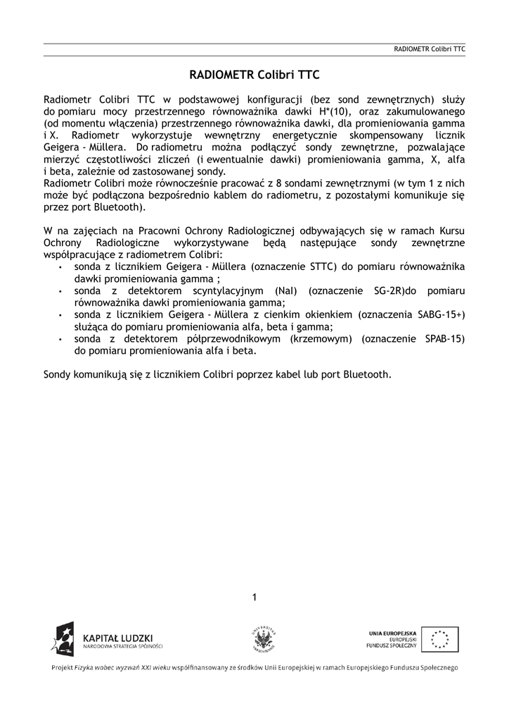 RADIOMETR Colibri TTC RADIOMETR Colibri TTC Radiometr Colibri TTC w podstawowej konfiguracji (bez sond zewnętrznych) służy do pomiaru mocy przestrzennego równoważnika dawki H*(10), oraz zakumulowanego (od momentu włączenia) przestrzennego równoważnika dawki, dla promieniowania gamma i X. Radiometr wykorzystuje wewnętrzny energetycznie skompensowany licznik Geigera - Müllera. Do radiometru można podłączyć sondy zewnętrzne, pozwalające mierzyć częstotliwości zliczeń (i ewentualnie dawki) promieniowania gamma, X, alfa i beta, zależnie od zastosowanej sondy. Radiometr Colibri może równocześnie pracować z 8 sondami zewnętrznymi (w tym 1 z nich może być podłączona bezpośrednio kablem do radiometru, z pozostałymi komunikuje się przez port Bluetooth). W na zajęciach na Pracowni Ochrony Radiologicznej odbywających się w ramach Kursu Ochrony Radiologiczne wykorzystywane będą następujące sondy zewnętrzne współpracujące z radiometrem Colibri: • sonda z licznikiem Geigera - Müllera (oznaczenie STTC) do pomiaru równoważnika dawki promieniowania gamma ; • sonda z detektorem scyntylacyjnym (NaI) (oznaczenie SG-2R)do pomiaru równoważnika dawki promieniowania gamma; • sonda z licznikiem Geigera - Müllera z cienkim okienkiem (oznaczenia SABG-15+) służąca do pomiaru promieniowania alfa, beta i gamma; • sonda z detektorem półprzewodnikowym (krzemowym) (oznaczenie SPAB-15) do pomiaru promieniowania alfa i beta. Sondy komunikują się z licznikiem Colibri poprzez kabel lub port Bluetooth. 1 RADIOMETR Colibri TTC Podstawy obsługi radiometru Włączenie urządzenia następuje przez naciśnięcie przycisku O/I (patrz załączony na następnej stronie Rys.1 i objaśnienia dotyczące klawiszy radiometru). Gotowy do pracy radiometr przy trybie pomiaru bez sond zewnętrznych wyświetla zarówno wewnętrzną moc dawki mierzona przez wewnętrzny licznik GM na szybko reagującym, półlogarytmicznym wykresie prążkowym, dla analogowej reprezentacji pomiaru, oraz uśredniony odczyt cyfrowy. Colibri równocześnie wyświetla moc dawki i dawkę zintegrowaną. Gdy podłączona jest zewnętrzna sonda, wyświetla on pomiar za pomocą tej sondy oraz moc dawki mierzoną przez wewnętrzny detektor, a jednocześnie kontynuuje całkowanie odebranej dawki. Radiometr umożliwia m.in.: • ustawienie czasu trwania pomiaru; • ustawienie limitu liczby zliczeń w danym pomiarze; • uruchomienie sekwencji pomiarów (w zadanym czasie i z zadanym interwałem); • pracę w modzie "poszukiwanie źródła". 2 RADIOMETR Colibri TTC RYS. 1 3 RADIOMETR Colibri TTC RYS. 2 1. 2. 3. 4. 5. 6. 7. 8. 9. 10. 11. 12. 13. 14. Przycisk wskaźnika poziomu naładowania, pozwalający na dostęp do opcji oszczędzania energii. Przycisk do uaktywniania i nastawiania parametrów łącza Bluetooth. Przycisk do uaktywniania i nastawiania komunikacji Wi-Fi. Przycisk do uaktywniania wibratora alarmowego i słuchawki Bluetooth. Przycisk dostępu do zaawansowanych parametrów. Przycisk dostępu do parametrów dziennika. Przycisk do podłączania sond Bluetooth. Wykres słupkowy związany z głównym pomiarem. Wtórny pomiar. Zawsze związany z wewnętrznym detektorem. W tym wypadku pokazana jest dawka zintegrowana. Przyciski ekranowe do nastawiania trybu pomiaru i parametrów aktualnego trybu pomiaru. Ich funkcja zależy od aktualnego trybu. Rodzaj mierzonego promieniowania. Główny pomiar. Pokazana moc dawki pochodzi od wewnętrznego detektora. Wskazuje typ sondy dającej główny pomiar. STTC oznacza, że pomiar pochodzi z detektora typu Time To Count. Piktogram reprezentujący typ sondy dokonującej pomiaru: wewnętrzna. 4 RADIOMETR Colibri TTC SONDA STTC - podstawowe informacje Sonda STTC to sonda z energetycznie skompensowanym licznikiem Geigera - Müllera służaca do pomiaru równoważnika dawki promieniowania gamma. Posiada aluminiową obudowę łatwą do odkażania. Specyfikacja sondy: Zakres pomiaru: Zakres energii: Dokładność pomiaru: Czas odpowiedzi: Szumy tła: Czułość : 0.3 μSv/h do 10 Sv/h Gamma od 58 keV do 1,25 MeV ± 10% zgodnie z kierunkiem odniesienia 137Cs w całym zakresie ± 20% (58 keV do 1.25 MeV przy 00 i 450 ) < 10 s, jeżeli moc dawki < 100 μSv/h w pozostałych przypadkach < 2 s (w przypadku tła w otoczeniu mniejszym niż 0.1 μGy/h): < 0.2 c/s 0.74 cpm/μSv/h Informacje o środowisku w jakim może pracować sonda: Zakres temperatury: od -10 0 C do +50 0 C Wilgotność względna: od 40% do 95% przy 35 0 C. 5 RADIOMETR Colibri TTC SONDA SG-2R - podstawowe informacje Sonda SG-2R to sonda z detektorem scyntylacyjnym (NaI) służąca do pomiaru równoważnika dawki promieniowania gamma. Specyfikacja sondy: Rozmiar kryształu scyntylatora: Czułość dla 137Cs: Tło: 2"x2" 1450 c/s na 1 mGy/h w pomieszczeniu < 100 nGy/h - 120 c/s Informacje o środowisku w jakim może pracować sonda: Zakres temperatury pracy: od –10 0 C do + 45 0 C Zakres wilgotnoś ci wzglę dnej: od 40 do 85 % przy 35 0 C 6 RADIOMETR Colibri TTC SONDA SABG-15+ - podstawowe informacje Sonda SABG-15+ to sonda z licznikiem Geigera - Müllera z cienkim okienkiem mikowym o grubości 2mg/cm2 służąca do pomiaru skażeń powierzchniowych nuklidami emitującymi promieniowanie alfa, beta i gamma. Specyfikacja sondy: Powierzchnia detektora: 15.5 cm2 Metalowa siatka ochronna o przepuszczalnoś ci 75%; Dolna granica energii wykrywania promieniowania gamma : 30 keV; Wydajność detekcji w kontakcie ze źródłem, zgodnie z normą ISO 8769 dla 100 cm2 : Radionuklid Wydajność detekcji w kącie 2π 14 C 17 % (± 20 %) 36 Cl 47 % (± 20 %) 60 Co 32 % (± 20 %) 241 Am 35 % (± 20 %) 90 Sr + 90Y 50 % (± 20 %) 239 Pu 29 % (± 20 %) Limit wykrywalności w kontakcie ze źródłem (zgodnie z normą ISO 8796 dla 100 cm2 ): Radionuklid Limit detekcji (Bq) 90 Sr + 90 Y 2.5 36 Cl 2.6 241 Am 4.7 Limity energii alfa beta gamma mierzone promieniowania: > 2.6 MeV > 30 keV > 6 keV Czas pomiaru ze źródłem: 10 s Zakres 