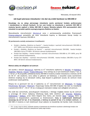 Raport Warszawa, 10 styczeo 2011 Jak kupid pierwsze mieszkanie i nie dad się zrobid bankowi na 300.000 zł Decydując się na zakup pierwszego mieszkania warto porównad kredyty preferencyjne i standardowe w różnych bankach. Za ten sam kredyt na mieszkanie o wartości 350 000 zł możemy łącznie zapłacid o blisko 300 000 zł więcej. Niestety jedynie 25% warszawskich ofert mieszkao na sprzedaż spełnia wymogi programu Rodzina na Swoim. Wyszukiwarka nieruchomości Morizon.pl wraz z porównywarką produktów finansowych Finanse.nokaut.pl sprawdziła jak duże mieszkanie kupimy w Warszawie biorąc kredyt na nieruchomośd o wartości 350 000 zł. W porównaniu zostały zestawione 4 możliwości: Kredyt z dopłatą „Rodzina na Swoim” – kwota kredytu i wartośd nieruchomości 350.000 zł, LTV1 100%, przy 30 letnim okresie kredytowania. Kredyt z dopłatą „Rodzina na Swoim” – wartośd nieruchomości 350.000, kwota kredytu 280.000 zł przy LTV 80% i 30 letnim okresie kredytowania. Kredyt bez dopłaty – kwota kredytu i wartośd nieruchomości 350.000 zł, LTV 100%, przy 30 letnim okresie kredytowania. Kredyt bez dopłaty – wartośd nieruchomości 350.000, kwota kredytu 280.000 zł przy LTV 80% i 30 letnim okresie kredytowania. Metraż zależy od odległości od centrum Jak wynika z danych Morizon.pl, najmniej za m2 mieszkania zapłacimy w Wesołej, na Białołęce, Targówku, Wawrze, Ursusie i Pradze Północnej. Ceny wahają się w tych dzielnicach między 7 tyś. zł, a 7,8 tyś. zł. W przypadku zakładanej kwoty 350 000 zł możemy znaleźd mieszkania o metrażu od 44 do 50 m2. Jak wiadomo, cena zależy tu głównie od lokalizacji, a wszystkie wyżej wymienione dzielnice znajdują się na obrzeżach stolicy, skąd dojazd w godzinach szczytu do centrum może przekroczyd nawet godzinę. Więcej bo w granicach 8,5 tys zł zapłacimy za m2 nieruchomości we Włochach, na Pradze Południowej, Bemowie i Bielanach. Dysponując kwotą 350 000 zł będzie nas stad na mieszkanie o powierzchni 40 m2 – 43 m2. W raz z malejącym metrażem maleje nam odległośd od centrum. Dla osób bez samochodu, poszukujących mieszkania, z którego mogłyby dostad się do centrum w przeciągu 20 minut najlepszą lokalizacją będą takie dzielnice jak: Ursynów, Mokotów, Śródmieście i Żoliborz, przez które biegnie linia metra, jak również Wola i Ochota, które są położone w bezpośrednim sąsiedztwie ze Śródmieściem. Ceny w najdroższych dzielnicach zaczynają się od 9,2 tyś. zł na Ursynowie, a kooczą na ponad 13 tyś. zł w ścisłym centrum. Za 350 000 zł możemy w tych dzielnicach liczyd jedynie na kawalerkę lub bardzo małe mieszkanie 1 LTV - (z ang. Loan to value), wskaźnik używany w bankowości do określania wysokości udzielanego kredytu lub pożyczki do wielkości (wartości) zabezpieczeo spłaty tego kredytu. dwupokojowe, ponieważ metraż jaki uzyskamy w tej cenie to od 38 do poniżej 27 m 2. Dzielnica Cena za m2 Metraż Śródmieście Mokotów Żoliborz Ochota Wilanów Wola Ursynów Bielany Bemowo Praga Południe Włochy Praga Północ Ursus Wawer Targówek Białołęka Wesoła 13008,86 10991,99 10953,78 10213,47 9538,96 9503,9 9282,99 8540,62 8453,73 8405,38 8180,54 7987,92 7810,48 7566,01 7479,72 7205,28 7002,84 26,9 31,84 31,95 34,27 36,69 36,83 37,7 40,98 41,4 41,64 42,78 43,82 44,81 46,26 46,79 48,58 49,98 Udział lokali odpowiadających programowi RnS (%) 8,37 36,95 39,13 35,19 51,05 50,66 45,93 70,71 69,46 76,58 77,49 84,57 87,49 85,55 92,41 96,84 98,08 Tabela 1. Wyszczególnienie dzielnic Warszawy ze średnimi cenami za m2, metrażem możliwym do kupienia za kwotę 350 000 zł oraz udziałem lokali spełniających warunki programu Rodzina na Swoim. Źródło: Morizon.pl. 10.08.2010 Decydując się na kredyt preferencyjny należy pamiętad o warunkach jakie musi spełnid dana nieruchomośd. Aby otrzymad kredyt w ramach programu Rodzina na Swoim (RnS), powierzchnia użytkowa mieszkania nie może przekraczad 75m2, a cena za m2 9080,40 zł (w przypadku miasta Warszawy). Inne warunki uzyskania kredytu preferencyjnego możemy znaleźd na stronie www.finanse.nokaut.pl. W Warszawie, gdzie ceny za metr kwadratowy są najwyższe w kraju, należy się spodziewad trudności ze znalezieniem odpowiedniego lokalu, gdyż jedynie 44% mieszkao spełnia te wymagania; najwięcej na obrzeżach miasta bo aż do 98,08% ogłoszeo z Wesołej, najmniej oczywiście w Śródmieściu – nieco ponad 8%. Należy pamiętad o projekcie, który zakładał, że rynek wtórny ma zostad wykluczony z programu Rodzina na swoim. Początkowo zmiany planowano wprowadzid od nowego roku, jednak termin ten został przesunięty i nie określono go konkretnie. Morizon.pl przypomina, że w każdej dzielnicy możemy znaleźd tzw. atrakcyjne oferty, gdzie cena za metr kwadratowy będzie niższa od średniej w zależności od standardu w jakim jest dany lokal. „Kluczowe przy wyborze mieszkania jest to, czy spełnia ono możliwie wszystkie oczekiwania w ramach dostępnego budżetu. Dobrze jest więc, w pierwszej kolejności zbadad swoją zdolnośd kredytową, a dopiero później wyszukad właściwą nieruchomośd. Najprościej jest to zrobid w Internecie, który jest jedynym medium pozwalającym w prosty sposób przejrzed niemal całą dostępną na rynku ofertę. W wyszukiwarce nieruchomości Morizon.pl jest przeszło 650 tysięcy ofert, jest więc w czym wybierad!” - komentuje Bolesław Drapella, prezes Morizon.pl. Kredyt kredytowi nierówny Na podstawie zestawienia od Finanse.Nokaut.pl możemy dokonad analizy kredytów oferowanych przez największe banki w Polsce. Różnica między najtaoszym kredytem „RnS” bez wkładu własnego, a najtaoszym bez dopłat wynosi 75,1 tyś. zł, natomiast między najdroższymi – 40,7 tyś. zł. Im większy kredyt, tym większe różnice. Korzyści finansowe płynące z programu rządowego „Rodzina na swoim” powodują coraz większe zainteresowanie tymi kr