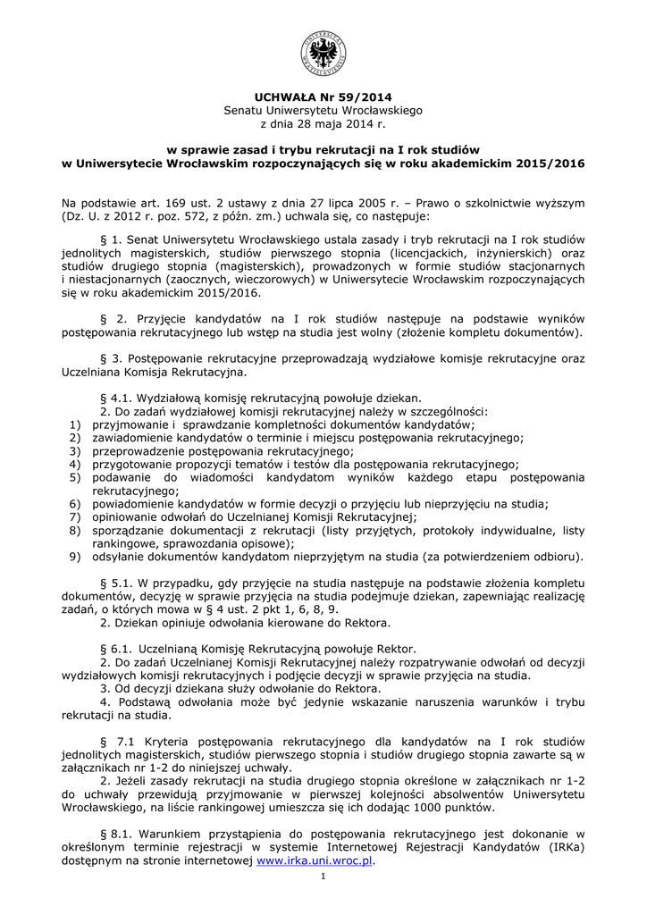 UCHWAŁA Nr 59/2014 Senatu Uniwersytetu Wrocławskiego z dnia 28 maja 2014 r. w sprawie zasad i trybu rekrutacji na I rok studiów w Uniwersytecie Wrocławskim rozpoczynających się w roku akademickim 2015/2016 Na podstawie art. 169 ust. 2 ustawy z dnia 27 lipca 2005 r. – Prawo o szkolnictwie wyższym (Dz. U. z 2012 r. poz. 572, z późn. zm.) uchwala się, co następuje: § 1. Senat Uniwersytetu Wrocławskiego ustala zasady i tryb rekrutacji na I rok studiów jednolitych magisterskich, studiów pierwszego stopnia (licencjackich, inżynierskich) oraz studiów drugiego stopnia (magisterskich), prowadzonych w formie studiów stacjonarnych i niestacjonarnych (zaocznych, wieczorowych) w Uniwersytecie Wrocławskim rozpoczynających się w roku akademickim 2015/2016. § 2. Przyjęcie kandydatów na I rok studiów następuje na podstawie wyników postępowania rekrutacyjnego lub wstęp na studia jest wolny (złożenie kompletu dokumentów). § 3. Postępowanie rekrutacyjne przeprowadzają wydziałowe komisje rekrutacyjne oraz Uczelniana Komisja Rekrutacyjna. 1) 2) 3) 4) 5) 6) 7) 8) 9) § 4.1. Wydziałową komisję rekrutacyjną powołuje dziekan. 2. Do zadań wydziałowej komisji rekrutacyjnej należy w szczególności: przyjmowanie i sprawdzanie kompletności dokumentów kandydatów; zawiadomienie kandydatów o terminie i miejscu postępowania rekrutacyjnego; przeprowadzenie postępowania rekrutacyjnego; przygotowanie propozycji tematów i testów dla postępowania rekrutacyjnego; podawanie do wiadomości kandydatom wyników każdego etapu postępowania rekrutacyjnego; powiadomienie kandydatów w formie decyzji o przyjęciu lub nieprzyjęciu na studia; opiniowanie odwołań do Uczelnianej Komisji Rekrutacyjnej; sporządzanie dokumentacji z rekrutacji (listy przyjętych, protokoły indywidualne, listy rankingowe, sprawozdania opisowe); odsyłanie dokumentów kandydatom nieprzyjętym na studia (za potwierdzeniem odbioru). § 5.1. W przypadku, gdy przyjęcie na studia następuje na podstawie złożenia kompletu dokumentów, decyzję w sprawie przyjęcia na studia podejmuje dziekan, zapewniając realizację zadań, o których mowa w § 4 ust. 2 pkt 1, 6, 8, 9. 2. Dziekan opiniuje odwołania kierowane do Rektora. § 6.1. Uczelnianą Komisję Rekrutacyjną powołuje Rektor. 2. Do zadań Uczelnianej Komisji Rekrutacyjnej należy rozpatrywanie odwołań od decyzji wydziałowych komisji rekrutacyjnych i podjęcie decyzji w sprawie przyjęcia na studia. 3. Od decyzji dziekana służy odwołanie do Rektora. 4. Podstawą odwołania może być jedynie wskazanie naruszenia warunków i trybu rekrutacji na studia. § 7.1 Kryteria postępowania rekrutacyjnego dla kandydatów na I rok studiów jednolitych magisterskich, studiów pierwszego stopnia i studiów drugiego stopnia zawarte są w załącznikach nr 1-2 do niniejszej uchwały. 2. Jeżeli zasady rekrutacji na studia drugiego stopnia określone w załącznikach nr 1-2 do uchwały przewidują przyjmowanie w pierwszej kolejności absolwentów Uniwersytetu Wrocławskiego, na liście rankingowej umieszcza się ich dodając 1000 punktów. § 8.1. Warunkiem przystąpienia do postępowania rekrutacyjnego jest dokonanie w określonym terminie rejestracji w systemie Internetowej Rejestracji Kandydatów (IRKa) dostępnym na stronie internetowej www.irka.uni.wroc.pl. 1 2. Procedury rejestracji w systemie IRKa oraz organizacja procesu rekrutacji na I rok studiów zostaną określone zarządzeniem Rektora do końca marca 2015 r. § 9.1. Szczegółowe zasady przyjmowania laureatów i finalistów olimpiad stopnia centralnego oraz laureatów konkursów ogólnopolskich na studia w Uniwersytecie Wrocławskim, w tym wykaz olimpiad i konkursów ogólnopolskich, określa odrębna uchwała Senatu Uniwersytetu Wrocławskiego. § 10.1. Kandydaci posiadający dyplom IB przyjmowani są na studia w ramach postępowania rekrutacyjnego dla kandydatów legitymujących się tzw. „nową maturą”. 2. Dla potrzeb rankingu kandydaci, o których mowa w ust. 1, otrzymują punkty rekrutacyjne w liczbie równej maksymalnej ilości punktów przewidzianych w rekrutacji na dany kierunek studiów (N) pomnożonej przez względną liczbę punktów uzyskanych na dyplomie IB i podzielonej przez 45. Punkty rekrutacyjne = (N x liczba punktów na dyplomie IB)/45. § 11.1. Kandydaci cudzoziemcy, którzy mają prawo do podejmowania i odbywania studiów na zasadach obowiązujących obywateli polskich oraz obywatele polscy legitymujący się świadectwem maturalnym lub dyplomem studiów wyższych uzyskanym w Polsce, mogą ubiegać się o przyjęcie na I rok studiów w Uniwersytecie Wrocławskim według kryteriów postępowania rekrutacyjnego zawartych w załącznikach nr 1-2 do uchwały. 2. Kandydaci legitymujący się świadectwem maturalnym lub dyplomem studiów wyższych uzyskanym poza granicami Polski, mogą ubiegać się o przyjęcie na I rok studiów w Uniwersytecie Wrocławskim według kryteriów postępowania rekrutacyjnego zawartych w odrębnej uchwale Senatu Uniwersytetu Wrocławskiego. § 12. Kandydat, który zdał maturę dwujęzyczną z języka obcego otrzymuje w celu obliczenia punktów rekrutacyjnych maksymalną liczbę punktów za poziom podstawowy z języka obcego (100%), pomnożoną przez odpowiedni współczynnik określony w zasadach rekrutacji. Wynik egzaminu z języka obcego zdanego na poziomie dwujęzycznym jest przeliczany na wynik egzaminu z języka obcego na poziomie rozszerzonym przez pomnożenie przez 4/3 i zaokrąglenie do pełnego procenta, a następnie mnożony przez odpowiedni współczynnik określony w zasadach rekrutacji. § 13. Kandydatowi kwestionującemu ocenę pracy pisemnej umożliwia się wgląd do pracy w terminie 7 dni od dnia ogłoszenia wyników. § 14. Osoba przyjęta na studia otrzymuje pisemną decyzję o przyjęciu na studia po ogłoszeniu ostatecznych wyników postępowania rekrutacyjnego. § 15. Osoba przyjęta na studia, która nie została immatrykul