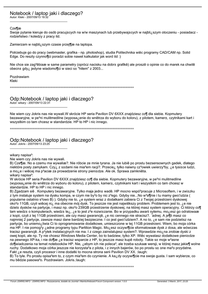 Notebook / laptop jaki i dlaczego? Autor: Kleki - 2007/09/13 19:32 _____________________________________ Cze¶æ Swoje pytanie kieruje do osób pracuj±cych na w/w maszynach lub przebywaj±cych w najbli¿szym otoczeniu - posiadacz rodzeñstwo / koledzy z pracy itd. Zamierzam w najbli¿szym czasie przej¶æ na laptopa. Potrzebuje go do pracy (webmaster, grafika - np. photoshop), studia Politechnika wiêc programy CAD/CAM np. Solid Edge. Do reszty czynno¶ci poradzi sobie nawet kalkulator jak word itd :) Nie chce sie zag³êbiaæ w same parametry (oprócz nacisku na dobr± grafikê) ale proszê o opinie co do marek na chwilê obecn± gdy¿ jedyne wiadomo¶ci w sieci s± "hitem" z 2003... Pozdrawiam Kleki ============================================================================ Odp:Notebook / laptop jaki i dlaczego? Autor: wikary - 2007/09/13 22:31 _____________________________________ Nie wiem czy Jokris nas nie wywali.W skrócie HP seria Pavilion DV 6XXX znajdziesz co¶ dla siebie. Kopmutery bezawaryjne, w pe³ni mulitmedilne (wyposa¿enie do wnêtrza do wyboru do koloru), z pilotem, kamer±, czytnikami kart i wszystkim co tam chcesz w standardzie. HP to HP i nic innego. ============================================================================ Odp:Notebook / laptop jaki i dlaczego? Autor: Jokris - 2007/09/13 23:25 _____________________________________ wikary napisa³: Nie wiem czy Jokris nas nie wywali. B) Cze¶æ. No a czemu ma wywaliæ?. Nie róbcie ze mnie tyrana. Ja nie lubiê po prostu bezsensownych gadek, dlatego niektóre posty zamykam. Czy¿ z s±dami nie mia³em racji?. Przecie¿ tylko naiwny cz³owiek uwierzy³by, ¿e tysi±ce ludzi, a mo¿e i wiêcej ma p³aciæ za prowadzenie strony pieni±dze. Ale ok. Sprawa zamkniêta. wikary napisa³: W skrócie HP seria Pavilion DV 6XXX znajdziesz co¶ dla siebie. Kopmutery bezawaryjne, w pe³ni mulitmedilne (wyposa¿enie do wnêtrza do wyboru do koloru), z pilotem, kamer±, czytnikami kart i wszystkim co tam chcesz w standardzie. HP to HP i nic innego. B) Zgadzam siê . Komputery bezawaryjne. Tylko maja jedn± wadê. HP mocno wspó³pracuje z Microsoftem, i w zwi±zku z tym instaluje system na dysku kompa, w czym nie by³o by nic z³ego. Gdyby nie...No w³a¶nie i tu mamy gwo¼dzia ( popularne ostatnio s³owo B) ). Gdyby nie to, ¿e system wraz z dodatkami zabiera Ci z Twojej przestrzeni dyskowej oko³o 11GB, czyli wiêcej ni¿ ma obecnie mój dysk. To jeszcze nie jest najwiêkszy problem. Problemem jest to, ¿e nie dziel± dysków na partycje, i masz np. oko³o 239GB przestrzenie dyskowej, na której masz system operacyjny. Ci którzy co¶ tam wiedz± o komputerach, wiedz± te¿, ¿e to jest z³e rozwi±zanie. Bo w przypadku awarii sytemu, mo¿esz go odratowaæ z kopii, czyli z tej 11GB przestrzeni, ale czy masz gwarancjê, ¿e nic cennego nie stracisz?. ¯adnej. A je¶li masz co najmniej 2 partycje, zawsze masz dane bardziej bezpieczne. I co jest gwo¼dziem?. A no to, ¿e sam nie podzielisz na partycje, bo uniemo¿liwia Ci to oprogramowanie dodatkowe, umieszczone w tej 11GB przestrzeni. Wiem, bo moja córka ma HP. I nie pomog³y ¿adne programy typu Partition Magic. Mo¿esz oczywi¶cie sformatowaæ dysk z dosa, ale wówczas tracisz gwarancjê. A p³ytek instalacyjnych nie ma. I z czego zainstalujesz system?. Wprawdzie mo¿na zrobiæ dyski z owej kopii, ale np. Ty nie chcesz Windows Media Center, bo to badziew, tylko XP. Wiêc wywalasz dodatkowe pieni±dze na pewnego XP-ka, i nie do¶æ ¿e tracisz wsparcie z HP, to jeszcze masz kupê roboty. Takie s± moje w³asne do¶wiadczenia na temat notebooków HP. Nie, ¿ebym ich nie poleca³, ale trzeba szukaæ wersji, w której masz jakie¶ wolne ruchy. Dodatkowo moja córka jeszcze nie korzysta³a z pilota, i z innych bajerów, bo po prostu s± one ma³o przydatne. Fakt ¿e reszta, czyli procesor i inne dodatki to mocna strona serii Pavilion DV XX. :laugh: B) To tyle. Po prostu opisa³em to, z czym mia³em do czynienie. A ka¿dy oczywi¶cie ma swoje gusta. I sam wybierze, co mu bêdzie pasowa³o. Pozdrawiam. Jokris.:laugh: ============================================================================ Forum JOKRIS.INFO - JOKRIS.INFO - Rozszerzenia, dodatki do Joomla! i Mambofireboard Forum Component version: 1.0.0 Generated: 3 March, 2017, 23:25 Odp:Notebook / laptop jaki i dlaczego? Autor: Kleki - 2007/09/14 00:12 _____________________________________ Witam ponownie dziêki za odpowiedzi, s³ysza³em o HP jako przoduj±cej firmie na chwilê obecn± w sprzeda¿y ze wzglêdu na jako¶æ produktów. Nikt jednak nie wspomnia³ s³ówkiem o k³opotach z partycjami, nie zdawa³em sobie równie¿ sprawy, ¿e podczas formata (z poziomu nie¶miertelnego DOS'a) mo¿na straciæ gwarancjê co jest dla mnie zaskoczeniem - gdy¿ jak oni sobie wyobra¿aj± pracê na tym sprzêcie przez np. 3lata?? Co s±dzicie jednak o BENQ? Wpad³a mi w oko jedna oferta i relacja cena/parametry jest dwukrotnie lepsza ni¿ w przypadku HP. Pozdrawiam Kleki ============================================================================ Odp:Notebook / laptop jaki i dlaczego? Autor: wikary - 2007/09/14 11:54 _____________________________________ Pierwsze s³yszê o jednej partycji na Pavilionach. firmowo w tych z którymi mia³em kontakt by³y 2 partycje - systemowa i recovery. Jaki problem pobawiæ siê Patrition Magic na starcie (zrodbiæ inne patrycje) i odzyskaæ system ... Recovery zajmuje u mnie 5,94 GB. Dodatkowo pierwszy raz s³yszê, ¿eby komu¶ co¶ zginê³o po wykorzystaniu opcji recovery (to ¶wietna rzecz) nie bawisz siê w stawianie systemu od podstaw jeden kilk i po sprawie. Problem wykorzystania przestrzeni jest wg. mnie drugorzêdny je¶li dyski w Pavilionach maj± min. 80 GB... ============================================================================ Odp:Notebook / laptop jaki i dlaczego? Autor: marcinprezes - 2007/09/14 19:42 _____________________________________ Przy³±cze sie do tej dyskusji gdy¿ mam 