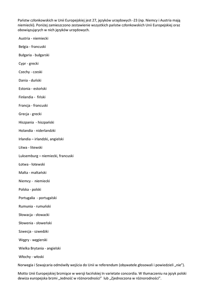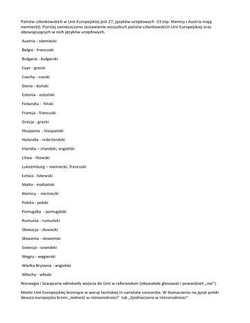 Państw członkowskich w Unii Europejskiej jest 27, języków urzędowych -23 (np. Niemcy i Austria mają niemiecki). Poniżej zamieszczono zestawienie wszystkich państw członkowskich Unii Europejskiej oraz obowiązujących w nich języków urzędowych. Austria - niemiecki Belgia - francuski Bułgaria - bułgarski Cypr - grecki Czechy - czeski Dania - duński Estonia - estoński Finlandia - fiński Francja - francuski Grecja - grecki Hiszpania - hiszpański Holandia - niderlandzki Irlandia – irlandzki, angielski Litwa - litewski Luksemburg – niemiecki, francuski Łotwa - łotewski Malta - maltański Niemcy - niemiecki Polska - polski Portugalia - portugalski Rumunia - rumuński Słowacja - słowacki Słowenia - słoweński Szwecja - szwedzki Węgry - węgierski Wielka Brytania - angielski Włochy - włoski Norwegia i Szwajcaria odmówiły wejścia do Unii w referendum (obywatele głosowali i powiedzieli „nie”). Motto Unii Europejskiej brzmiące w wersji łacińskiej In varietate concordia. W tłumaczeniu na język polski dewiza europejska brzmi „Jedność w różnorodności” lub „Zjednoczona w różnorodności”. Powierzchnia Unii: 4,325 mln km² Przewodniczący Parlamentu -Hans-Gert Pöttering Przewodniczący Komisji - José Barroso Formalnie proces rozszerzenia UE został zainaugurowany podczas posiedzenia Rady do Spraw ogólnych 30 marca 1998 r. Polska zadeklarowała wówczas datę 31 grudnia 2002 jaką datę gotowości do członkostwa w Unii Europejskiej. 1 maja 2004 r. Polska stała się pełnoprawnym członkiem Unii Europejskiej wraz z 9 innymi krajami Europy (referendum odbyło się 7-8 czerwca 2003) 1. Przesłanki integracji europejskiej po II wojnie światowej z inicjatywy jednego z ojców integracji europejskiej Roberta Schumana powstała Europejska Wspólnota Węgla i Stali (EWWiS), powstała na mocy traktatu paryskiego z 18 kwietnia 1951 roku, stała się zalążkiem przyszłej Unii Europejskiej. W skład EWWiS weszło 6 państw: Belgia, Francja, Holandia, Luksemburg, Republika Federalna Niemiec i Włochy. Celem było utrzymanie trwałego pokoju między krajami europejskimi poprzez międzynarodowe powiązanie przemysłu węglowego i stalowego, niezbędnych wówczas do prowadzenia wojny. Obok niej na mocy traktatów rzymskich z 25 marca 1957 roku utworzono Europejską Wspólnotę Gospodarczą (EWG) oraz Europejską Wspólnotę Energii Atomowej (Euratom). W ich skład weszli wszyscy członkowie EWWiS. Liczba członków Wspólnot zwiększyła się w 1973 roku, gdy przyłączyły się do nich Wielka Brytania, Dania i Irlandia, co zostało nazwane pierwszą falą przyjęć. Druga fala nastąpiła w latach 80. kiedy to do EWG przystąpiła Grecja (w 1981 r.), Hiszpania i Portugalia (w 1986 r.). Trzecia fala przyjęć (już do Unii Europejskiej) nastąpiła w 1995 roku, kiedy to przyjęto Austrię, Szwecję i Finlandię, zaś Norwegia ponownie odmówiła wstąpienia. 1 maja 2004 roku nastąpiła czwarta fala, największe w historii rozszerzenie UE, wstąpiło do wspólnoty 10 krajów, czyli Estonia, Łotwa, Litwa, Polska, Czechy, Słowacja, Węgry, Słowenia, Malta oraz Cypr. 2. Traktaty Traktat Rzymski ustanawiający Europejską Wspólnotę Gospodarczą (EWG) oraz Europejską Wspólnotę Energii Atomowej (Euratom), podpisany 25 marca 1957 r. traktat z Maastricht (Traktat o Unii Europejskiej), na mocy którego 1 listopada 1993 r. powstała Unia Europejska. Traktat nie likwidował Wspólnot Europejskich, zmienił jedynie nazwę EWG na Wspólnota Europejska. Kolejnym ważnym traktatem był też traktat amsterdamski z 1997 roku, który częściowo zmienił i jednocześnie rozszerzył wcześniejsze ustalenia z Maastricht. Pod koniec 2000 r. parafowano traktat nicejski reformujący instytucje unijne w celu zapewnienia sprawnego funkcjonowania po kolejnym rozszerzeniu UE. 3. Ojcowie zjednoczonej Europy Konrad Adenauer - pierwszy kanclerz Niemiec po wojnie, współtwórca idei zjednoczonej Europy. Jacques Lucien Delors - przewodniczący Komisji Europejskiej w latach 1985-1995. Wzmocnił jej rolę i był jednym z twórców ścisłej integracji Europy. Helmut Kohl - kanclerz Niemiec w latach 1982-98, jest uważany za ojca zjednoczenia Niemiec w 1991 r. Robert Schuman - współtwórca idei powowłania Europejskiej Wspólnoty Węgla i Stali. Minister spraw zagranicznych Francji w latach 1948-1952. Jean Monnet - jeden z "Ojców Założycieli" zjednoczonej Europy, współautor koncepcji powołania Europejskiej Wspólnoty Węgla i Stali, pierwszy przewodniczący jej organu wykonawczego - Wysokiej Władzy. Winston Churchill - premier Wielkiej Brytanii w czasie II wojny światowej. Sugerował powołanie Stanów Zjednoczonych Europy. Alcide de Gasperi - premier Włoch w latach 1945-53, współautor i realizator koncepcji integracji europejskiej, współinicjator utworzenia w 1949 r. Rady Europy i Europejskiej Wspólnoty Węgla i Stali. 4. Filary Unii Europejskiej Unia Europejska opiera się na trzech filarach: Zakres działania dwóch Wspólnot Europejskich (głównie sprawy gospodarcze, w tym Unia Gospodarczo-Walutowa). W 2002 roku wygasł zawarty na 50 lat traktat ustanawiający Europejską Wspólnotę Węgla i Stali. Obecnie obowiązujące traktaty to: Traktat ustanawiający Wspólnotę Europejską oraz Traktat ustanawiający Europejską Wspólnotę Energii Atomowej Wspólna polityka zagraniczna i bezpieczeństwa Współpraca policyjna i sądowa w sprawach karnych - do 1999 r. współpraca w zakresie wymiaru sprawiedliwości i spraw wewnętrznych. Czwarty filar w budowie polegający na wspólnej polityce obronnej. 5. Geneza i rozwój wspólnej Europy Decyzja o utworzeniu wspólnej waluty Unii Europejskiej została zapisana w traktacie z Maastricht. Znakiem graficznym euro jest grecka litera ε (epsilon) przecięta dwiema równoległymi liniami. Symbolizuje ona korzenie cywilizacji europejskiej, Banknoty euro są drukowane pod bezpośrednią kontrolą Europejskiego Banku Centralne