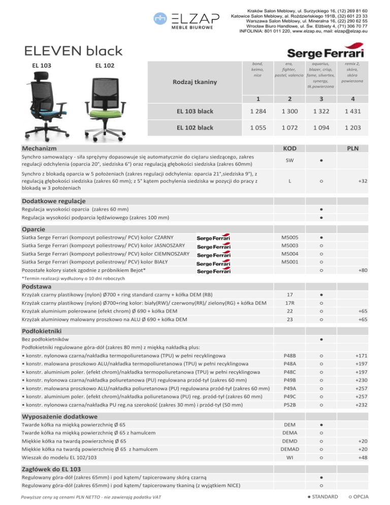 Kraków Salon Meblowy, ul. Surzyckiego 16, (12) 269 81 60 Katowice Salon Meblowy, al. Roździeńskiego 191B, (32) 601 23 33 Warszawa Salon Meblowy, ul. Mineralna 16, (22) 290 62 55 Wrocław Biuro Handlowe, ul. Św. Elżbiety 4, (71) 306 70 77 INFOLINIA: 801 011 220, www.elzap.eu, mail: [email protected] ELEVEN black EL 103 bond, keimo, nice EL 102 Rodzaj tkaniny era, aquarius, fighter, blazer, crisp, pastel, valencia fame, silvertex, synergy, tk.powierzona remix 2, skóra, skóra powierzona 1 2 3 4 EL 103 black 1 284 1 300 1 322 1 431 EL 102 black 1 055 1 072 1 094 1 203 Mechanizm Synchro samoważący ‐ siła sprężyny dopasowuje się automatycznie do ciężaru siedzącego, zakres regulacji odchylenia (oparcia 20°, siedziska 6°) oraz regulacją głębokości siedziska (zakres 60mm) Synchro z blokadą oparcia w 5 położeniach (zakres regulacji odchylenia: oparcia 21°,siedziska 9°), z regulacją głębokości siedziska (zakres 60 mm); z 5° kątem pochylenia siedziska w pozycji do pracy z blokadą w 3 położeniach KOD PLN SW ● L ○ +32 Dodatkowe regulacje Regulacja wysokości oparcia (zakres 60 mm) ● Regulacja wysokości podparcia lędźwiowego (zakres 100 mm) ● Oparcie Siatka Serge Ferrari (kompozyt poliestrowy/ PCV) kolor CZARNY M5005 ● Siatka Serge Ferrari (kompozyt poliestrowy/ PCV) kolor JASNOSZARY M5003 ○ Siatka Serge Ferrari (kompozyt poliestrowy/ PCV) kolor CIEMNOSZARY M5004 ○ Siatka Serge Ferrari (kompozyt poliestrowy/ PCV) kolor BIAŁY M5001 ○ Pozostałe kolory siatek zgodnie z próbnikiem Bejot* ○ +80 *Termin realizacji wydłużony o 10 dni roboczych Podstawa Krzyżak czarny plastikowy (nylon) Ø700 + ring standard czarny + kółka DEM (RB) 17 ● Krzyżak czarny plastikowy (nylon) Ø700+ring kolor: biały(RW)/ czerwony(RR)/ zielony(RG) + kółka DEM 17R ○ Krzyżak aluminium polerowane (efekt chrom) Ø 690 + kółka DEM 22 ○ +65 Krzyżak aluminiowy malowany proszkowo na ALU Ø 690 + kółka DEM 23 ○ +65 Podłokietniki Bez podłokietników ● Podłokietniki regulowane góra‐dół (zakres 80 mm) z miękką nakładką plus: • konstr. nylonowa czarna/nakładka termopoliuretanowa (TPU) w pełni recyklingowa P48B ○ • konstr. malowana proszkowo ALU/nakładka termopoliuretanowa (TPU) w pełni recyklingowa P48A ○ +171 +197 • konstr. aluminium poler. (efekt chrom)/nakładka termopoliuretanowa (TPU) w pełni recyklingowa P48C ○ +197 • konstr. nylonowa czarna/nakładka poliuretanowa (PU) regulowana przód‐tył (zakres 60 mm) P49B ○ +230 • konstr. malowana proszkowo ALU/nakładka poliuretanowa (PU) regulowana przód‐tył (zakres 60 mm) P49A ○ +257 • konstr. aluminium poler. (efekt chrom)/nakładka poliuretanowa (PU) reg. przód‐tył (zakres 60 mm) P49C ○ +257 • konstr. nylonowa czarna/nakładka PU reg.na szerokość (zakres 30 mm) i przód‐tył (50 mm) P52B ○ +232 DEM ● Wyposażenie dodatkowe Twarde kółka na miękką powierzchnię Ø 65 Twarde kółka na miękką powierzchnię Ø 65 z hamulcem DEMA ○ Miękkie kółka na twardą powierzchnię Ø 65 DEMD ○ Miękkie kółka na twardą powierzchnię Ø 65 z hamulcem DEMAD ○ +20 WI ○ +48 Wieszak do modelu EL 102/103 +20 Zagłówek do EL 103 Regulowany góra‐dół (zakres 65mm) i pod kątem/ tapicerowany skórą czarną ● Regulowany góra‐dół (zakres 65mm) i pod kątem/ tapicerowany tkaniną (z wyjątkiem NICE) ○ Powyższe ceny są cenami PLN NETTO ‐ nie zawierają podatku VAT ● STANDARD ○ OPCJA Kraków Salon Meblowy, ul. Surzyckiego 16, (12) 269 81 60 Katowice Salon Meblowy, al. Roździeńskiego 191B, (32) 601 23 33 Warszawa Salon Meblowy, ul. Mineralna 16, (22) 290 62 55 Wrocław Biuro Handlowe, ul. Św. Elżbiety 4, (71) 306 70 77 INFOLINIA: 801 011 220, www.elzap.eu, mail: [email protected] ELEVEN white EL 103 bond, keimo, nice EL 102 Rodzaj tkaniny era, aquarius, fighter, blazer, crisp, pastel, valencia fame, silvertex, synergy, tk.powierzona remix 2, skóra, skóra powierzona 1 2 3 4 EL 103 white 1 555 1 572 1 593 1 704 EL 102 white 1 268 1 286 1 307 1 418 Mechanizm Synchro samoważący ‐ siła sprężyny dopasowuje się automatycznie do ciężaru siedzącego, zakres regulacji odchylenia (oparcia 20°, siedziska 6°) oraz regulacją głębokości siedziska (zakres 60mm) Synchro z blokadą oparcia w 5 położeniach (zakres regulacji odchylenia: oparcia 21°,siedziska 9°), z regulacją głębokości siedziska (zakres 60 mm); z 5° kątem pochylenia siedziska w pozycji do pracy z blokadą w 3 położeniach KOD PLN SW ● L ○ +32 Dodatkowe regulacje Regulacja wysokości oparcia (zakres 60 mm) ● Regulacja wysokości podparcia lędźwiowego (zakres 100 mm) ● Oparcie Siatka Serge Ferrari (kompozyt poliestrowy/ PCV) kolor BIAŁY M5001 ● Siatka Serge Ferrari (kompozyt poliestrowy/ PCV) kolor JASNOSZARY M5003 ○ Siatka Serge Ferrari (kompozyt poliestrowy/ PCV) kolor CIEMNOSZARY M5004 ○ Siatka Serge Ferrari (kompozyt poliestrowy/ PCV) kolor CZARNY M5005 ○ Pozostałe kolory siatek zgodnie z próbnikiem Bejot* ○ +80 *Termin realizacji wydłużony o 10 dni roboczych Podstawa Krzyżak czarny plastikowy (nylon) Ø700 + ring standard czarny + kółka DEM (RB) 17 ● Krzyżak czarny plastikowy (nylon) Ø700+ring kolor: biały(RW)/ czerwony(RR)/ zielony(RG) + kółka DEM 17R ○ Krzyżak aluminium polerowane (efekt chrom) Ø 690 + kółka DEM 22 ○ +65 23W ○ +65 Krzyżak malowany proszkowo na biało* + kółka DEM * Bejot nie udziela gwarancji na uszkodzenia mechaniczne farby Podłokietniki Bez podłokietników ● Podłokietniki regulowane góra‐dół (zakres 80 mm) z miękką nakładką plus: • konstr. aluminium poler. (efekt chrom)/nakładka termopoliuretanowa (TPU) w pełni recyklingowa P48C ○ +197 • konstr.malowana proszkowo na biało/nakładka czarna termopoliuretanowa(TPU) w pełni recyklingowa P48W ○ +235 • konstr. aluminium poler. (efekt chrom)/nakładka poliuretanowa (PU) reg. przód‐tył (zakres 60 mm) P49C ○ +257 