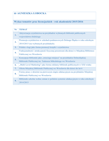 dr AGNIESZKA ŁOBOCKA Wykaz tematów prac licencjackich - rok akademicki 2015/2016 Nr 1. 2. 3. 4. 5. TEMAT Aktywizacja czytelnictwa na przykładzie wybranych bibliotek publicznych województwa łódzkiego Promocja czytelnictwa w szkołach podstawowych Dolnego Śląska w roku szkolnym 2014/2015 (na wybranych przykładach). Polskie vlogi jako forma promocji książki i czytelnictwa Funkcjonalność i atrakcyjność fizycznej przestrzeni dla dzieci w Miejskiej Bibliotece Publicznej we Wrocławiu Koncepcja biblioteki jako „trzeciego miejsca” na przykładzie Dolnośląskiej Biblioteki Publicznej im. Tadeusza Mikulskiego we Wrocławiu 6. „Multi Level Marketing” jako forma reklamy bibliotek publicznych w XXI wieku 7. Oferta Miejskiej Biblioteki Publicznej we Wrocławiu dla dzieci do lat 6 8. 9. Formy pracy z dziećmi na pierwszym etapie edukacyjnym na przykładzie Miejskiej Biblioteki Publicznej we Wrocławiu Biblioteki szkolne wobec zmian w polskim systemie edukacyjnym w roku szkolnym 2014/2015