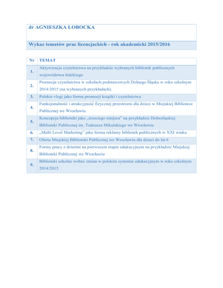 dr AGNIESZKA ŁOBOCKA Wykaz tematów prac licencjackich