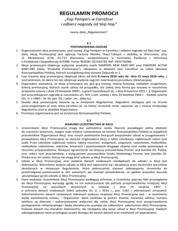 REGULAMIN PROMOCJI „Kup Pampers w Carrefour i odbierz nagrody od Skip Hop” zwany dalej „Regulaminem” 1. 2. 3. 4. 5. 6. §1 POSTANOWIENIA OGÓLNE Organizatorem akcji promocyjnej pod nazwą „Kup Pampers w Carrefour i odbierz nagrody od Skip Hop” (zw. dalej Akcją Promocyjną) jest agencja Factoria Monika Tkacz-Tokajuk z siedzibą w Warszawie, przy ul. Mickiewicza 4/18, 01-715 Warszawa, zarejestrowana w Centralnej Ewidencji i Informacji o Działalności Gospodarczej 415308, numer REGON: 052142739, NIP: 5431750286. Akcja promocyjna obejmuje wyłącznie produkty marki PAMPERS NEW BABY-DRY oraz PAMPERS ACTIVE BABY-DRY (dalej "Produkty Promocyjne"), zakupione w sklepach sieci Carrefour na całym obszarze Rzeczypospolitej Polskiej, których szczegółową listę stanowi Załącznik nr 1. Czas trwania akcji promocyjnej obejmuje okres od dnia 8 marca 2016 roku do dnia 31 maja 2016 roku, z zastrzeżeniem, że okres ten nie obejmuje wydania nagród i ewentualnej procedury reklamacyjnej. Organizator oświadcza, że akcja promocyjna nie jest grą losową, loterią fantową, zakładem wzajemnym, loterią promocyjną, których wynik zależy od przypadku, ani żadną inną formą gry losowej w rozumieniu przepisów ustawy z dnia 19 listopada 2009 r. o grach hazardowych (tj. z dnia 8 kwietnia 2015 r. ). Organizator jest przyrzekającym nagrodę w rozumieniu art. 919 i nast. ustawy z dnia 23 kwietnia 1964 r. - Kodeks cywilny (Dz. U. z 1964 r. Nr 16, poz. 93, z późn. zm., dalej kc). Zasady akcji promocyjnej zawarte są w niniejszym Regulaminie. Regulamin dostępny jest na stronie www.mojpampers.pl oraz www.carrefour.pl, na której Uczestnik może zapoznać się z treścią niniejszego Regulaminu oraz w siedzibie Organizatora. Promocja organizowana jest na terytorium Rzeczpospolitej Polskiej. §2 WARUNKI UCZESTNICTWA W AKCJI 1. Uczestnikami Akcji Promocyjnej mogą być pełnoletnie osoby fizyczne posiadające pełną zdolność do czynności prawnych, mające stałe miejsce zamieszkania na terenie Rzeczpospolitej Polskiej za wyjątkiem pracowników Organizatora Akcji, oraz innych podmiotów biorących bezpośredni udział w przygotowaniu i prowadzeniu Akcji Promocyjnej na zlecenie Organizatora Akcji, a także członkowie najbliższych rodzin tych osób. Przez członków najbliższej rodziny należy rozumieć: wstępnych, zstępnych, rodzeństwo, małżonków, małżonków rodzeństwa, rodziców, krewnych i powinowatych drugiego stopnia oraz osoby pozostające w stosunku przysposobienia. Niniejsze ograniczenie nie dotyczy pracowników Procter and Gamble DS. Polska. oraz rodzin tych pracowników, z wyłączeniem pracowników Działu Marketingu Procter and Gamble DS. Polska oraz ich rodzin, którzy nie mogą brać udziału w Akcji Promocyjnej. 2. Udział w Akcji Promocyjnej oraz podanie danych osobowych niezbędnych do udziału w Akcji jest dobrowolny. Warunkiem wzięcia udziału w Akcji jest zapoznanie się i akceptacja przez Uczestnika warunków określonych w niniejszym Regulaminie, które jednocześnie stanowi zobowiązanie Uczestnika do przestrzegania postanowień w nim zawartych, jak również potwierdzenie, że spełnia wszystkie warunki uprawniające go do udziału w Akcji Promocyjnej. 3. Dane osobowe Uczestników Akcji Promocyjnej podlegają ochronie, a Uczestnicy poprzez fakt przystąpienia do Akcji Promocyjnej wyrażają zgodę na ich wykorzystanie dla potrzeb przeprowadzenia niniejszej Akcji Promocyjnej na warunkach określonych w ustawie z dnia 29 sierpnia 1997 r. o ochronie danych osobowych (tekst jednolity Dz. U. z 2014 r., poz. 1182 z późniejszymi zmianami). Administratorem danych osobowych zebranych podczas niniejszej Akcji Promocyjnej jest – w rozumieniu wyżej wymienionej ustawy – Organizator. Dane osobowe w postaci imienia, nazwiska, adresu, numeru telefonu są zbierane i wykorzystywane wyłącznie dla celów Akcji Promocyjnej oraz przeprowadzenia postępowania reklamacyjnego i będą niezwłocznie usunięte po całkowitym zakończeniu Akcji Promocyjnej. Podanie danych ma charakter dobrowolny, ale niezbędny aby wziąć udział w Akcji Promocyjnej. Osobom udostępniającym dane przysługuje prawo dostępu do swoich danych oraz możliwość ich poprawiania. 4. Uczestnik Akcji Promocyjnej może wyrazić zgodę na przetwarzanie danych dla celów marketingowych, jak również na otrzymywanie informacji handlowej na temat produktów i usług Organizatora drogą elektroniczną, w szczególności na podany adres e-mail, zgodnie z ustawą z dnia 18 lipca 2002 r. o świadczeniu usług drogą elektroniczną (Dz. U. nr 144 z 2002 r. poz. 1204 z późn. zm.). 4. Dane osobowe przetwarzane będą zgodnie z ustawą z dnia 29 sierpnia 1997 roku o ochronie danych osobowych (tekst jedn. Dz. U. z 2002, Nr 101, poz. 926 z późn. zm.). 1. 2. 3. 4. 5. §3 NAGRODY W Akcji Promocyjnej zostanie przyznanych łącznie 3000 nagród (dalej: „Pula Nagród), która zostanie podzielona na poszczególne etapy trwania Akcji Promocyjnej w następujący sposób: a) I etap: zakup i zgłoszenie dokonane od dnia 08 marca 2016 r. do dnia 31 marca 2016 r. - miseczka obiadowa z wybranych kolekcji Zoo firmy Skip Hop w łącznej ilości 1000 sztuk; b) II etap: zakup i zgłoszenie dokonane od dnia 01 kwietnia 2016 r. do dnia 30 kwietnia 2016 r. - zestaw sztućców z wybranych kolekcji Zoo firmy Skip Hop w łącznej ilości 1000 sztuk; c) III etap: zakup i zgłoszenie dokonane od dnia 01 maja 2016 r. do dnia 31 maja 2016 r. - bidon z wybranych kolekcji Zoo firmy Skip Hop w łącznej ilości 1000 sztuk. Łączna wartość rynkowa Nagród wymienionych w pkt. 1 wynosi 75 040,00 polskich złotych brutto (słownie: Siedemdziesiąt pięć tysięcy, czterdzieści złotych i 00/100 groszy) + podatek od nagród w kwocie łącznie 8 337,77 polskich złotych brutto (słownie: osiem tysięcy trzysta trzydzieści siedem złotych i 77/100 groszy). Uczestnik nie może żądać zamiany nagrody na ekwiwalent pieniężny, ani na ż