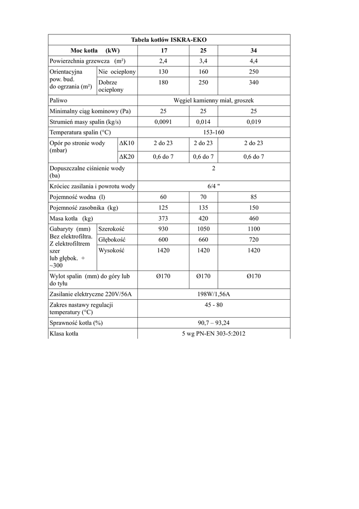 Tabela kotłów ISKRA-EKO Moc kotła (kW) 17 25 34 Powierzchnia