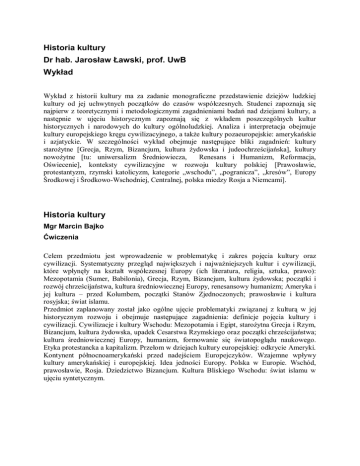 Historia kultury Dr hab. Jarosław Ławski, prof. UwB Wykład Wykład z historii kultury ma za zadanie monograficzne przedstawienie dziejów ludzkiej kultury od jej uchwytnych początków do czasów współczesnych. Studenci zapoznają się najpierw z teoretycznymi i metodologicznymi zagadnieniami badań nad dziejami kultury, a następnie w ujęciu historycznym zapoznają się z wkładem poszczególnych kultur historycznych i narodowych do kultury ogólnoludzkiej. Analiza i interpretacja obejmuje kultury europejskiego kręgu cywilizacyjnego, a także kultury pozaeuropejskie: amerykańskie i azjatyckie. W szczególności wykład obejmuje następujące bliki zagadnień: kultury starożytne [Grecja, Rzym, Bizancjum, kultura żydowska i judeochrześcijańska], kultury nowożytne [tu: uniwersalizm Średniowiecza, Renesans i Humanizm, Reformacja, Oświecenie], konteksty cywilizacyjne w rozwoju kultury polskiej [Prawosławie, protestantyzm, rzymski katolicyzm, kategorie „wschodu”, „pogranicza”, „kresów”, Europy Środkowej i Środkowo-Wschodniej, Centralnej, polska miedzy Rosja a Niemcami]. Historia kultury Mgr Marcin Bajko Ćwiczenia Celem przedmiotu jest wprowadzenie w problematykę i zakres pojęcia kultury oraz cywilizacji. Systematyczny przegląd największych i najważniejszych kultur i cywilizacji, które wpłynęły na kształt współczesnej Europy (ich literatura, religia, sztuka, prawo): Mezopotamia (Sumer, Babilonia), Grecja, Rzym, Bizancjum, kultura żydowska; początki i rozwój chrześcijaństwa, kultura średniowiecznej Europy, renesansowy humanizm; Ameryka i jej kultura – przed Kolumbem, początki Stanów Zjednoczonych; prawosławie i kultura rosyjska; świat islamu. Przedmiot zaplanowany został jako ogólne ujęcie problematyki związanej z kulturą w jej historycznym rozwoju i obejmuje następujące zagadnienia: definicje pojęcia kultury i cywilizacji. Cywilizacje i kultury Wschodu: Mezopotamia i Egipt, starożytna Grecja i Rzym, Bizancjum, kultura żydowska, upadek Cesarstwa Rzymskiego oraz początki chrześcijaństwa; kultura średniowiecznej Europy, humanizm, formowanie się światopoglądu naukowego. Etyka protestancka a kapitalizm. Przełom w dziejach kultury europejskiej: odkrycie Ameryki. Kontynent północnoamerykański przed nadejściem Europejczyków. Wzajemne wpływy kultury amerykańskiej i europejskiej. Idea jedności Europy. Polska w Europie. Wschód, prawosławie, Rosja. Dziedzictwo Bizancjum. Kultura Bliskiego Wschodu: świat islamu w ujęciu syntetycznym.
