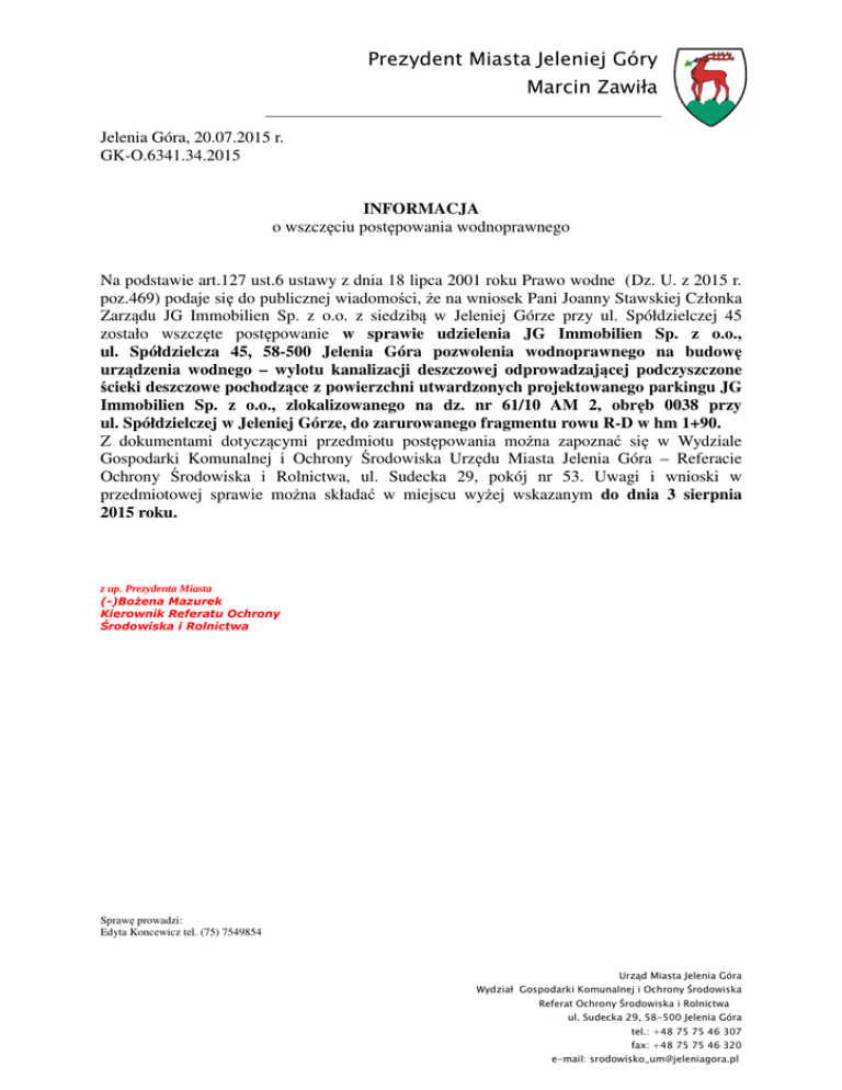 Prezydent Miasta Jeleniej Góry Marcin Zawiła Jelenia Góra, 20.07.2015 r. GK-O.6341.34.2015 INFORMACJA o wszczęciu postępowania wodnoprawnego Na podstawie art.127 ust.6 ustawy z dnia 18 lipca 2001 roku Prawo wodne (Dz. U. z 2015 r. poz.469) podaje się do publicznej wiadomości, że na wniosek Pani Joanny Stawskiej Członka Zarządu JG Immobilien Sp. z o.o. z siedzibą w Jeleniej Górze przy ul. Spółdzielczej 45 zostało wszczęte postępowanie w sprawie udzielenia JG Immobilien Sp. z o.o., ul. Spółdzielcza 45, 58-500 Jelenia Góra pozwolenia wodnoprawnego na budowę urządzenia wodnego – wylotu kanalizacji deszczowej odprowadzającej podczyszczone ścieki deszczowe pochodzące z powierzchni utwardzonych projektowanego parkingu JG Immobilien Sp. z o.o., zlokalizowanego na dz. nr 61/10 AM 2, obręb 0038 przy ul. Spółdzielczej w Jeleniej Górze, do zarurowanego fragmentu rowu R-D w hm 1+90. Z dokumentami dotyczącymi przedmiotu postępowania można zapoznać się w Wydziale Gospodarki Komunalnej i Ochrony Środowiska Urzędu Miasta Jelenia Góra – Referacie Ochrony Środowiska i Rolnictwa, ul. Sudecka 29, pokój nr 53. Uwagi i wnioski w przedmiotowej sprawie można składać w miejscu wyżej wskazanym do dnia 3 sierpnia 2015 roku. z up. Prezydenta Miasta (-)Bożena Mazurek Kierownik Referatu Ochrony Środowiska i Rolnictwa Sprawę prowadzi: Edyta Koncewicz tel. (75) 7549854 Urząd Miasta Jelenia Góra Wydział Gospodarki Komunalnej i Ochrony Środowiska Referat Ochrony Środowiska i Rolnictwa ul. Sudecka 29, 58-500 Jelenia Góra tel.: +48 75 75 46 307 fax: +48 75 75 46 320 e-mail: [email protected]