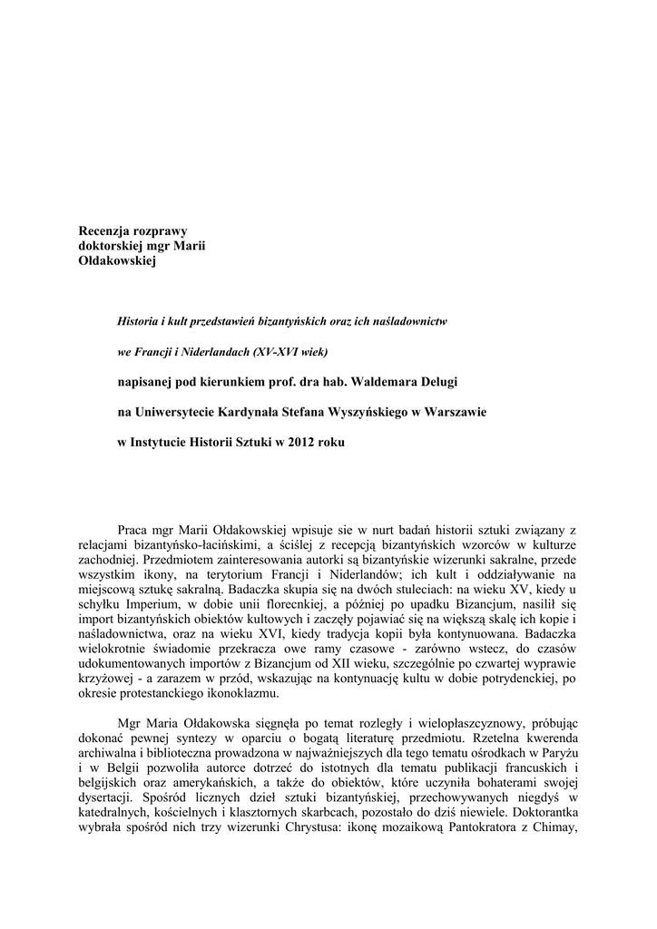 Recenzja rozprawy doktorskiej mgr Marii Ołdakowskiej Historia i kult przedstawień bizantyńskich oraz ich naśladownictw we Francji i Niderlandach (XV-XVI wiek) napisanej pod kierunkiem prof. dra hab. Waldemara Delugi na Uniwersytecie Kardynała Stefana Wyszyńskiego w Warszawie w Instytucie Historii Sztuki w 2012 roku Praca mgr Marii Ołdakowskiej wpisuje sie w nurt badań historii sztuki związany z relacjami bizantyńsko-łacińskimi, a ściślej z recepcją bizantyńskich wzorców w kulturze zachodniej. Przedmiotem zainteresowania autorki są bizantyńskie wizerunki sakralne, przede wszystkim ikony, na terytorium Francji i Niderlandów; ich kult i oddziaływanie na miejscową sztukę sakralną. Badaczka skupia się na dwóch stuleciach: na wieku XV, kiedy u schyłku Imperium, w dobie unii florecnkiej, a później po upadku Bizancjum, nasilił się import bizantyńskich obiektów kultowych i zaczęły pojawiać się na większą skalę ich kopie i naśladownictwa, oraz na wieku XVI, kiedy tradycja kopii była kontynuowana. Badaczka wielokrotnie świadomie przekracza owe ramy czasowe - zarówno wstecz, do czasów udokumentowanych importów z Bizancjum od XII wieku, szczególnie po czwartej wyprawie krzyżowej - a zarazem w przód, wskazując na kontynuację kultu w dobie potrydenckiej, po okresie protestanckiego ikonoklazmu. Mgr Maria Ołdakowska sięgnęła po temat rozległy i wielopłaszcyznowy, próbując dokonać pewnej syntezy w oparciu o bogatą literaturę przedmiotu. Rzetelna kwerenda archiwalna i biblioteczna prowadzona w najważniejszych dla tego tematu ośrodkach w Paryżu i w Belgii pozwoliła autorce dotrzeć do istotnych dla tematu publikacji francuskich i belgijskich oraz amerykańskich, a także do obiektów, które uczyniła bohaterami swojej dysertacji. Spośród licznych dzieł sztuki bizantyńskiej, przechowywanych niegdyś w katedralnych, kościelnych i klasztornych skarbcach, pozostało do dziś niewiele. Doktorantka wybrała spośród nich trzy wizerunki Chrystusa: ikonę mozaikową Pantokratora z Chimay, Mandylion z Laon i zrabowany w 1970 roku Mandylion z Corbie oraz trzy wizerunki Matki Bożej: Hodegetrię z Liège, Eleusę z Cambrai i Hagiosoritissę z Mechelen. Reprezentują one najbardziej rozpowszechnione w tradycji bizantyńskiej typy ikonograficzne, co stało się okazją do omówienia ich formy, teologii, genezy, historycznego rozwoju oraz oddziaływania na późnogotyckie malarstwo niderlandzkie i francuskie. Niektóre z tych obiektów, jak Mandylion z Laon i ikona Notre Dame de Grâce z Cambrai otaczane są wielowiekowym kultem i posiadają bardzo bogatą literaturę, a także - jak w przypadku ikony z Cambrais liczne malarskie kopie i parafrazy. Inne wizerunki, jak ikona Pantokratora z Chimay oraz Hodegetria z Liège, nie posiadające udokumentowanych śladów szerszego kultu, zostały potraktowane jako pars pro toto, stając się okazją do omówienia reprezentowanych przez siebie typów ikonograficznych i ich funkcjonowania w badanej czasoprzestrzeni. Wśród wybranych wizerunków znalazł się także obiekt kultowo i artystycznie ważny, ale w literaturze naukowej prawie nieobecny - Hagiosoritissa z Mechelen. Z tematem pracy ściśle wiąże sie pojęcie kopii i naśladownictwa w sztuce bizantyńskiej, italo-bizantyńskiej oraz późnogotyckiej, zwłaszcza niderlandzkiej. Autorka, świadoma złożoności tego zagadnienia, prezentuje go w oparciu o najważniejszą literaturę przedmiotu, również polską (B. Dąb-Kalinowska, A. Różycka-Bryzek); wspomnianymi terminami posługuje się z wyczuciem, unikając uproszczeń. Nota bene korzenie zjawiska kopii i naśladownictwa tkwią w świecie antycznym, w praktyce masowego kopiowania rzeźb greckich przez Rzymian. Już wtedy możemy zaobserwować złożony stosunek do helleńskiego wzorca, uzależniony od jego rangi artystycznej i kultowej, od intencji zleceniodawcy, a także od inwencji i możliwości artystycznych rzymskiego kopisty. Struktura pracy jest czytelna, choć nie do końca konsekwentna. Po wstępie i prezentacji stanu badań w rozdziale pierwszym autorka szkicuje historię kontaktów bizantyńsko-łacińskich w średniowieczu. Czyni to sub specie iconographica, akcentując czynniki sprzyjające przenikaniu bizantyńskich dzieł sztuki na Zachód, a mianowicie kontakty dyplomatyczne, wyprawy krzyżowe (szczególnie czwartą) oraz małżeństwa mieszane łacińsko-bizantyńskie. W tej ostatniej kwestii znalazło się parę nieścisłości. Małżeństwa Małgorzaty Węgierskiej z Bonifacym z Montferrat (s. 45) oraz Manuela II Paleologa z księżniczką serbską Heleną Dragases (s. 47) nie były „mieszane" ani w znaczeniu kulturowym ani wyznaniowym. Struktura pozostałych rozdziałów odzwierciedla tematykę i rangę kultową analizowanych obiektów: trzy przedstawienia Chrystusa zostały omówione łącznie w rozdziale II, natomiast trzem wizerunkom maryjnym poświęcono trzy osobne rozdziały: IV, V i VI. Dysproporcja jest uzasadniona, wynika bowiem ze zdecydowanej przewagi kultu wizerunków maryjnych i związanych z nim malarskich kopii i parafraz na omawianym obszarze, co z kolei jest echem pobożności bizantyńskiej. Omówienie wizerunków maryjnych zostało poprzedzone rozdziałem III, w którym autorka przypomina teologiczne podstawy i historię dogmatu Theotokos oraz kultu Matki Boskiej Pośredniczki. Taki zabieg jest całkowicie uzasadniony, bowiem ikona, podobnie jak zachodni wizerunek kultowy, jest fenomenem teologiczno-artystycznym, z czego doktorantka doskonale zdaje sobie sprawę. Tym bardziej dziwi brak analogicznego rozdziału poprzedzającego omówienie wizerunków Chrystusa, w którym zostałyby przypomniane teologiczne podstawy ikony Zbawiciela, a tym samym fundament całego malarstwa ikonowego, kształtowany wraz z dogatem chrystologicznym, począwszy od soboru nicejskiego I, przez sobór chalcedoński aż po sobór nicejski II. Tym kluczowym zagadnieniom autorka p