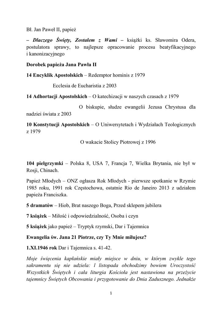 Bł. Jan Paweł II, papież – Dlaczego Święty, Zostałem z Wami – książki ks. Sławomira Odera, postulatora sprawy, to najlepsze opracowanie procesu beatyfikacyjnego i kanonizacyjnego Dorobek papieża Jana Pawła II 14 Encyklik Apostolskich – Redemptor hominis z 1979 Ecclesia de Eucharistia z 2003 14 Adhortacji Apostolskich – O katechizacji w naszych czasach z 1979 O biskupie, słudze ewangelii Jezusa Chrystusa dla nadziei świata z 2003 10 Konstytucji Apostolskich – O Uniwersytetach i Wydziałach Teologicznych z 1979 O wakacie Stolicy Piotrowej z 1996 104 pielgrzymki – Polska 8, USA 7, Francja 7, Wielka Brytania, nie był w Rosji, Chinach. Papież Młodych – ONZ ogłasza Rok Młodych - pierwsze spotkanie w Rzymie 1985 roku, 1991 rok Częstochowa, ostatnie Rio de Janeiro 2013 z udziałem papieża Franciszka. 5 dramatów – Hiob, Brat naszego Boga, Przed sklepem jubilera 7 książek – Miłość i odpowiedzialność, Osoba i czyn 5 książek jako papież – Tryptyk rzymski, Dar i Tajemnica Ewangelia św. Jana 21 Piotrze, czy Ty Mnie miłujesz? 1.XI.1946 rok Dar i Tajemnica s. 41-42. Moje święcenia kapłańskie miały miejsce w dniu, w którym zwykle tego sakramentu się nie udziela: l listopada obchodzimy bowiem Uroczystość Wszystkich Świętych i cała liturgia Kościoła jest nastawiona na przeżycie tajemnicy Świętych Obcowania i przygotowanie do Dnia Zadusznego. Jednakże 1 Książę Metropolita wybrał ten dzień ze względu na to, że miałem wkrótce wyjechać do Rzymu na dalsze studia. Przyjmowałem święcenia sam, w prywatnej kaplicy Biskupów Krakowskich. Moi koledzy mieli otrzymać święcenia dopiero następnego roku w Niedzielę Palmową. 28.IX. 1958 Wawel konsekratorzy:abp Eugeniusz Baziak, bp Franciszek Jop, abp Bolesław Kominek, prof. Adam Vetulani UJ: To zaczęło się latem 1958 roku. Do furty domu sióstr zakonnych zapukał pod wieczór nieznany człowiek, ubrany po księżemu, więc ksiądz „ czy mógłbym wejść do waszej kaplicy, żeby się pomodlić”. Wprowadzono go do kaplicy i zostawiono samego. Gdy przez dłuższy czas nie wychodził, zajrzano do kaplicy. Leżał krzyżem na podłodze. Siostra cofnęła się z lękiem, pełnym szacunku. Pomyślała „ pewnie ma ważną sprawę, może pokutnik”. Po jakimś czasie, siostra ponownie zajrzała do kaplicy. Ksiądz ciągle leżał krzyżem. A pora była późna. Siostra podeszła do leżącego i zapytała nieśmiało: „może ksiądz był łaskaw przyjść na kolację”. Nieznany człowiek odezwał się: „mam pociąg do Krakowa dopiero po północy. Pozwólcie mi tu pobyć. Mam dużo do pomówienia z Panem Bogiem. Nie przeszkadzajcie mi”. 16.X.1978 – kaplica Sykstyńska – Krakowskie Błonia „ Barka- Wyrok konklawe”.18. sierpnia 2002 roku. Chciałem powiedzieć, na zakończenie, że właśnie ta oazowa pieśń, prowadziła mnie z Ojczyzny przed 23 laty. Miałem ją w uszach, kiedy słyszałem wyrok konklawe, i z nią, z tą oazową pieśnią nie rozstawałem się przez te wszystkie laty. Była jakimś ukrytym tchnieniem Ojczyzny, była też przewodniczką na różnych drogach Kościoła i ona przyprowadzała mnie wielokrotnie tu - na krakowskie Błonia, pod Kopiec Kościuszki. Dziękuję ci, pieśni oazowa. Cnoty Wiara, nadzieja, miłość- droga krzyżowa w piątek, nabożeństwo majowe, różaniec w październiku, godzinki o NPM w sobotę, cotygodniowa spowiedź. Miłość bliźniego - cotygodniowe audiencje, spotykanie się z prostymi ludźmi, powołanie Domu Samotnej Matki w Krakowie 2 Męstwo – choroba Parkinsona, inwalidzki wózek, odebranie głosu. Znałem go od młodych lat, najbliżej Pana Boga był w czasie swojego cierpienia w ostatnich latach życia. Pokuta - cotygodniowa spowiedź, posty, leżenie krzyżem Modlitwa - bp Albin Małysiak, powrót z konferencji w Warszawie, Msza na Błoniach Kult świętych - abp Mieczysław Mokrzycki – pokój z relikwiami Ubóstwo - koszula papieska, spodnie papieża ks. Tadeusz Pieronek Bł. Jan XXIII Życie Urodził się w Sotto il Monte (obecnie Sotto il Monte Giovanni XXIII– nazwane na cześć papieża), w prowincji Bergamo we Włoszech 25 listopada 1881 roku. Rodzice byli biednymi rolnikam. Ojciec, Giovanni Battista Roncalli, był dzierżawcą. Dopiero w latach późniejszych udało mu się wykupić dom rodzinny oraz fragment pola. Matka Marianna Giulia Mazzola, była gospodynią domową. Angelo Roncalli ukończył trzyklasową wiejską szkołę powszechną. Od 8 roku życia uczył się łaciny u miejscowego proboszcza. W 1891 r. dzięki protekcji proboszcza dostał się do gimnazjum w odległym o 7 km od rodzinnej wioski miasteczku Celana, w którym naukę musiał jednak przerwać już po roku. W październiku 1893 r. rozpoczął naukę w Niższym Seminarium Duchownym w Bergamo. Było to możliwie dzięki pomocy finansowej proboszcza, ponieważ na opłacanie czesnego rodzina nie mogła sobie pozwolić. Tu szybko nadrobił braki i stał się jednym z najlepszych seminarzystów. Ukończył gimnazjum, liceum, a mając 19 lat był już na trzecim roku teologii. W 1901 r. został przeniesiony do seminarium papieskiego św. Apolinarego w Rzymie Dnia 10 sierpnia otrzymał święcenia kapłańskie w kościele Santa Maria In Monte Santo na Piazza del Popolo. Trzy tygodnie przed święceniami uzyskał doktorat z teologii. Został sekretarzem sekretarza nowego biskupa Bergamo. Pełnił tę funkcję przez 10 lat, aż do śmierci biskupa Radiniego w sierpniu 1914 r. Oprócz obowiązków sekretarza Roncalli wykładał również w seminarium duchownym historię Kościoła oraz apologetykę. Był diecezjalnym kapelanem Akcji Katolickiej kobiet, wiele czasu spędzał w bibliotekach i archiwach. 3 W 1915 roku, na początku I wojny światowej, został powołany do wojska, gdzie początkowo był sanitariuszem, a następnie kapelanem (służbę pełnił do 1918). Dosłużył się stopnia porucznika. W 1925 roku papież Pius XII mianow