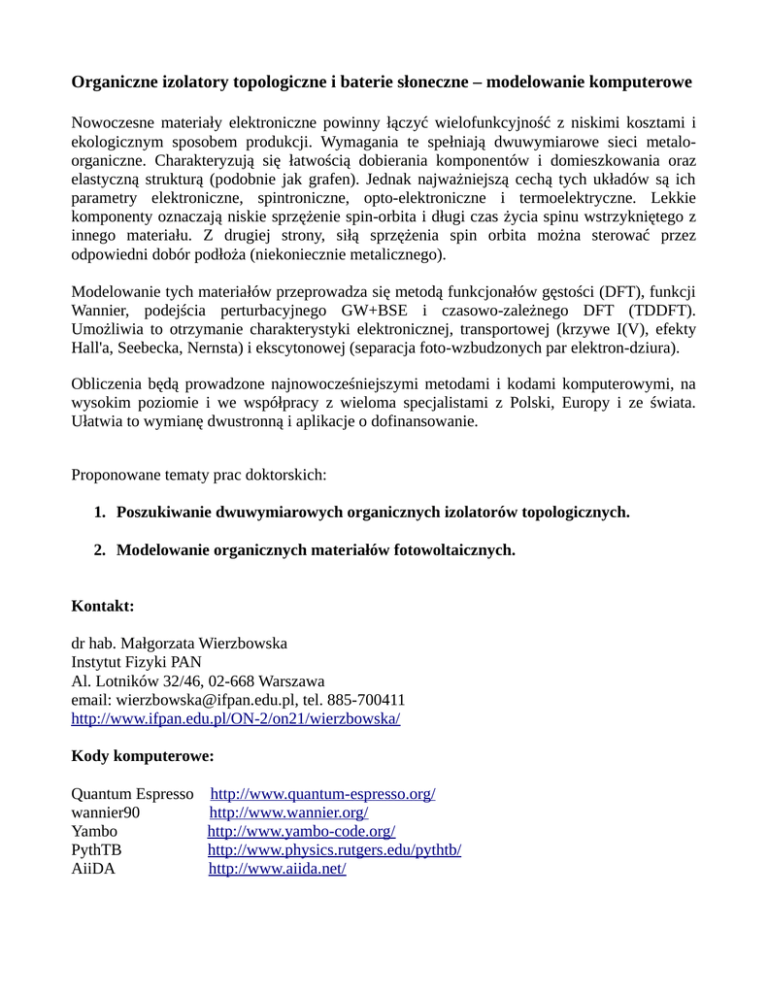 Organiczne izolatory topologiczne i baterie słoneczne – modelowanie komputerowe Nowoczesne materiały elektroniczne powinny łączyć wielofunkcyjność z niskimi kosztami i ekologicznym sposobem produkcji. Wymagania te spełniają dwuwymiarowe sieci metaloorganiczne. Charakteryzują się łatwością dobierania komponentów i domieszkowania oraz elastyczną strukturą (podobnie jak grafen). Jednak najważniejszą cechą tych układów są ich parametry elektroniczne, spintroniczne, opto-elektroniczne i termoelektryczne. Lekkie komponenty oznaczają niskie sprzężenie spin-orbita i długi czas życia spinu wstrzykniętego z innego materiału. Z drugiej strony, siłą sprzężenia spin orbita można sterować przez odpowiedni dobór podłoża (niekoniecznie metalicznego). Modelowanie tych materiałów przeprowadza się metodą funkcjonałów gęstości (DFT), funkcji Wannier, podejścia perturbacyjnego GW+BSE i czasowo-zależnego DFT (TDDFT). Umożliwia to otrzymanie charakterystyki elektronicznej, transportowej (krzywe I(V), efekty Hall'a, Seebecka, Nernsta) i ekscytonowej (separacja foto-wzbudzonych par elektron-dziura). Obliczenia będą prowadzone najnowocześniejszymi metodami i kodami komputerowymi, na wysokim poziomie i we współpracy z wieloma specjalistami z Polski, Europy i ze świata. Ułatwia to wymianę dwustronną i aplikacje o dofinansowanie. Proponowane tematy prac doktorskich: 1. Poszukiwanie dwuwymiarowych organicznych izolatorów topologicznych. 2. Modelowanie organicznych materiałów fotowoltaicznych. Kontakt: dr hab. Małgorzata Wierzbowska Instytut Fizyki PAN Al. Lotników 32/46, 02-668 Warszawa email: [email protected], tel. 885-700411 http://www.ifpan.edu.pl/ON-2/on21/wierzbowska/ Kody komputerowe: Quantum Espresso wannier90 Yambo PythTB AiiDA http://www.quantum-espresso.org/ http://www.wannier.org/ http://www.yambo-code.org/ http://www.physics.rutgers.edu/pythtb/ http://www.aiida.net/