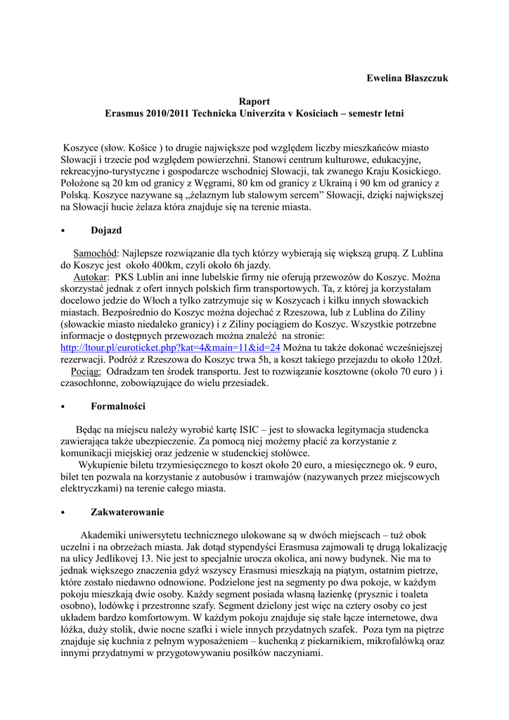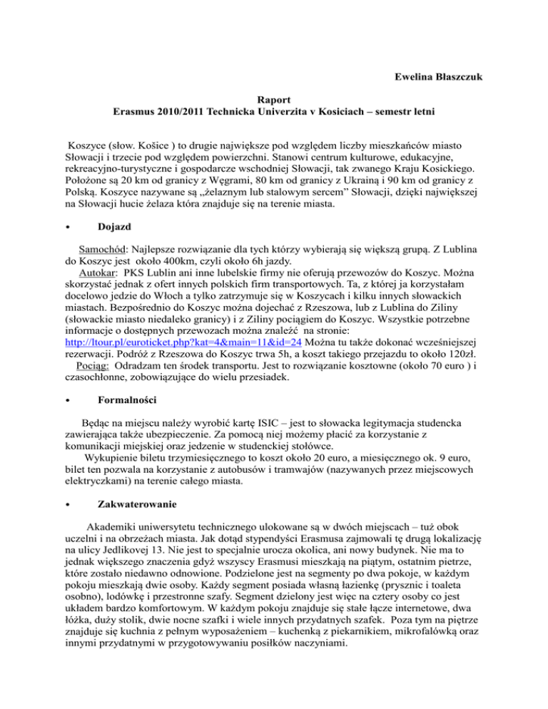 Ewelina Błaszczuk Raport Erasmus 2010/2011 Technicka Univerzita v Kosiciach – semestr letni Koszyce (słow. Košice ) to drugie największe pod względem liczby mieszkańców miasto Słowacji i trzecie pod względem powierzchni. Stanowi centrum kulturowe, edukacyjne, rekreacyjno-turystyczne i gospodarcze wschodniej Słowacji, tak zwanego Kraju Kosickiego. Położone są 20 km od granicy z Węgrami, 80 km od granicy z Ukrainą i 90 km od granicy z Polską. Koszyce nazywane są „żelaznym lub stalowym sercem” Słowacji, dzięki największej na Słowacji hucie żelaza która znajduje się na terenie miasta. • Dojazd Samochód: Najlepsze rozwiązanie dla tych którzy wybierają się większą grupą. Z Lublina do Koszyc jest około 400km, czyli około 6h jazdy. Autokar: PKS Lublin ani inne lubelskie firmy nie oferują przewozów do Koszyc. Można skorzystać jednak z ofert innych polskich firm transportowych. Ta, z której ja korzystałam docelowo jedzie do Włoch a tylko zatrzymuje się w Koszycach i kilku innych słowackich miastach. Bezpośrednio do Koszyc można dojechać z Rzeszowa, lub z Lublina do Ziliny (słowackie miasto niedaleko granicy) i z Ziliny pociągiem do Koszyc. Wszystkie potrzebne informacje o dostępnych przewozach można znaleźć na stronie: http://ltour.pl/euroticket.php?kat=4&main=11&id=24 Można tu także dokonać wcześniejszej rezerwacji. Podróż z Rzeszowa do Koszyc trwa 5h, a koszt takiego przejazdu to około 120zł. Pociąg: Odradzam ten środek transportu. Jest to rozwiązanie kosztowne (około 70 euro ) i czasochłonne, zobowiązujące do wielu przesiadek. • Formalności Będąc na miejscu należy wyrobić kartę ISIC – jest to słowacka legitymacja studencka zawierająca także ubezpieczenie. Za pomocą niej możemy płacić za korzystanie z komunikacji miejskiej oraz jedzenie w studenckiej stołówce. Wykupienie biletu trzymiesięcznego to koszt około 20 euro, a miesięcznego ok. 9 euro, bilet ten pozwala na korzystanie z autobusów i tramwajów (nazywanych przez miejscowych elektryczkami) na terenie całego miasta. • Zakwaterowanie Akademiki uniwersytetu technicznego ulokowane są w dwóch miejscach – tuż obok uczelni i na obrzeżach miasta. Jak dotąd stypendyści Erasmusa zajmowali tę drugą lokalizację na ulicy Jedlikovej 13. Nie jest to specjalnie urocza okolica, ani nowy budynek. Nie ma to jednak większego znaczenia gdyż wszyscy Erasmusi mieszkają na piątym, ostatnim pietrze, które zostało niedawno odnowione. Podzielone jest na segmenty po dwa pokoje, w każdym pokoju mieszkają dwie osoby. Każdy segment posiada własną łazienkę (prysznic i toaleta osobno), lodówkę i przestronne szafy. Segment dzielony jest więc na cztery osoby co jest układem bardzo komfortowym. W każdym pokoju znajduje się stałe łącze internetowe, dwa łóżka, duży stolik, dwie nocne szafki i wiele innych przydatnych szafek. Poza tym na piętrze znajduje się kuchnia z pełnym wyposażeniem – kuchenką z piekarnikiem, mikrofalówką oraz innymi przydatnymi w przygotowywaniu posiłków naczyniami. Początkowo minusem może być to iż na uczelnię należy dojeżdżać. Nie jest to jednak kłopotliwe ponieważ istnieje wiele połączeń, autobusy jeżdżą punktualnie i zajmuje to nie więcej niż 20 min więc po krótkim czasie można się do tego zupełnie przyzwyczaić. W miasteczku akademickim znajduję się również stołówka i sala gimnastyczna. W bliskiej okolicy akademików jest centrum handlowe Optima, gdzie można znaleźć praktycznie wszystko oraz supermarket Kaufland. • Uczelnia Nasza polska grupa miała przedmioty prowadzone w języku angielski lub słowackim. Nie należy obawiać się zajęć w żadnym z tych języków. Język słowacki jest bardzo podobny do polskiego i już po krótkim czasie przyzwyczailiśmy się do różnic i nie mieliśmy problemów z rozumieniem. Od naszej woli zależało także w jakim języku będziemy zdawać egzaminy. Większość materiałów do nauki, takich jak skrypty czy prezentacje dostawaliśmy od wykładowców w formie elektronicznej. Na każdym kroku spotykaliśmy się z życzliwością tamtejszych pedagogów. Na życzenie erasmusów prowadzone są również zajęcia nauki języka słowackiego. Uczelnia posiada nowoczesna i przestronną bibliotekę z darmowym dostępem do internetu. Jest to idealne miejsce na spędzanie przerw między zajęciami. Często korzystaliśmy z uniwersyteckiej stołówki. Biorąc pod uwagę duży wybór naprawdę pysznych potraw i przystępne ceny jest to bardzo rozsądne rozwiązanie. Płatności dokonuje się za pomocą karty ISIC. Im większą kwotę zapłacimy tym większa część zostanie nam zwrócona. Przykładowo płacąc w sumie ponad 3,5 euro po jednym dniu zwrócą nam 2 euro. W ten sposób za około 6 zł możemy mieć dwudaniowy obiad z deserem. Na początku naszego pobytu przydzielono nam opiekuna- studenta. Na terenie miasta działała również organizacja studencka skupiająca stypendystów Erasmusa. Jej zadaniem była organizacja wspólnych wyjazdów. • Sport Najważniejszym sportowym obiektem w Koszycach jest hala sportowo-widowiskową Steel Arena, gdzie podczas naszego pobytu odbywały się Mistrzostwa Świata w hokeju na lodzie. Uczelnia daje możliwość uczestnictwa w różnorodnych sekcjach sportowych poza tym w akademiku przy ul. Jedlikovej 13 znajduje się siłownia. Aby móc z niej korzystać należy wcześniej uiścić jednorazowa opłatę w wysokości około 6 euro. • Życie studenckie, czas wolny Miasto posiada wyjątkowo urocze centrum historyczne, z największą na Słowacji gotycką katedrą św. Elżbiety. Tuż obok znajduje się Teatr z bogatym repertuarem i przystępnymi cenami wprost na studencką kieszeń. Pomiędzy tymi obiektami znajduje się park wraz z grającą fontanną. Wiosną i latem jest to miejsce szczególnie tętniące życiem. W mieście działa również ogród zoologiczny, ogród botaniczny i planetar