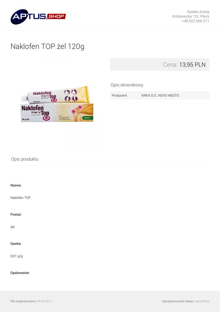 Apteka Avena Królewiecka 12c, Płock +48 502 666 011 Naklofen TOP żel 120g Cena: 13,95 PLN Opis słownikowy Producent KRKA D.D., NOVO MESTO Opis produktu Nazwa: Naklofen TOP Postać: żel Dawka: 0,01 g/g Opakowanie: Plik wygenerowano: 04-03-2017 Oprogramowanie sklepu: AptusShop Apteka Avena Królewiecka 12c, Płock +48 502 666 011 120 g Skład: 1 g żelu zawiera 11,6 mg diklofenaku dietyloamoniowego, co odpowiada 10 mg diklofenaku sodowego (Diclofenacum natricum). Pełny wykaz substancji pomocniczych, patrz punkt 6.1. Wskazania: Naklofen Top stosowany jest w miejscowym leczeniu: - reumatyzmu pozastawowego (bóle mięśni, stany zapalne tkanki łącznej włóknistej, kaletek maziowych, zapalenie ścięgien, zapalenie pochewek ścięgien, bóle lędźwiowego odcinka kręgosłupa lub stawu barkowego), - zmian pourazowych (naciągnięcia, skręcenia, zwichnięcia), - ograniczonych i łagodnych postaci zapalenia stawów. : Nadwrażliwość na diklofenak, glikol propylenowy lub na którąkolwiek substancję pomocniczą produktu leczniczego. Produkt leczniczy Naklofen Top jest także przeciwwskazany u tych pacjentów, u których napady astmy, pokrzywka, czy ostre nieżyty nosa są wywoływane przez kwas acetylosalicylowy lub inne niesteroidowe leki przeciwzapalne. Działania niepożądane: Działania niepożądane obejmują łagodne i przemijające objawy skórne w miejscu zastosowania. W bardzo rzadkich przypadkach mogą wystąpić reakcje alergiczne. Działania niepożądane zostały zestawione według częstości ich występowania, zaczynając od najczęściej występujących, według następującej konwencji: często (≥ 1/100, < 1/10); niezbyt często (≥ 1/1000, < 1/100); rzadko (≥ 1/10 000, < 1/1000); bardzo rzadko (< 1/10 000), częstość nieznana (nie może być określona na podstawie dostępnych danych) Zakażenia i zarażenia pasożytnicze Bardzo rzadko: wysypka grudkowata Zaburzenia układu immunologicznego Bardzo rzadko: nadwrażliwość, obrzęk naczynioruchowy Zaburzenia oddechowe, klatki piersiowej i śródpiersia Bardzo rzadko: astma Zaburzenia skóry i tkanki podskórnej Często: wysypka, wyprysk, rumień, zapalenie skóry (w tym kontaktowe zapalenie skóry) Rzadko: pęcherzykowe zapalenie skóry Bardzo rzadko: reakcje nadwrażliwości na światło Dawkowanie: Naklofen Top należy stosować miejscowo, na skórę trzy lub cztery razy na dobę, delikatnie wcierając. Ilość zużytego żelu należy dostosować do rozmiarów miejsca zmienionego chorobowo. Na przykład ilość 2 g do 4 g produktu (ilość odpowiadająca wielkości owocu wiśni do rozmiarów orzecha włoskiego) jest wystarczająca do posmarowania powierzchni około 400 cm 2 do 800 cm 2. Po zastosowaniu produktu leczniczego należy umyć ręce, chyba że to właśnie ręce są miejscem leczonym. Należy unikać kontaktu żelu z oczami i błonami śluzowymi (np. jamy ustnej). Okres leczenia zależy od wskazań i od reakcji na leczenie. W przypadku stosowania produktu bez konsultacji z lekarzem, nie należy go stosować dłużej niż przez 14 dni w przypadku nadwerężeń i reumatyzmu tkanki miękkiej lub przez 21 dni w przypadku bólu związanego z zapaleniem stawów. Zaleca się kontrolę lekarską po 7 dniach stosowania żelu w przypadku braku skuteczności leczenia lub z chwilą nasilenia się objawów chorobowych. Nie zaleca się stosowania produktu leczniczego Naklofen Top u dzieci poniżej 12 lat. Plik wygenerowano: 04-03-2017 Oprogramowanie sklepu: AptusShop Apteka Avena Królewiecka 12c, Płock +48 502 666 011 Środki ostrożności: Nie można wykluczyć możliwości wystąpienia ogólnoustrojowych działań niepożądanych w przypadku stosowania produktu leczniczego Naklofen Top na duże powierzchnie skóry lub podczas stosowania długotrwałego. Produkt leczniczy Naklofen Top należy stosować tylko na nieuszkodzoną powierzchnię skóry. Należy unikać kontaktu żelu z oczami i błonami śluzowymi (np. jama ustna). W czasie leczenia produktem leczniczym Naklofen Top pacjent powinien unikać nadmiernego narażenia na światło słoneczne. Naklofen Top zawiera glikol propylenowy, który może powodować, u niektórych pacjentów, łagodne, miejscowe podrażnienia skóry. Prowadzenie pojazdów: Naklofen Top nie wywiera wpływu na zdolność do prowadzenia pojazdów mechanicznych i obsługiwania urządzeń mechanicznych w ruchu, po zastosowaniu na skórę. Przedawkowanie: Przedawkowanie produktu leczniczego Naklofen Top jest mało prawdopodobne ze względu na niewielkie wchłanianie diklofenaku stosowanego miejscowo. W razie przypadkowego połknięcia skutkującego działaniami niepożądanymi należy wdrożyć leczenie objawowe zwykle stosowane w przypadku leczenia zatruć niesteroidowymi lekami przeciwzapalnymi. Można wykonać płukanie żołądka lub podać węgiel aktywowany, zwłaszcza w początkowym okresie po spożycia produktu leczniczego. Ciąża: Ciąża Ze względu na brak danych dotyczących stosowania diklofenaku u kobiet w ciąży nie należy stosować produktu leczniczego Naklofen Top w okresie ciąży. Dotyczy to zwłaszcza stosowania w trzecim trymestrze ciąży, ze względu na możliwość zahamowania czynności macicy i (lub) przedwczesnego zamknięcia przewodu tętniczego. Badania na zwierzętach nie wykazały bezpośredniego lub pośredniego szkodliwego wpływu na ciążę, rozwój zarodka/płodu, poród lub rozwój po urodzeniu. Laktacja Brak danych dotyczących przenikania diklofenaku, stosowanego miejscowo, do mleka kobiet karmiących piersią, dlatego nie zaleca się stosowania produktu leczniczego Naklofen Top podczas karmienia piersią. W przypadku uzasadnionej konieczności zastosowania, w okresie laktacji, nie należy stosować produktu leczniczego na piersi lub duże powierzchnie skóry lub długotrwale. Plik wygenerowano: 04-03-2017 Powered by TCPDF (www.tcpdf.org) Oprogramowanie sklepu: AptusShop