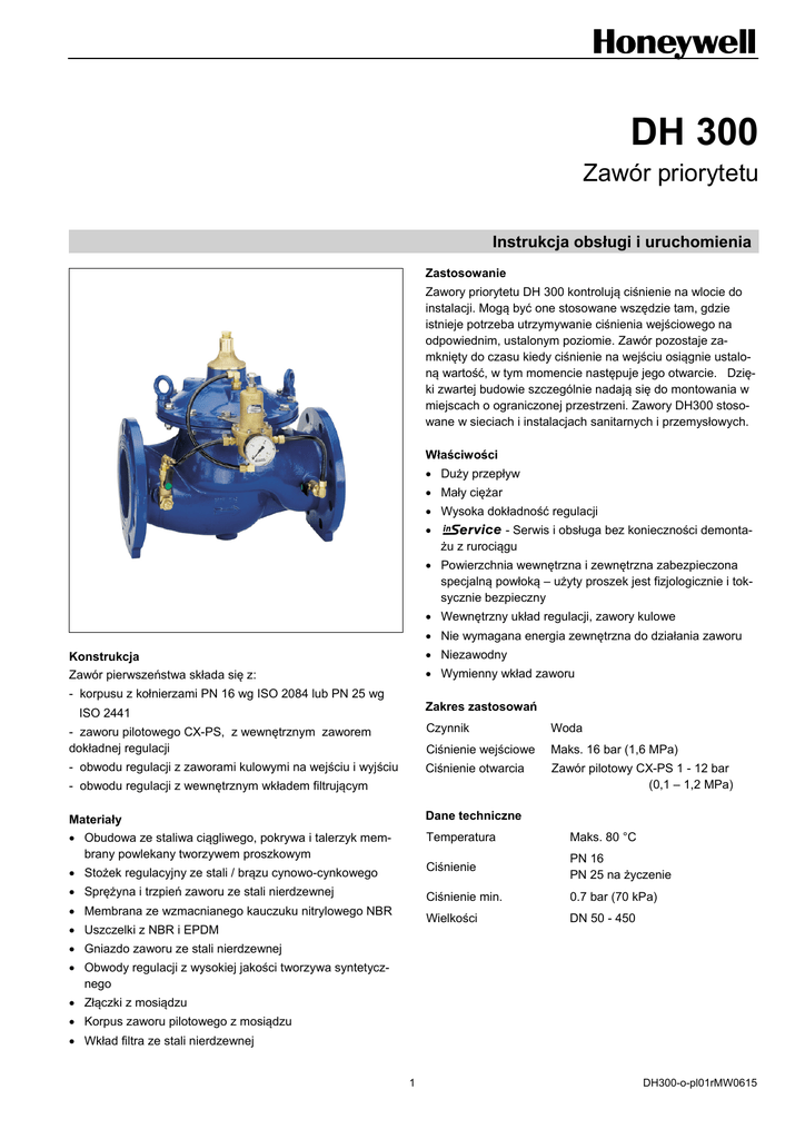 DH 300 Zawór priorytetu Instrukcja obsługi i uruchomienia Zastosowanie Zawory priorytetu DH 300 kontrolują ciśnienie na wlocie do instalacji. Mogą być one stosowane wszędzie tam, gdzie istnieje potrzeba utrzymywanie ciśnienia wejściowego na odpowiednim, ustalonym poziomie. Zawór pozostaje zamknięty do czasu kiedy ciśnienie na wejściu osiągnie ustaloną wartość, w tym momencie następuje jego otwarcie. Dzięki zwartej budowie szczególnie nadają się do montowania w miejscach o ograniczonej przestrzeni. Zawory DH300 stosowane w sieciach i instalacjach sanitarnych i przemysłowych. Właściwości Duży przepływ Mały ciężar Wysoka dokładność regulacji - Serwis i obsługa bez konieczności demontażu z rurociągu Powierzchnia wewnętrzna i zewnętrzna zabezpieczona specjalną powłoką – użyty proszek jest fizjologicznie i toksycznie bezpieczny Wewnętrzny układ regulacji, zawory kulowe Nie wymagana energia zewnętrzna do działania zaworu Konstrukcja Niezawodny Zawór pierwszeństwa składa się z: Wymienny wkład zaworu - korpusu z kołnierzami PN 16 wg ISO 2084 lub PN 25 wg Zakres zastosowań ISO 2441 - zaworu pilotowego CX-PS, z wewnętrznym zaworem dokładnej regulacji Czynnik Woda Ciśnienie wejściowe Maks. 16 bar (1,6 MPa) - obwodu regulacji z zaworami kulowymi na wejściu i wyjściu Ciśnienie otwarcia Zawór pilotowy CX-PS 1 - 12 bar (0,1 – 1,2 MPa) - obwodu regulacji z wewnętrznym wkładem filtrującym Materiały Dane techniczne Obudowa ze staliwa ciągliwego, pokrywa i talerzyk membrany powlekany tworzywem proszkowym Temperatura Maks. 80 °C Stożek regulacyjny ze stali / brązu cynowo-cynkowego Ciśnienie PN 16 PN 25 na życzenie Sprężyna i trzpień zaworu ze stali nierdzewnej Ciśnienie min. 0.7 bar (70 kPa) Wielkości DN 50 - 450 Membrana ze wzmacnianego kauczuku nitrylowego NBR Uszczelki z NBR i EPDM Gniazdo zaworu ze stali nierdzewnej Obwody regulacji z wysokiej jakości tworzywa syntetycznego Złączki z mosiądzu Korpus zaworu pilotowego z mosiądzu Wkład filtra ze stali nierdzewnej 1 DH300-o-pl01rMW0615 Zawór pierwszeństwa DH300 1. Instalacja - Zawór może być zamontowany w każdej pozycji tak, aby przepływ był zgodny z kierunkiem wskazanym przez strzałkę na korpusie. - Po obu stronach zaworu regulacyjnego należy zamontować zawory odcinające. - Przed zainstalowaniem zaworu regulacyjnego należy przepłukać rurociąg aby usunąć ewentualne zanieczyszczenia. Schemat podłączenia zaworu DH300 a. CXPS Zawór pilotowy utrzymujący ciśnienie b. Filtr c. Zawór kulowy N. Nakrętka odpowietrzająca 2. Uruchomienie Metoda I 1. Otworzyć zawory kulowe [c1, c2 i c3]. 2. Otworzyć zawory odcinające przed i za zaworem głównym, aby umożliwić minimalny przepływ przez zawór główny. 3. Odpowietrzyć przestrzeń nad membraną poprzez powolne odkręcenie nakrętki [N] i ponowne jej zakręcenie po usunięciu powietrza i pojawieniu się wody. 4. Wykręcić całkowicie śrubę regulacyjną [a1] w zaworze pilotowym [a]. Zawór główny powinien się otworzyć w pełni. 5. Upewnić się czy ciśnienie przed zaworem jest wyższe od wymaganego ciśnienia wejściowego. 6. Poprzez zdławienie armatury odcinającej przed zaworem głównym zredukować ciśnienie wejściowe do wymaganego ciśnienia otwarcia zaworu. 7. Powoli wkręcać śrubę regulacyjną [a1] w zaworze pilotowym [a] dopóki ciśnienie na wejściu (manometr na pilocie [a]) nie osiągnie wymaganej wartości + 0,2 – 0,3 bar. Po ustaleniu wartości skontrować śrubę nakrętką. 8. Otworzyć armaturę odcinającą w pozycję pełnego przepływu. 2 42 Zawór pierwszeństwa DH300 Metoda II 1. Otworzyć zawory kulowe [c1, c2 i c3]. 2. Otworzyć zawory odcinające przed i za zaworem głównym, aby umożliwić minimalny przepływ przez zawór główny. 3. Odpowietrzyć przestrzeń nad membraną poprzez powolne odkręcenie nakrętki [N] i ponowne jej zakręcenie po usunięciu powietrza i pojawieniu się wody. 4. Wykręcić całkowicie śrubę regulacyjną [a1] w zaworze pilotowym [a]. Zawór główny powinien się otworzyć. 5. Upewnić się, czy ciśnienie przed zaworem jest wyższe od wymaganego ciśnienia wyjściowego. 7. Wkręcić śrubę regulacyjną [a1] na zaworze pilotowym [a - CXPS] ok. 3-4 obroty. 8. Zamknąć armaturę odcinającą za zaworem głównym i poluzować nakrętkę mocującą rurkę impulsową przy zaworze [c2] - należy spodziewać się niewielkiego wycieku wody. 9. Zamknąć armaturę odcinającą przed zaworem głównym i poluzować nakrętkę mocującą rurkę impulsową na zaworze [c1] aż do momentu uzyskania wartości ciśnienia (wskazanego na manometrze pilota[a CXPS]), przy którym zawór główny ma się zamknąć, a następnie dokręcić nakrętkę rurki impulsowej. 10. Powoli wykręcać śrubę regulacyjną [a1] w zaworze pilotowym [a CXPS] dopóki ciśnienie (manometr na pilocie [a CXPS]) nie spadnie – zawór otworzy się. Za zaworem z rurki impulsowej zaworu [c2] powinna wypłynąć niewielka ilość wody. Po ustaleniu wartości skontrować śrubę nakrętką. 11. Dokręcić rurkę impulsową przy zaworze [c2]. 12. Powoli otworzyć armaturę odcinającą przed i za zaworem w pozycję pełnego przepływu. 3. Ręczna obsługa.. 1. W celach serwisowych zawór może zostać pozostawiony w ustalonej pozycji, wyłączając automatyczna kontrolę, poprzez zamknięcie zaworu kulowego [c3] na obwodzie sterującym. Po zakończeniu czynności serwisowych ponownie należy otworzyć zawór kulowy [c3]. 2. Zamknięcie zaworu kulowego [c2] powoduje zamknięcie zaworu głównego. 4. Czyszczenie wkładu filtracyjnego a. Sprawdzenie oraz oczyszczenie wkładu filtracyjnego [b] powinno odbywać się co najmniej raz w roku. W przypadku dużego stopnia zanieczyszczenia wody, czynność ta powinna być wykonywana częściej. Prace konserwacyjne powinny być odnotowane w karcie przeglądu zaworu. b. Aby oczyścić wkład filtracyjny należy zamknąć armaturę odcinając