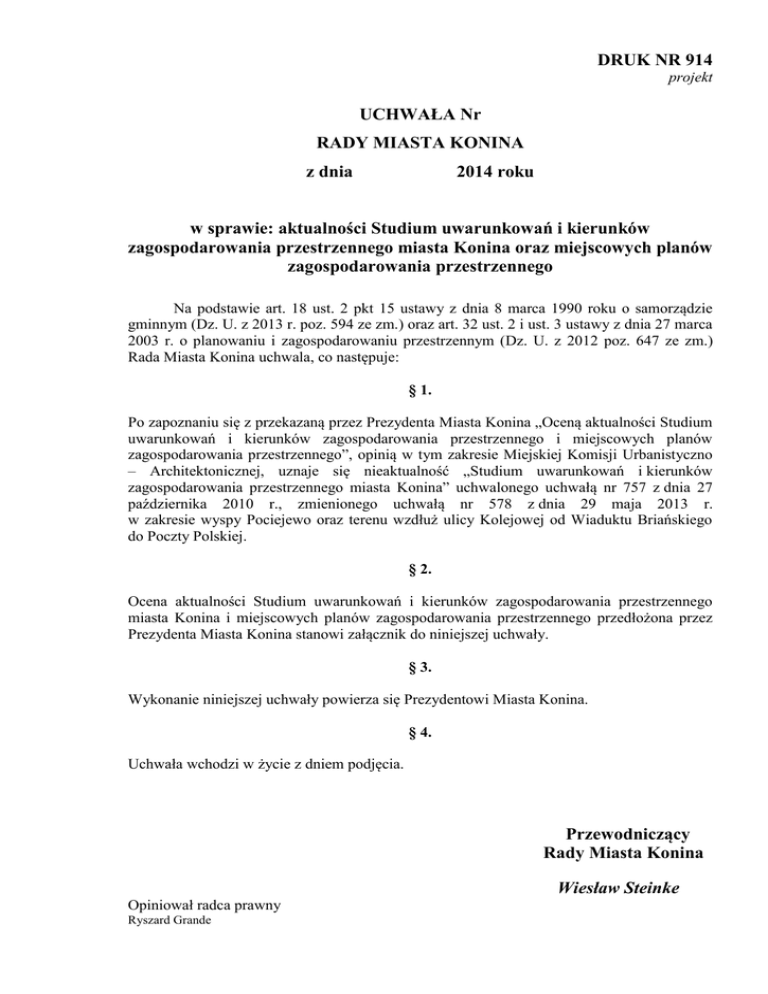 DRUK NR 914 projekt UCHWAŁA Nr RADY MIASTA KONINA z dnia 2014 roku w sprawie: aktualności Studium uwarunkowań i kierunków zagospodarowania przestrzennego miasta Konina oraz miejscowych planów zagospodarowania przestrzennego Na podstawie art. 18 ust. 2 pkt 15 ustawy z dnia 8 marca 1990 roku o samorządzie gminnym (Dz. U. z 2013 r. poz. 594 ze zm.) oraz art. 32 ust. 2 i ust. 3 ustawy z dnia 27 marca 2003 r. o planowaniu i zagospodarowaniu przestrzennym (Dz. U. z 2012 poz. 647 ze zm.) Rada Miasta Konina uchwala, co następuje: § 1. Po zapoznaniu się z przekazaną przez Prezydenta Miasta Konina „Oceną aktualności Studium uwarunkowań i kierunków zagospodarowania przestrzennego i miejscowych planów zagospodarowania przestrzennego”, opinią w tym zakresie Miejskiej Komisji Urbanistyczno – Architektonicznej, uznaje się nieaktualność „Studium uwarunkowań i kierunków zagospodarowania przestrzennego miasta Konina” uchwalonego uchwałą nr 757 z dnia 27 października 2010 r., zmienionego uchwałą nr 578 z dnia 29 maja 2013 r. w zakresie wyspy Pociejewo oraz terenu wzdłuż ulicy Kolejowej od Wiaduktu Briańskiego do Poczty Polskiej. § 2. Ocena aktualności Studium uwarunkowań i kierunków zagospodarowania przestrzennego miasta Konina i miejscowych planów zagospodarowania przestrzennego przedłożona przez Prezydenta Miasta Konina stanowi załącznik do niniejszej uchwały. § 3. Wykonanie niniejszej uchwały powierza się Prezydentowi Miasta Konina. § 4. Uchwała wchodzi w życie z dniem podjęcia. Przewodniczący Rady Miasta Konina Wiesław Steinke Opiniował radca prawny Ryszard Grande UZASADNIENIE do uchwały Nr ….. Rady Miasta Konina z dnia …………………. 2014 r. w sprawie: aktualności Studium uwarunkowań i kierunków zagospodarowania przestrzennego miasta Konina oraz miejscowych planów zagospodarowania przestrzennego Ocenę aktualności Studium uwarunkowań i kierunków zagospodarowania przestrzennego miasta Konina oraz miejscowych planów zagospodarowania przestrzennego dokonuje się w oparciu o analizę zmian w zagospodarowaniu miasta, analizę wniosków w sprawie sporządzenia lub zmiany miejscowego planu, a także biorąc pod uwagę przebieg dotychczasowych prac planistycznych prowadzonych od 2010 r. zgodnie z art. 18 ust. 2 pkt 15 ustawy z dnia 8 marca 1990 roku o samorządzie gminnym (t.j. Dz.U. z 2001r. Nr 142, poz. 1591; ze zm.) oraz art. 32 ust. 2 i ust. 3 ustawy z dnia 27 marca 2003 r. o planowaniu i zagospodarowaniu przestrzennym (Dz. U. z 2003r. Nr 80, poz. 717; ze zm.). Opracowanie ma na celu ocenę potrzeb zmian w planach miejscowych, zoptymalizowanie działań w zakresie planowania przestrzennego w mieście oraz określenie wieloletniego planu sporządzania miejscowych planów lub ich zmian. Zastępca Prezydenta Miasta Konina /-/ Marek Waszkowiak