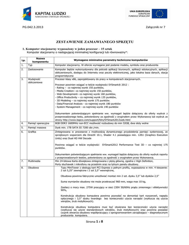 Załącznik nr 7 PG.042.3.2013 ZESTAWIENIE ZAMAWIANEGO SPRZĘTU 1. Komputer stacjonarny wyposażony w jeden procesor – 15 sztuk Komputer stacjonarny o następującej minimalnej konfiguracji lub równoważny*: Nazwa komponentu Lp. Wymagane minimalne parametry techniczne komputerów 1. Typ Komputer stacjonarny. W ofercie wymagane jest podanie modelu, symbolu oraz producenta 2. Zastosowanie 3. Wydajność obliczeniowa Komputer będzie wykorzystywany dla potrzeb aplikacji biurowych, aplikacji edukacyjnych, aplikacji obliczeniowych, dostępu do Internetu oraz poczty elektronicznej, jako lokalna baza danych, stacja programistyczna Procesor klasy x86, zaprojektowany do pracy w komputerach stacjonarnych. Procesor powinien osiągać w teście wydajności SYSmark® 2012 : - Rating – co najmniej wynik 155 punktów, - Media Creation– co najmniej wynik 150 punktów, - Web Development– co najmniej wynik 160 punktów, - Office Productivity – co najmniej wynik 135 punktów, - 3D Modeling – co najmniej wynik 175 punktów. - Data/Financial Analysis - co najmniej wynik 180 punktów - System Management - co najmniej wynik 140 punktów 4. Pamięć operacyjna Dokumentem potwierdzającym spełnianie ww. wymagań będzie dołączony do oferty wydruk z przeprowadzonego testu, potwierdzony za zgodność z oryginałem przez Wykonawcę lub wydruk ze strony http://www.bapco.com/support/fdrs/SYSmark2012web.html 8GB DDR3 1600MHz non-ECC możliwość rozbudowy do min 32GB, dwa sloty wolne 5. Pamięć masowa Dysk min. 1TB SATA III 7200 obr./min. 6. Grafika Zintegrowana w procesorze z możliwością dynamicznego przydzielenia pamięci systemowej, ze sprzętowym wsparciem dla DirectX 10.1, Shader 4.1 posiadająca min. 12EU (Graphics Execution Units) oraz Dual HD HW Decode Powinna osiągać w teście wydajności punktów. 7. Multimedia 8. Obudowa SYSmark2012 Performance Test 3D – co najmniej 175 Dokumentem potwierdzającym spełnianie ww. wymagań będzie dołączony do oferty wydruk raportu z przeprowadzonych testów, potwierdzony za zgodność z oryginałem przez Wykonawcę. Min 24-bitowa Karta dźwiękowa zintegrowana z płytą główną, zgodna z High Definition, Porty słuchawek i mikrofonu na przednim oraz na tylnym panelu obudowy. Typu MiniTower z obsługą kart PCI Express o pełnym profilu, wyposażona w min. 4 kieszenie: 2 szt 5,25” zewnętrzne i 2 szt 3,5” wewnętrzne, Obudowa powinna fabrycznie umożliwiać montaż min 2 szt. dysku 3,5” lub dysków 2,5” Suma wymiarów obudowy nie może przekraczać 960 mm, waga max 10 kg, Zasilacz o mocy max. 275W pracujący w sieci 230V 50/60Hz prądu zmiennego i efektywności 90%, Konstrukcja obudowy komputera powinna pozwalać na demontaż kart rozszerzeń, napędu optycznego i 3,5” dysku twardego bez konieczności użycia narzędzi (wyklucza się użycia wkrętów, śrub motylkowych). Konstrukcja obudowy komputera musi być otwierana bez konieczności użycia narzędzi (wyklucza się użycie standardowych wkrętów, śrub motylkowych) oraz powinna posiadać czujnik otwarcia obudowy współpracujący z oprogramowaniem zarządzająco – diagnostycznym producenta komputera. Strona 1 z 8 Załącznik nr 7 PG.042.3.2013 Konstrukcja obudowy komputera musi umożliwiać zastosowanie zabezpieczenia fizycznego w postaci linki metalowej (złącze blokady Kensingtona) oraz kłódki (oczko w obudowie do założenia kłódki). Obudowa musi być wyposażona w zamek który nie wystaje poza obrys obudowy. Obudowa musi posiadać wbudowany wizualny lub dźwiękowy system diagnostyczny, służący do sygnalizowania i diagnozowania problemów z komputerem i jego komponentami, a w szczególności musi sygnalizować: - uszkodzenie lub brak pamięci RAM - uszkodzenie złączy PCI i PCIe, płyty głównej - uszkodzenie kontrolera Video - uszkodzenie dysku twardego - awarię BIOS’u - awarię procesora 9. 10. Zgodność systemami operacyjnymi standardami Bezpieczeństwo 11. Wirtualizacja 12. BIOS Oferowany system diagnostyczny nie może wykorzystywać minimalnej ilości wolnych slotów wymaganych w punkcie 19 specyfkacji, z Potwierdzenie kompatybilności komputera na stronie Windows Logo'd Products List na daną platformę systemową (wydruk ze strony) i Zintegrowany z płytą główną dedykowany układ sprzętowy służący do tworzenia i zarządzania wygenerowanymi przez komputer kluczami szyfrowania. Zabezpieczenie to musi posiadać możliwość szyfrowania poufnych dokumentów przechowywanych na dysku twardym przy użyciu klucza sprzętowego Obudowa w jednostce centralnej musi posiadać czujnik otwarcia obudowy współpracujący z oprogramowaniem zarządzająco – diagnostycznym producenta komputera Sprzętowe wsparcie technologi wirtualizacji realizowane łącznie w procesorze, chipsecie płyty główej oraz w BIOS systemu (możliwość włączenia/wyłączenia sprzętowego wsparcia wirtualizacji dla poszczególnych komponentów systemu). BIOS zgodny ze specyfikacją UEFI - Możliwość, bez uruchamiania systemu operacyjnego z dysku twardego komputera lub innych podłączonych do niego urządzeń zewnętrznych odczytania z BIOS informacji o: wersji BIOS, nr seryjnym komputera wraz z datą jego wyprodukowania, ilości i sposobu obłożenia slotów pamięciami RAM, typie procesora wraz z informacją o ilości rdzeni, wielkości pamięci cache L2 i L3, pojemności zainstalowanego dysku twardego rodzajach napędów optycznych MAC adresie zintegrowanej karty sieciowej kontrolerze audio - Funkcja blokowania wejścia do BIOS oraz blokowania startu systemu operacyjnego, (gwarantujący utrzymanie zapisanego hasła nawet w przypadku odłączenia wszystkich źródeł zasilania i podtrzymania BIOS) - Funkcja blokowania/odblokowania BOOT-owania stacji roboczej z zewnętrznych urządzeń - Możliwość polegająca na kontrolowaniu urządzeń wykorzystujących magistralę komunikacyjną PCI, bez uruchamiania systemu operacyjnego z dysku twardego komputera lub innych podłączonych d