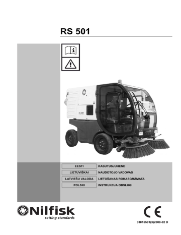 RS 501 EESTI LIETUVIŠKAI LATVIEŠU VALODA POLSKI KASUTUSJUHEND NAUDOTOJO VADOVAS LIETOŠANAS ROKASGRƖMATA INSTRUKCJA OBSàUGI 33015501(3)2008-02 D A ɋɟɪɬɢɮɢɤɚɬ ɡɚ ɫɴɨɬɜɟɬɫɬɜɢɟ Conformity certificate Declaração de conformidade OsvČdþení o shodČ ȆȚıIJȠʌȠȚȘIJȚțȩ ıȣȝȝȩȡijȦıȘȢ Deklaracja zgodnoĞci Konformitätserklärung MegfelelĘsségi nyilatkozat Certificat de conformitate Overensstemmelsescertifikat Dichiarazione di conformità Ɂɚɹɜɥɟɧɢɟ ɨ ɫɨɨɬɜɟɬɫɬɜɢɢ Declaración de conformidad Atitikties deklaracija Överensstämmelsecertifikat Vastavussertifikaat AtbilstƯbas deklarƗcija Certifikát súladu Déclaration de conformité Konformitetssertifisering Certifikat o ustreznosti Yhdenmukaisuustodistus Conformiteitsverklaring Uyumluluk sertifikası Ɇɨɞɟɥ / Model / Modell / Model / Modelo / Mudel / Modèle / Malli / Model / ȂȠȞIJȑȜȠ / Modell / Modello / Modelis / Modelis / Modell / Model / Modelo / Model / Model / Ɇɨɞɟɥɶ / Modell / Model / Model / Model : ROAD SWEEPER Ɍɢɩ / Typ / Typ / Type / Tipo / Tüüp / Type / Tyyppi / Type / ȉȪʌȠȢ / Típus / Tipo / Tipas / Tips / Type / Type / Tipo / Typ / Tip / Ɍɢɩ / Typ / Typ / Tip / Tip : RS 501 ɋɟɪɢɟɧ ɧɨɦɟɪ / Výrobní þíslo / Seriennummer / Serienummer / Número de serie / Seerianumber / Numéro de série / Sarjanumero / Serial number / ȈİȚȡȚĮțȩȢ ĮȡȚșȝȩȢ / Sorozatszám / Numero di serie / Serijos numeris / SƝrijas numurs / Serienummer / Serienummer / Número de série / Numer seryjny / Număr de serie / ɋɟɪɢɣɧɵɣ ɧɨɦɟɪ / Serienummer / Výrobné þíslo / Serijska številka / Seri Numarası : Ƚɨɞɢɧɚ ɧɚ ɩɪɨɢɡɜɨɞɫɬɜɨ / Rok výroby / Baujahr / Fabrikationsår / Año de fabricación / Väljalaskeaasta / Année de fabrication / Valmistusvuosi / Year of construction / DzIJȠȢ țĮIJĮıțİȣȒȢ / Gyártási év / Anno di costruzione / Pagaminimo metai / Izgatavošanas gads / Byggeår / Bauwjaar / Ano de fabrico / Rok produkcji / Anul fabricaĠiei / Ƚɨɞ ɜɵɩɭɫɤɚ / Tillverkningsår / Rok výroby / Leto izdelave / Leto izdelave/ømal yılı : Ⱦɨɥɭɩɨɞɩɢɫɚɧɢɹɬ ɩɨɬɜɴɪɠɞɚɜɚ, ɱɟ ɝɨɪɟɫɩɨɦɟɧɚɬɢɹɬ ɦɨɞɟɥ ɟ ɩɪɨɢɡɜɟɞɟɧ ɜ ɫɴɨɬɜɟɬɫɬɜɢɟ ɫɴɫ ɫɥɟɞɧɢɬɟ ɞɢɪɟɤɬɢɜɢ ɢ ɫɬɚɧɞɚɪɬɢ. The undersigned certify that the above mentioned model is produced in accordance with the following directives and standards. A presente assinatura serve para declarar que os modelos supramencionados são produtos em conformidade com as seguintes directivas e normas. Níže podepsaný stvrzuje, že výše uvedený model byl vyroben v souladu s následujícími smČrnicemi a normami. ȅ țȐIJȦșȚ ȣʌȠȖİȖȡĮȝȝȑȞȠȢ ʌȚıIJȠʌȠȚİȓ ȩIJȚ Ș ʌĮȡĮȖȦȖȒ IJȠȣ ʌȡȠĮȞĮijİȡșȑȞIJȠȢ ȝȠȞIJȑȜȠȣ ȖȓȞİIJĮȚ ıȪȝijȦȞĮ ȝİ IJȚȢ ĮțȩȜȠȣșİȢ ȠįȘȖȓİȢ țĮȚ ʌȡȩIJȣʌĮ. NiĪej podpisany zaĞwiadcza, Īe wymieniony powyĪej model produkowany jest zgodnie z nastĊpującymi dyrektywami i normami. Der Unterzeichner bestätigt hiermit dass die oben erwähnten Modelle gemäß den folgenden Richtlinien und Normen hergestellt wurden. Alulírottak igazoljuk, hogy a fent említett modellt a következĘ irányelvek és szabványok alapján hoztuk létre. Subsemnatul atest că modelul susmenĠionat este produs în conformitate cu următoarele directive úi standarde. Undertegnede attesterer herved, at ovennævnte model er produceret i overensstemmelse med følgende direktiver og standarder. Il sottoscritto dichiara che i modelli sopra menzionati sono prodotti in accordo con le seguenti direttive e standard. ɇɚɫɬɨɹɳɢɦ ɭɞɨɫɬɨɜɟɪɹɟɬɫɹ, ɱɬɨ ɦɚɲɢɧɚ ɜɵɲɟɭɤɚɡɚɧɧɨɣ ɦɨɞɟɥɢ ɢɡɝɨɬɨɜɥɟɧɚ ɜ ɫɨɨɬɜɟɬɫɬɜɢɢ ɫɨ ɫɥɟɞɭɸɳɢɦɢ ɞɢɪɟɤɬɢɜɚɦɢ ɢ ɫɬɚɧɞɚɪɬɚɦɢ. El abajo firmante certifica que los modelos arriba mencionados han sido producidos de acuerdo con las siguientes directivas y estandares. Toliau pateiktu dokumentu patvirtinama, kad minơtas modelis yra pagamintas laikantis nurodytǐ direktyvǐ bei standartǐ. Undertecknad intygar att ovannämnda modell är producerad i överensstämmelse med följande direktiv och standarder. Allakirjutanu kinnitab, et ülalnimetatud mudel on valmistatud kooskõlas järgmiste direktiivide ja normidega. Ar šo tiek apliecinƗts, ka augstƗkminƝtais modelis ir izgatavots atbilstoši šƗdƗm direktƯvƗm un standartiem. Dolu podpísaný osvedþuje, že hore uvedený model sa vyrába v súlade s nasledujúcimi smernicami a normami. Je soussigné certifie que les modèles cidessus sont fabriqués conformément aux directives et normes suivantes. Undertegnede attesterer att ovennevnte modell är produsert i overensstemmelse med fölgende direktiv og standarder. Spodaj podpisani potrjujem, da je zgoraj omenjeni model izdelan v skladu z naslednjimi smernicami in standardi. Allekirjoittaia vakuuttaa että yllämainittu malli on tuotettu seuraavien direktiivien ja standardien mukaan. Ondergetekende verzekert dat de bovengenoemde modellen geproduceerd zijn in overeenstemming met de volgende richtlijnen en standaards. Aúa÷ıda ømzası olan kiúi, yukarıda bahsedilen model cihazın aúa÷ıda verilen direktiflere ve standartlara uygunlukta imal edildi÷ini onaylar. EC Machinery Directive 98/37/EC EC Low Voltage Directive 73/23/EEC EC EMC Directive 89/336/EEC EN 12100-1, EN 12100-2, EN 294, EN 349 EN 60335-1, EN 60335-2-72 EN 61000, EN 50366, EN 13019 Manufacturer: Nilfisk-Advance S.p.a. Authorized signatory: Franco Mazzini, General Mgr Date: Signature: Address: Strada Comunale della Braglia, 18, 26862 GUARDAMIGLIO (LO) - ITALY Tel: +39 (0)377 451124, Fax: +39 (0)377 51443 B C 1 2 6 5 3 4 S311362 RS 501 S310810 33015501(3)2008-02 D I D i j k l m n o p 25 27 26 24 1 b c d e f gh a