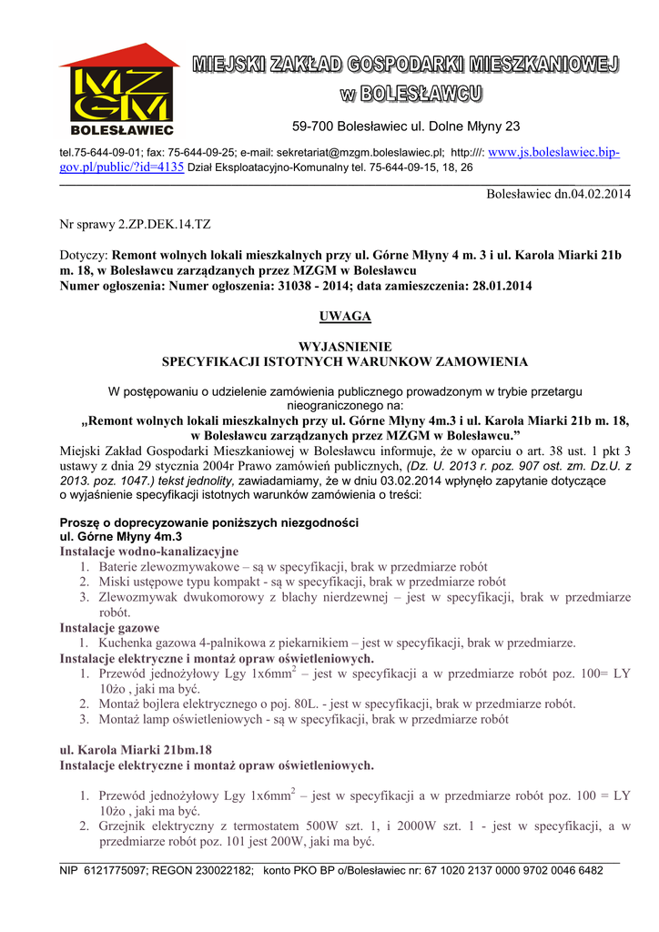59-700 Bolesławiec ul. Dolne Młyny 23 tel.75-644-09-01; fax: 75-644-09-25; e-mail: [email protected]; http:///: www.js.boleslawiec.bipgov.pl/public/?id=4135 Dział Eksploatacyjno-Komunalny tel. 75-644-09-15, 18, 26 _______________________________________________________________________________________________________ Bolesławiec dn.04.02.2014 Nr sprawy 2.ZP.DEK.14.TZ Dotyczy: Remont wolnych lokali mieszkalnych przy ul. Górne Młyny 4 m. 3 i ul. Karola Miarki 21b m. 18, w Bolesławcu zarządzanych przez MZGM w Bolesławcu Numer ogłoszenia: Numer ogłoszenia: 31038 - 2014; data zamieszczenia: 28.01.2014 UWAGA WYJASNIENIE SPECYFIKACJI ISTOTNYCH WARUNKOW ZAMOWIENIA W postępowaniu o udzielenie zamówienia publicznego prowadzonym w trybie przetargu nieograniczonego na: „Remont wolnych lokali mieszkalnych przy ul. Górne Młyny 4m.3 i ul. Karola Miarki 21b m. 18, w Bolesławcu zarządzanych przez MZGM w Bolesławcu.” Miejski Zakład Gospodarki Mieszkaniowej w Bolesławcu informuje, że w oparciu o art. 38 ust. 1 pkt 3 ustawy z dnia 29 stycznia 2004r Prawo zamówień publicznych, (Dz. U. 2013 r. poz. 907 ost. zm. Dz.U. z 2013. poz. 1047.) tekst jednolity, zawiadamiamy, że w dniu 03.02.2014 wpłynęło zapytanie dotyczące o wyjaśnienie specyfikacji istotnych warunków zamówienia o treści: Proszę o doprecyzowanie poniższych niezgodności ul. Górne Młyny 4m.3 Instalacje wodno-kanalizacyjne 1. Baterie zlewozmywakowe – są w specyfikacji, brak w przedmiarze robót 2. Miski ustępowe typu kompakt - są w specyfikacji, brak w przedmiarze robót 3. Zlewozmywak dwukomorowy z blachy nierdzewnej – jest w specyfikacji, brak w przedmiarze robót. Instalacje gazowe 1. Kuchenka gazowa 4-palnikowa z piekarnikiem – jest w specyfikacji, brak w przedmiarze. Instalacje elektryczne i montaż opraw oświetleniowych. 1. Przewód jednożyłowy Lgy 1x6mm2 – jest w specyfikacji a w przedmiarze robót poz. 100= LY 10żo , jaki ma być. 2. Montaż bojlera elektrycznego o poj. 80L. - jest w specyfikacji, brak w przedmiarze robót. 3. Montaż lamp oświetleniowych - są w specyfikacji, brak w przedmiarze robót ul. Karola Miarki 21bm.18 Instalacje elektryczne i montaż opraw oświetleniowych. 1. Przewód jednożyłowy Lgy 1x6mm2 – jest w specyfikacji a w przedmiarze robót poz. 100 = LY 10żo , jaki ma być. 2. Grzejnik elektryczny z termostatem 500W szt. 1, i 2000W szt. 1 - jest w specyfikacji, a w przedmiarze robót poz. 101 jest 200W, jaki ma być. ___________________________________________________________________________________________ NIP 6121775097; REGON 230022182; konto PKO BP o/Bolesławiec nr: 67 1020 2137 0000 9702 0046 6482 2 3. Montaż lamp oświetleniowych - są w specyfikacji, brak w przedmiarze robót. Instalacje wodno-kanalizacyjne 1. Baterie zlewozmywakowe – są w specyfikacji, brak w przedmiarze robót 2. Miski ustępowe typu kompakt - są w specyfikacji, brak w przedmiarze robót 3. Zlewozmywak dwukomorowy z blachy nierdzewnej – jest w specyfikacji, brak w przedmiarze robót. Instalacje gazowe 1. Kuchenka gazowa 4-palnikowa z piekarnikiem – jest w specyfikacji, brak w przedmiarze. 2. Piec gazowy wody przepływowej „junkers”- jest w specyfikacji brak w przedmiarze robót. Udzielamy następującej odpowiedzi: ul. Górne Młyny 4m.3 Instalacje wodno-kanalizacyjne ad.1, 2, 3 – nie montujemy, wycenić jak w przedmiarze robót. Instalacje gazowe ad. 1 i 2- nie montujemy, wycenić jak w przedmiarze robót. Instalacje elektryczne i montaż opraw oświetleniowych. ad. 1 – przyjąć i wycenić przewód LgY 1x6mm2 ad. 2 i 3 - nie montujemy, wycenić jak w przedmiarze ul. Karola Miarki 21bm.18 Instalacje elektryczne i montaż opraw oświetleniowych. ad. 1 – przyjąć i wycenić przewód LgY 1x6mm2 ad. 2 – przyjąć grzejnik elektryczny 500W z termostatem ad. 3 – nie montujemy, przyjąć jak w przedmiarze Instalacje wodno-kanalizacyjne ad.1, 2, 3 – nie montujemy, wycenić jak w przedmiarze robót. Instalacje gazowe ad. 1 i 2- nie montujemy, wycenić jak w przedmiarze robót. Dyrektor /-/ Kazimierz Łomotowski