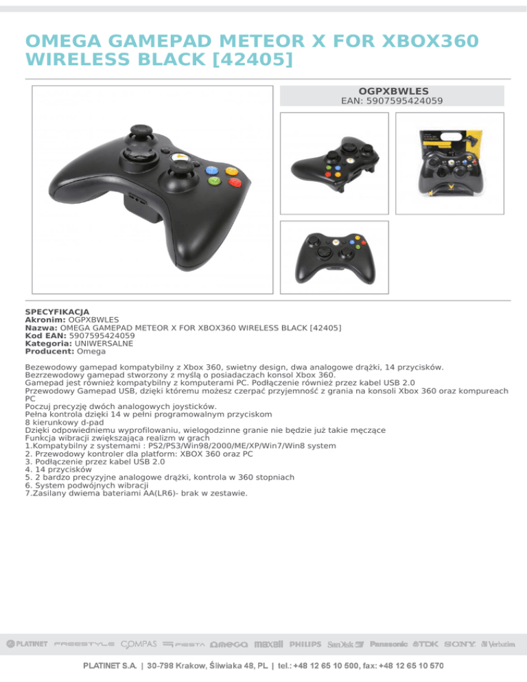 OMEGA GAMEPAD METEOR X FOR XBOX360 WIRELESS BLACK [42405] OGPXBWLES EAN: 5907595424059 SPECYFIKACJA Akronim: OGPXBWLES Nazwa: OMEGA GAMEPAD METEOR X FOR XBOX360 WIRELESS BLACK [42405] Kod EAN: 5907595424059 Kategoria: UNIWERSALNE Producent: Omega Bezewodowy gamepad kompatybilny z Xbox 360, swietny design, dwa analogowe drążki, 14 przycisków. Bezrzewodowy gamepad stworzony z myślą o posiadaczach konsol Xbox 360. Gamepad jest również kompatybilny z komputerami PC. Podłączenie również przez kabel USB 2.0 Przewodowy Gamepad USB, dzięki któremu możesz czerpać przyjemność z grania na konsoli Xbox 360 oraz kompureach PC Poczuj precyzję dwóch analogowych joysticków. Pełna kontrola dzięki 14 w pełni programowalnym przyciskom 8 kierunkowy d-pad Dzięki odpowiedniemu wyprofilowaniu, wielogodzinne granie nie będzie już takie męczące Funkcja wibracji zwiększająca realizm w grach 1.Kompatybilny z systemami : PS2/PS3/Win98/2000/ME/XP/Win7/Win8 system 2. Przewodowy kontroler dla platform: XBOX 360 oraz PC 3. Podłączenie przez kabel USB 2.0 4. 14 przycisków 5. 2 bardzo precyzyjne analogowe drążki, kontrola w 360 stopniach 6. System podwójnych wibracji 7.Zasilany dwiema bateriami AA(LR6)- brak w zestawie.