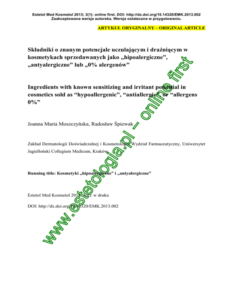 Running title: Kosmetyki „hipoalergiczne” i „antyalergiczne”
