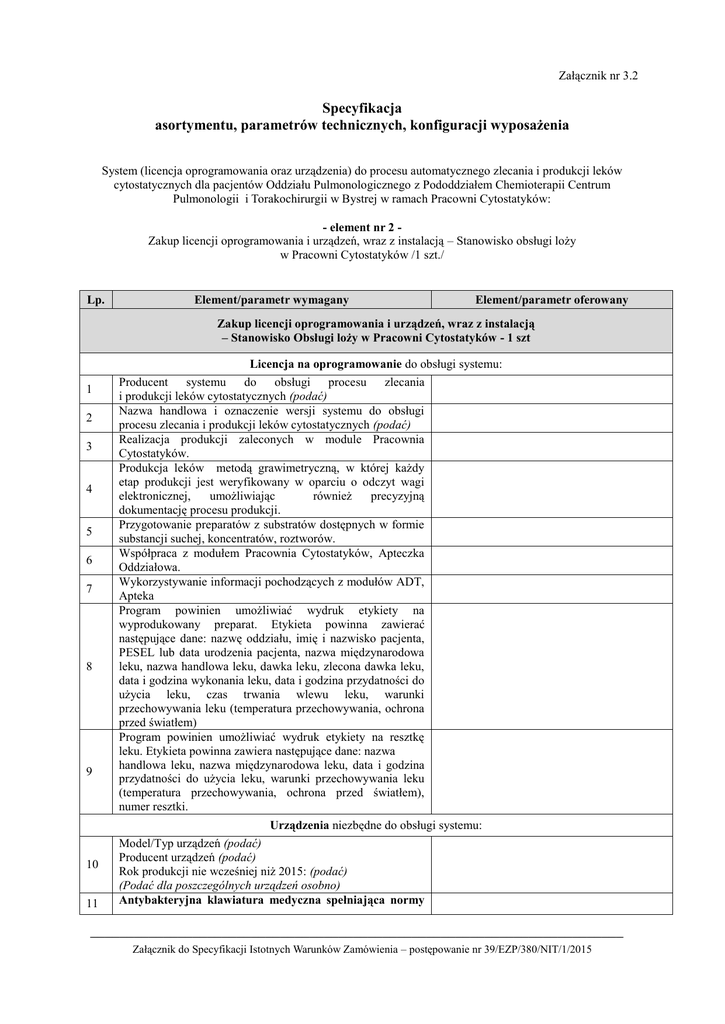 Załącznik nr 3.2 Specyfikacja asortymentu, parametrów technicznych, konfiguracji wyposażenia System (licencja oprogramowania oraz urządzenia) do procesu automatycznego zlecania i produkcji leków cytostatycznych dla pacjentów Oddziału Pulmonologicznego z Pododdziałem Chemioterapii Centrum Pulmonologii i Torakochirurgii w Bystrej w ramach Pracowni Cytostatyków: - element nr 2 Zakup licencji oprogramowania i urządzeń, wraz z instalacją – Stanowisko obsługi loży w Pracowni Cytostatyków /1 szt./ Lp. Element/parametr wymagany Element/parametr oferowany Zakup licencji oprogramowania i urządzeń, wraz z instalacją – Stanowisko Obsługi loży w Pracowni Cytostatyków - 1 szt Licencja na oprogramowanie do obsługi systemu: 1 2 3 4 5 6 7 8 9 Producent systemu do obsługi procesu zlecania i produkcji leków cytostatycznych (podać) Nazwa handlowa i oznaczenie wersji systemu do obsługi procesu zlecania i produkcji leków cytostatycznych (podać) Realizacja produkcji zaleconych w module Pracownia Cytostatyków. Produkcja leków metodą grawimetryczną, w której każdy etap produkcji jest weryfikowany w oparciu o odczyt wagi elektronicznej, umożliwiając również precyzyjną dokumentację procesu produkcji. Przygotowanie preparatów z substratów dostępnych w formie substancji suchej, koncentratów, roztworów. Współpraca z modułem Pracownia Cytostatyków, Apteczka Oddziałowa. Wykorzystywanie informacji pochodzących z modułów ADT, Apteka Program powinien umożliwiać wydruk etykiety na wyprodukowany preparat. Etykieta powinna zawierać następujące dane: nazwę oddziału, imię i nazwisko pacjenta, PESEL lub data urodzenia pacjenta, nazwa międzynarodowa leku, nazwa handlowa leku, dawka leku, zlecona dawka leku, data i godzina wykonania leku, data i godzina przydatności do użycia leku, czas trwania wlewu leku, warunki przechowywania leku (temperatura przechowywania, ochrona przed światłem) Program powinien umożliwiać wydruk etykiety na resztkę leku. Etykieta powinna zawiera następujące dane: nazwa handlowa leku, nazwa międzynarodowa leku, data i godzina przydatności do użycia leku, warunki przechowywania leku (temperatura przechowywania, ochrona przed światłem), numer resztki. Urządzenia niezbędne do obsługi systemu: 10 11 Model/Typ urządzeń (podać) Producent urządzeń (podać) Rok produkcji nie wcześniej niż 2015: (podać) (Podać dla poszczególnych urządzeń osobno) Antybakteryjna klawiatura medyczna spełniająca normy _________________________________________________________________________ Załącznik do Specyfikacji Istotnych Warunków Zamówienia – postępowanie nr 39/EZP/380/NIT/1/2015 IP 68 oraz NEMA6P dzięki czemu powinna przechodzić wszelkie procedury dezynfekcji i sterylizacji obowiązujące w służbie zdrowia. Wymagane minimalne parametry : Wyposażona w touchpad, klawiaturę numeryczną, klawisze funkcyjne F1-F12. Technologia przełączników "Golg-onGold". Możliwość podświetlenia klawiszy. Wzmacniania aluminiowa konstrukcja. Powierzchnia pokryta specjalnym tworzywem silikonowym odpornym na uszkodzenia mechaniczne oraz chemiczne. Obudowa szczelnie zamknięta zabezpieczająca przed pyłem, wodą, tłuszczem, korozją, środkami czyszczącymi oraz silnymi zabrudzeniami przemysłowymi. Funkcja "Clean Key" zabezpieczająca przed fałszywymi kliknięciami podczas czyszczenia. Interfejs PS2/USB. Interfejs użytkownika: QWERT, CTRL, ALT, WIN, DEL (polski standard). Certyfikaty: CE, FCC, RoHS. Poziom wytrzymałości IP68 dynamiczne. Długość przewodu: 2,5m. Mysz medyczna spełniająca normy IP 68 dzięki czemu powinna przechodzić wszelkie procedury dezynfekcji i sterylizacji obowiązujące w służbie zdrowia. Wymagane minimalne parametry : 12 Wytrzymała obudowa szczelnie zamknięta, pokryta specjalnym tworzywem silikonowym odpornym na uszkodzenia mechaniczne oraz chemiczne. Współczynnik wytrzymałości (szczelności): IP68 dynamiczne. Powierzchnia antybakteryjna. Odporne na kurz, zanurzenie w wodzie do 1m, silne zabrudzenia przemysłowe, czynniki chemiczne oraz korozję. Bardzo wysoka wytrzymałość mechaniczna (wandaloodporne). Wzmacniana konstrukcja z aluminium. Funkcja scroll. Przewód USB/PS2 o długości min. 2.5m. Dopuszczalna temperatura pracy -30C ~ +65C. Odporna na wstrząsy i wibracje. Typ montażu wolnostojące (desktop). Interfejs elektroniczny: PS/2 lub USB. Certyfikaty CE, FCC, RoHS. Extender portów komputera (VGA + USB + Audio + RS232) Wymagane minimalne parametry : 13 Połączenie lokalnej i zdalnej konsoli w oparciu o skrętkę min. kat 5e. Długość połączenia min 30 m. Zastosowany układ ASIC do zaawansowanej kontroli i korekcji błędów transmisji. Obsługa systemu z dwóch konsol lokalnej i zdalnej. Port RS232 w konsoli zdalnej do podłączenia urządzenia z tym portem. Pełne wsparcie dla toru audio (mikrofon i głośniki). Automatyczne wykrywanie aktywnej konsoli. Ochrona przeciw przepięciowa 8KV/15KV ESD. System kompensacji strat sygnału na długich odcinkach kabla. Obsługa wysokich rozdzielczości (do 1600 x 1200 @ 60Hz przy połączeniu do 150m). Obsługa sygnału video VGA, SVGA, SXGA (1280 x 1024) oraz UXGA (1600 x 1200). Dostosowany do montażu w szafach i rackach 19". Zgodność z systemami Win2k, XP, Windows 7 32 i 64, Vista, Linux, FreeBSD. _________________________________________________________________________ Załącznik do Specyfikacji Istotnych Warunków Zamówienia – postępowanie nr 39/EZP/380/NIT/1/2015 Drukarka etykiet - do stanowiska w Pracowni Cytostatyków po stronie loży. Wymagane minimalne parametry : 14 Technologia druku: termiczny / termotransferowy, Szybkość druku: 127mm /s. Rozdzielczość: 8 punktów na mm / 203 dpi. Języki programowania: Zainstalowane oba języki EPL i ZPL Konstrukcja: podwójne ścianki. Wymiana głowicy drukującej i wałka bez pomocy narzędzi. Automatyczna kalibracja nośników. Oprogramowanie do drukarki i sterowniki do systemu opera
