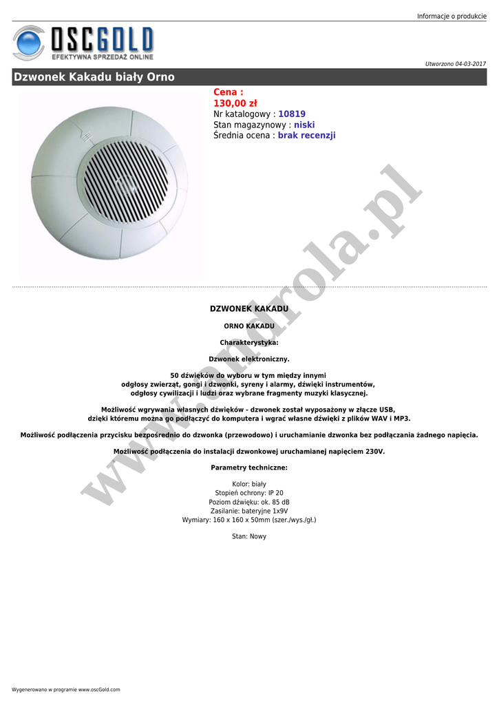 Informacje o produkcie Utworzono 04-03-2017 Dzwonek Kakadu biały Orno Cena : 130,00 zł ro la .p l Nr katalogowy : 10819 Stan magazynowy : niski Średnia ocena : brak recenzji DZWONEK KAKADU nd ORNO KAKADU Charakterystyka: Dzwonek elektroniczny. w .a 50 dźwięków do wyboru w tym między innymi odgłosy zwierząt, gongi i dzwonki, syreny i alarmy, dźwięki instrumentów, odgłosy cywilizacji i ludzi oraz wybrane fragmenty muzyki klasycznej. Możliwość wgrywania własnych dźwięków - dzwonek został wyposażony w złącze USB, dzięki któremu można go podłączyć do komputera i wgrać własne dźwięki z plików WAV i MP3. Możliwość podłączenia przycisku bezpośrednio do dzwonka (przewodowo) i uruchamianie dzwonka bez podłączania żadnego napięcia. w w Możliwość podłączenia do instalacji dzwonkowej uruchamianej napięciem 230V. Parametry techniczne: Kolor: biały Stopień ochrony: IP 20 Poziom dźwięku: ok. 85 dB Zasilanie: bateryjne 1x9V Wymiary: 160 x 160 x 50mm (szer./wys./gł.) Stan: Nowy Wygenerowano w programie www.oscGold.com w w .p l la ro nd w .a