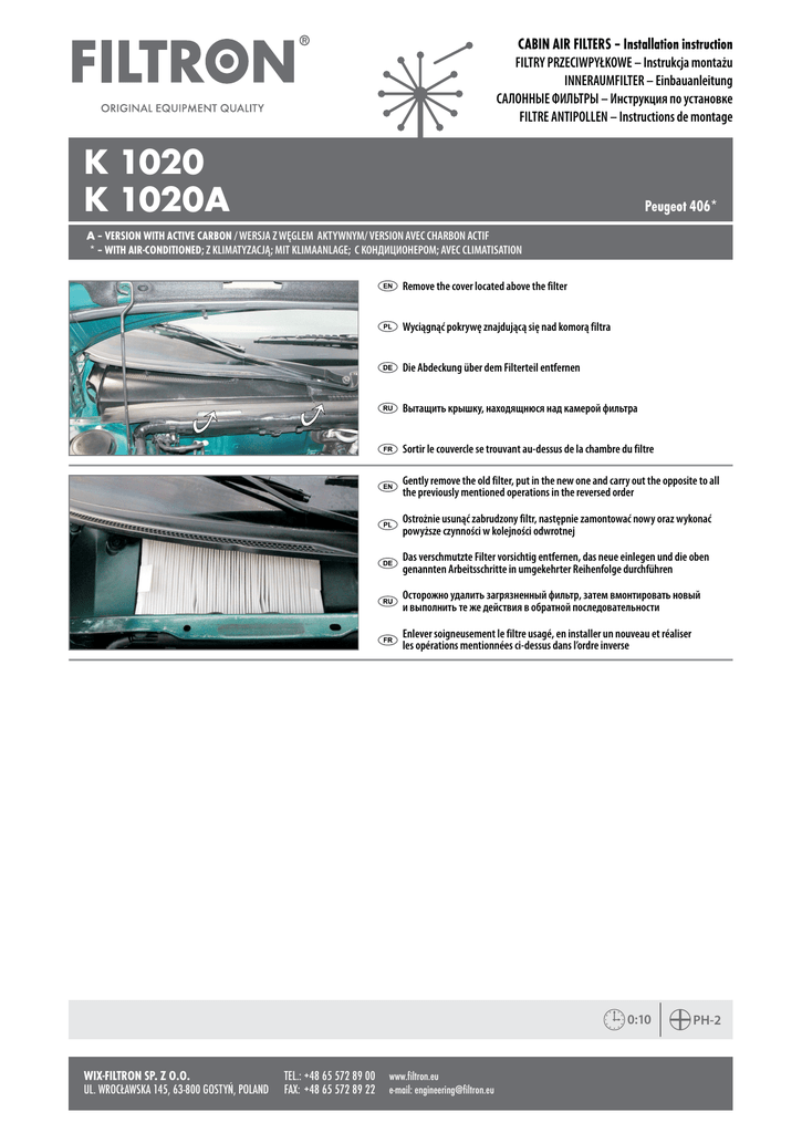 CABIN AIR FILTERS – Installation instruction FILTRY PRZECIWPYŁKOWE – Instrukcja montażu INNERAUMFILTER – Einbauanleitung САЛОННЫЕ ФИЛЬТРЫ – Инструкция по установке FILTRE ANTIPOLLEN – Instructions de montage K 1020 K 1020A Peugeot 406* A – VERSION WITH ACTIVE CARBON / WERSJA Z WĘGLEM AKTYWNYM/ VERSION AVEC CHARBON ACTIF * – WITH AIR-CONDITIONED; Z KLIMATYZACJĄ; MIT KLIMAANLAGE; С КОНДИЦИОНЕРОМ; AVEC CLIMATISATION Remove the cover located above the filter Wyciągnąć pokrywę znajdującą się nad komorą filtra Die Abdeckung über dem Filterteil entfernen Вытащить крышку, находящнюся над камерой фильтра Sortir le couvercle se trouvant au-dessus de la chambre du filtre Gently remove the old filter, put in the new one and carry out the opposite to all the previously mentioned operations in the reversed order Ostrożnie usunąć zabrudzony filtr, następnie zamontować nowy oraz wykonać powyższe czynności w kolejności odwrotnej Das verschmutzte Filter vorsichtig entfernen, das neue einlegen und die oben genannten Arbeitsschritte in umgekehrter Reihenfolge durchführen Осторожно удалить загрязненный фильтр, затем вмонтировать новый и выполнить те же действия в обратной последовательности Enlever soigneusement le filtre usagé, en installer un nouveau et réaliser les opérations mentionnées ci-dessus dans l’ordre inverse 0:10 WIX-FILTRON SP. Z O.O. TEL.:+48 65 572 89 00 www.filtron.eu UL. WROCŁAWSKA 145, 63-800 GOSTYŃ, POLAND FAX: +48 65 572 89 22 e-mail: [email protected] PH-2