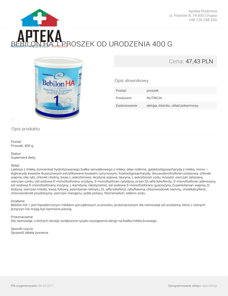 Apteka Rodzinna ul. Piastów 8, 74-500 Chojna +48 725 298 530 BEBILON HA 1 PROSZEK OD URODZENIA 400 G Cena: 47,43 PLN Opis słownikowy Postać proszek Producent NUTRICIA Zastosowanie alergia, dziecko, układ pokarmowy Opis produktu Postać Proszek, 400 g. Status Suplement diety. Skład Laktoza z mleka, koncentrat hydrolizowanego białka serwatkowego z mleka, oleje roślinne, galaktooligosacharydy z mleka, mono- i diglicerydy kwasów tłuszczowych estryfikowane kwasem cytrynowym, fruktooligosacharydy, dwuwodorofosforan potasowy, chlorek wapnia, olej rybi, chlorek choliny, kwas L-askorbinowy, lecytyna sojowa, tauryna, L-askorbinian sodu, inozytol, siarczan żelazawy, siarczan cynku, sól sodowa 5'-monofosforanu urydyny, 5'-monofosforan cytydyny, octan DL-alfa-tokoferolu, 5'-monofosforan adenozyny, sól sodowa 5'-monofosforanu inozyny, L-karnityna, nikotynamid, sól sodowa 5'-monofosforanu guanozyny, D-pantotenian wapnia, Dbiotyna, siarczan miedzi, kwas foliowy, palmitynian retinylu, DL-alfa-tokeferol, ryboflawina, chlorowodorek tiaminy, cholekalcyferol, chlorowodorek pirydoksyny, siarczan manganu, jodek potasu, fitomenadion, selenin sodu. Działanie Bebilon HA 1 jest hipoalericznym mlekiem początkowym w proszku, przeznaczonym dla niemowląt od urodzenia, które z różnych przyczyn nie mogą być karmione piersią. Przeznaczenie Dla niemowląt, u których istnieje zwiększone ryzyko wystąpienia alergii na białka mleka krowiego. Sposób użycia Sprawdź tabelę żywienia. Plik wygenerowano: 04-03-2017 Powered by TCPDF (www.tcpdf.org) Oprogramowanie sklepu: AptusShop