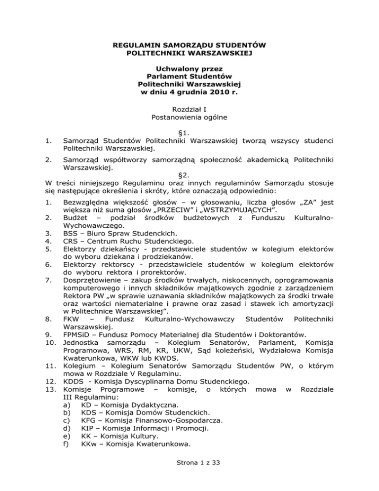 REGULAMIN SAMORZĄDU STUDENTÓW POLITECHNIKI WARSZAWSKIEJ Uchwalony przez Parlament Studentów Politechniki Warszawskiej w dniu 4 grudnia 2010 r. Rozdział I Postanowienia ogólne 1. §1. Samorząd Studentów Politechniki Warszawskiej tworzą wszyscy studenci Politechniki Warszawskiej. 2. Samorząd współtworzy samorządną społeczność akademicką Politechniki Warszawskiej. §2. W treści niniejszego Regulaminu oraz innych regulaminów Samorządu stosuje się następujące określenia i skróty, które oznaczają odpowiednio: 1. 2. 3. 4. 5. 6. 7. 8. 9. 10. 11. 12. 13. Bezwzględna większość głosów – w głosowaniu, liczba głosów „ZA” jest większa niż suma głosów „PRZECIW” i „WSTRZYMUJĄCYCH”. Budżet – podział środków budżetowych z Funduszu KulturalnoWychowawczego. BSS – Biuro Spraw Studenckich. CRS – Centrum Ruchu Studenckiego. Elektorzy dziekańscy - przedstawiciele studentów w kolegium elektorów do wyboru dziekana i prodziekanów. Elektorzy rektorscy - przedstawiciele studentów w kolegium elektorów do wyboru rektora i prorektorów. Dosprzętowienie – zakup środków trwałych, niskocennych, oprogramowania komputerowego i innych składników majątkowych zgodnie z zarządzeniem Rektora PW „w sprawie uznawania składników majątkowych za środki trwałe oraz wartości niematerialne i prawne oraz zasad i stawek ich amortyzacji w Politechnice Warszawskiej”. FKW – Fundusz Kulturalno-Wychowawczy Studentów Politechniki Warszawskiej. FPMSiD – Fundusz Pomocy Materialnej dla Studentów i Doktorantów. Jednostka samorządu – Kolegium Senatorów, Parlament, Komisja Programowa, WRS, RM, KR, UKW, Sąd koleżeński, Wydziałowa Komisja Kwaterunkowa, WKW lub KWDS. Kolegium – Kolegium Senatorów Samorządu Studentów PW, o którym mowa w Rozdziale V Regulaminu. KDDS - Komisja Dyscyplinarna Domu Studenckiego. Komisje Programowe – komisje, o których mowa w Rozdziale III Regulaminu: a) KD – Komisja Dydaktyczna. b) KDS – Komisja Domów Studenckich. c) KFG – Komisja Finansowo-Gospodarcza. d) KIP – Komisja Informacji i Promocji. e) KK – Komisja Kultury. f) KKw – Komisja Kwaterunkowa. Strona 1 z 33 14. 15. 16. 17. 18. 19. 20. 21. 22. 23. 24. 25. 26. 27. 28. 29. 30. 31. 32. 33. 34. 35. 36. 37. 38. g) KS – Komisja Socjalna. h) KSiT – Komisja Sportu i Turystyki. i) KZ – Komisja Zagraniczna. Komisja Wyborcza- WKW, KWDS – Wydziałowa Komisja Wyborcza, Komisja Wyborcza Domu Studenckiego. KR – Komisja Regulaminowa, o której mowa w o Rozdziale IX Regulaminu. Kworum - liczba osób konieczna do podjęcia decyzji przez organ Samorządu w omawianej sprawie zgodnie z §13 Regulaminu. Lista ogólnouczelniana – stowarzyszenie studenckie, organizacja studencka, koło naukowe lub grupa tych jednostek startująca w wyborach. Materiały wyborcze – plakaty, ulotki promujące kandydatów, przygotowane przez kandydatów i oznaczone w sposób niepozostawiający wątpliwości, co do właściciela materiałów. Media Samorządu – studenckie media informacyjne Samorządu, o których mowa w §46. Regulaminu. Pod pojęciem Media rozumie się następujące organy Samorządu: a) Radio Aktywne. b) Miesięcznik Kulturalny Studentów Politechniki Warszawskiej “i.pewu”. c) Portal Studencki Polibuda.info. d) Studencka Telewizja Internetowa TVPW. Obwieszczenie wyborcze – ogłoszenia, informacje o kandydatach, sposobie głosowania oraz inne materiały niebędące elementami kampanii wyborczej, dostarczane przez UKW. Parlament – Parlament Studentów PW, o którym mowa w Rozdziale II Regulaminu. Pretendent – student startujący w wyborach do Kolegium, o którym mowa w §48. Regulaminu. Regulamin – Regulamin Samorządu Studentów PW. RKN – Rada Kół Naukowych. Relacja Fotografowanie, sporządzanie artykułów prasowych, transmitowanie lub retransmitowanie obrad. RM – Rada Mieszkańców Domu Studenckiego, o której mowa w Rozdziale VII Regulaminu. Samorząd, SSPW – Samorząd Studentów Politechniki Warszawskiej. Sąd – Sąd Koleżeński, o którym mowa w Rozdziale X Regulaminu. Senat – Senat Politechniki Warszawskiej. Senatorowie Studenccy – studenci, członkowie Senatu PW, o których mowa w Rozdziale IV Regulaminu. Skład regulaminowy Komisji- liczba członków danej Komisji wynikająca z §20. Skład regulaminowy Parlamentu- liczba członków Parlamentu wynikająca z §8, ust. 1, z wyłączeniem ust. 1 lit. a) podczas głosowania kandydatur Pretendentów. System internetowy - systeme elektronicznego obiegu dokumentów i jego moduły. Terminarz wyborczy – terminarz uchwalony przez Parlament, zgodnie z którym przeprowadza się wybory. Uczelnia, PW – Politechnika Warszawska. UKW – Uczelniany Komisarz Wyborczy, o którym mowa w §49. Regulaminu. Ustawa – Ustawa Prawo o Szkolnictwie Wyższym. WRS – Wydziałowa Rada Samorządu Wydziału lub Kolegium. Strona 2 z 33 39. Wydział – Wydział lub Kolegium Uczelni, które zgodnie ze statutem PW organizuje i prowadzi samodzielną działalność dydaktyczną. 40. Zakończenie studiów – ukończenie studiów, rezygnacja albo skreślenie z listy studentów. Zakończeniem studiów nie jest ukończenie studiów pierwszego stopnia, gdy student kontynuuje studia drugiego stopnia, po ukończeniu studiów pierwszego stopnia, w okresie nie dłuższym niż 4 miesiące oraz pisemnym zgłoszeniu chęci pozostania w strukturach Samorządu do UKW przed obroną. 41. Zwykła większość głosów – w głosowaniu, liczba głosów „ZA” jest większa niż liczba głosów „PRZECIW”. §3. Podstawową jednostką redakcyjną aktu prawa wewnętrznego Samorządu jest paragraf („§”). Paragraf może być dzielony na ustępy („ust.”), ustęp na litery („lit.”), litera na tiret („-”). Dodatkowo akt może być dzielony na rozdziały numerowane rzymsko i posiadające nazwy ułatwiające poruszanie się po dokumencie. na §4. podstawie Ustawy, 1. Samorząd działa Regulaminu. Statutu PW 