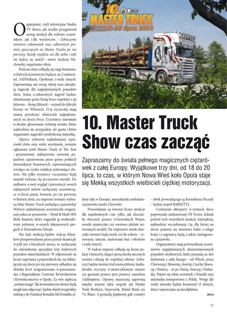 O rganizator, czyli telewizyjne Studio TV Bravo, jak zwykle przygotował szereg atrakcji dla widzów, uczestników, jak i dla wystawców. – Zobaczymy mnóstwo ciekawostek oraz całkowitych premier, goszczących na Master Trucku po raz pierwszy. Każdy znajdzie coś dla siebie i nikt nie będzie się nudził – mówi Andrzej Wachowski, organizator zlotu. Podczas zlotu odbędą się targi branżowe, w których uczestniczyć będą m. in. Continental, SAFHolland, Opoltrans i wielu innych. Zaprezentują oni swoją ofertę oraz ufundują nagrody dla najpiękniejszych pojazdów zlotu. Jedną z ciekawszych nagród będzie, ufundowany przez firmę Iveco wspólnie z jej delerem – firmą Siltruck – wyjazd do fabryki Ferrari we Włoszech. O tę wycieczkę mają szansę powalczyć właściciele najpiękniejszych na zlocie Iveco. Uczestnicy natomiast w drodze głosowania wyłonią stoisko, które najbardziej im przypadnie do gustu i które organizator nagrodzi symboliczną statuetką. Oprócz wyborów najładniejszej ciężarówki zlotu oraz wielu wyróżnień, zostanie ogłoszony tytuł Master Truck of The Year – przyznawany najlepszemu nowemu pojazdowi ciężarowemu przez grono polskich dziennikarzy branżowych, reprezentujących wiodące na rynku redakcje patronujące zlotowi. Nie tylko wystawcy i uczestnicy będą musieli wykazać się poczuciem estetyki. Do zadbania o swój wygląd i prezentacji swoich najlepszych atutów zachęcamy uczestniczące w zlocie panie, bowiem, po raz pierwszy w historii zlotu, na imprezie zostanie wybrana Miss Master Truck niebędąca ciężarówką! Wybory najładniejszej uczestniczki zorganizuje jeden ze sponsorów – Hotel & Medi-SPA Biały Kamień, który nagrodzi ją weekendowym pobytem w swoich luksusowych progach w Świeradowie Zdroju. Nie lada atrakcją będzie Aukcja Klasyków przeprowadzona przez portal oleauto.pl. A jeśli już o klasykach mowa, to zachęcamy do odwiedzenia specjalnej loży kultowych pojazdów amerykańskich. W odpowiedzi na liczne zapytania z poprzednich lat, na zbliżającym się zlocie po raz pierwszy odbędzie się zbiórka krwi zorganizowana w porozumieniu z Regionalnym Centrum Krwiodawstwa i Krwiolecznictwa w Opolu. Za wóz zaplecza „technicznego” dla krwiodawców, którzy będą mogli tam odpocząć, będzie służył oryginalny, należący do Fundacji Ronalda McDonalda, je- 10. Master Truck Show czas zacząć Zapraszamy do świata pełnego magicznych ciężarówek z całej Europy. Wyjątkowe trzy dni, od 18 do 20 lipca, to czas, w którym Nowa Wieś koło Opola staje się Mekką wszystkich wielbicieli ciężkiej motoryzacji. dyny taki w Europie, amerykański ambulansciężarówka marki Chevrolet. Przewidziane są również liczne atrakcje dla najmłodszych i nie tylko, jak chociażby obecność postaci z Gwiezdnych Wojen, wesołe miasteczko czy wystawa zdalnie sterowanych modeli. Na większości stoisk dzieciaki również będą miały coś do roboty – rysowanie, tatuaże, malowanie buź i włosków i wiele innych. W trakcie imprezy odbędą się liczne pokazy i koncerty, dające sporą dawkę mocnych wrażeń i okazję do wspólnej zabawy. Zobaczyć będzie można trial motocyklowy, kaskaderskie wyczyny w motocyklowym stuncie czy gaszenie pożaru przy pomocy samolotu i helikoptera. Oprawę muzyczną zapewnią między innymi takie zespoły jak Honky Tonk Brothers, Fayerwerk, Rafael Band czy 7A Blues. A gwiazdą piątkowej gali country – obok prowadzącego ją Korneliusza Pacudy – będzie zespół BABSZTYL. Codzienne afterparty w rytmach disco poprowadzi utalentowany DJ Vector. Jednak pośród tych wszystkich atrakcji, największą, najbardziej wyczekiwaną i tą, dla której na zlocie pojawia się mnóstwo ludzi z całego kraju i z zagranicy, będą, a jakże, tuningowane ciężarówki. Organizatorzy mają potwierdzone uczestnictwo najpiękniejszych zkustomizowanych pojazdów użytkowych, które przyjadą na zlot dosłownie z całej Europy – od Włoch, przez Chorwację i Słowenię, Austrię, Czechy, Słowację i Niemcy – aż po Danię, Szwecję i Finlandię. Pojawi się także uczestnik z Irlandii oraz śmietanka transportowa z Polski. Wstęp dla osoby dorosłej będzie kosztował 15 złotych, dzieci wpuszczane są nieodpłatnie. (Am) 11