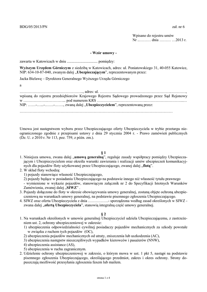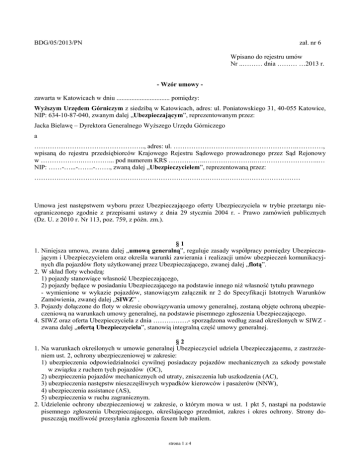 BDG/05/2013/PN zał. nr 6 Wpisano do rejestru umów Nr ..……… dnia ……… …2013 r. - Wzór umowy zawarta w Katowicach w dniu ................................ pomiędzy: Wyższym Urzędem Górniczym z siedzibą w Katowicach, adres: ul. Poniatowskiego 31, 40-055 Katowice, NIP: 634-10-87-040, zwanym dalej „Ubezpieczającym”, reprezentowanym przez: Jacka Bielawę – Dyrektora Generalnego Wyższego Urzędu Górniczego a ………………………………………….., adres: ul. ………………………….…………………….…………, wpisaną do rejestru przedsiębiorców Krajowego Rejestru Sądowego prowadzonego przez Sąd Rejonowy w ……………….…………... pod numerem KRS ……………..…………………..………………………..… NIP: ……-…...-…….-……., zwaną dalej „Ubezpieczycielem”, reprezentowaną przez: ………………………………………………………………………………………………………… Umowa jest następstwem wyboru przez Ubezpieczającego oferty Ubezpieczyciela w trybie przetargu nieograniczonego zgodnie z przepisami ustawy z dnia 29 stycznia 2004 r. - Prawo zamówień publicznych (Dz. U. z 2010 r. Nr 113, poz. 759, z późn. zm.). §1 1. Niniejsza umowa, zwana dalej „umową generalną”, reguluje zasady współpracy pomiędzy Ubezpieczającym i Ubezpieczycielem oraz określa warunki zawierania i realizacji umów ubezpieczeń komunikacyjnych dla pojazdów floty użytkowanej przez Ubezpieczającego, zwanej dalej „flotą”. 2. W skład floty wchodzą: 1) pojazdy stanowiące własność Ubezpieczającego, 2) pojazdy będące w posiadaniu Ubezpieczającego na podstawie innego niż własność tytułu prawnego - wymienione w wykazie pojazdów, stanowiącym załącznik nr 2 do Specyfikacji Istotnych Warunków Zamówienia, zwanej dalej „SIWZ” . 3. Pojazdy dołączone do floty w okresie obowiązywania umowy generalnej, zostaną objęte ochroną ubezpieczeniową na warunkach umowy generalnej, na podstawie pisemnego zgłoszenia Ubezpieczającego. 4. SIWZ oraz oferta Ubezpieczyciela z dnia …………….- sporządzona według zasad określonych w SIWZ zwana dalej „ofertą Ubezpieczyciela”, stanowią integralną część umowy generalnej. §2 1. Na warunkach określonych w umowie generalnej Ubezpieczyciel udziela Ubezpieczającemu, z zastrzeżeniem ust. 2, ochrony ubezpieczeniowej w zakresie: 1) ubezpieczenia odpowiedzialności cywilnej posiadaczy pojazdów mechanicznych za szkody powstałe w związku z ruchem tych pojazdów (OC), 2) ubezpieczenia pojazdów mechanicznych od utraty, zniszczenia lub uszkodzenia (AC), 3) ubezpieczenia następstw nieszczęśliwych wypadków kierowców i pasażerów (NNW), 4) ubezpieczenia assistance (AS), 5) ubezpieczenia w ruchu zagranicznym. 2. Udzielenie ochrony ubezpieczeniowej w zakresie, o którym mowa w ust. 1 pkt 5, nastąpi na podstawie pisemnego zgłoszenia Ubezpieczającego, określającego przedmiot, zakres i okres ochrony. Strony dopuszczają możliwość przesyłania zgłoszenia faxem lub mailem. strona 1 z 4 3. Do ubezpieczeń komunikacyjnych, o których mowa w ust. 1, mają zastosowanie: 1) w zakresie ubezpieczenia OC - ustawa z dnia 22 maja 2003 r. o ubezpieczeniach obowiązkowych, Ubezpieczeniowym Funduszu Gwarancyjnym i Polskim Biurze Ubezpieczycieli Komunikacyjnych (Dz. U. Nr 124, poz. 1152, z późn. zm.), 2) w zakresie ubezpieczenia AC - ogólne warunki ubezpieczenia pojazdów mechanicznych od utraty, zniszczenia lub uszkodzenia, ……………………………………………… z dnia ……………………r., 3) w zakresie ubezpieczenia NNW - ogólne warunki ubezpieczenia następstw nieszczęśliwych wypadków kierowcy i pasażerów pojazdu mechanicznego, …..……………………………z dnia……………….. r., 4) w zakresie ubezpieczenia AS - ogólne warunki ubezpieczenia assistance………………………………. z dnia ………………………… r., 5) w zakresie ubezpieczenia w ruchu zagranicznym - ogólne warunki ubezpieczenia,….…………..…….. z dnia ………………………… r. 4. W przypadku sprzeczności pomiędzy postanowieniami umowy generalnej, a ogólnymi warunkami ubezpieczenia, o których mowa w ust. 3, stosuje się postanowienia umowy generalnej, chyba że ogólne warunki ubezpieczenia są korzystniejsze dla Ubezpieczającego. §3 1. Umowa generalna obowiązuje od dnia 20 marca 2013 r. do dnia 19 marca 2014 r. 2. Dla pojazdów wchodzących w skład floty okres ubezpieczenia, w zakresie o którym mowa w § 2 ust. 1 pkt 1-4, trwa 12 miesięcy i rozpoczyna się od dnia następnego po zakończeniu aktualnej umowy ubezpieczenia. 3. Dla pojazdów dołączanych do floty okres ubezpieczenia, w zakresie o którym mowa w § 2 ust. 1 pkt 1-4, trwa 12 miesięcy i rozpoczyna się od: 1) momentu zarejestrowania pojazdu na Ubezpieczającego - pod warunkiem dokonania zgłoszenia, o którym mowa w § 1 ust. 3, najpóźniej w dniu rejestracji; 2) momentu zgłoszenia, o którym mowa w § 1 ust. 3 - w przypadku niedokonania zgłoszenia w dniu, o którym mowa w pkt 1. 4. Ubezpieczyciel potwierdzi fakt zawarcia umów ubezpieczeń komunikacyjnych na warunkach umowy generalnej, wystawiając następujące dokumenty ubezpieczenia: generalną polisę ubezpieczenia OC/AC/NNW/AS, indywidualne polisy ubezpieczenia OC/AC/NNW/AS dla każdego pojazdu objętego ubezpieczeniem, indywidualne potwierdzenia ubezpieczenia OC/AC/NNW/AS dla każdego pojazdu objętego ubezpieczeniem, a w przypadku zgłoszenia do ubezpieczenia w ruchu zagranicznym - indywidualną polisę oraz potwierdzenie ubezpieczenia w ruchu zagranicznym. 5. Ubezpieczyciel zobowiązany jest do wystawienia i dostarczenia Ubezpieczającemu dokumentów ubezpieczenia dla pojazdów floty - nie później niż w terminie 3 dni przed rozpoczęciem okresu ubezpieczenia, a dla pojazdów dołączanych do floty i w przypadku ubezpieczenia w ruchu 