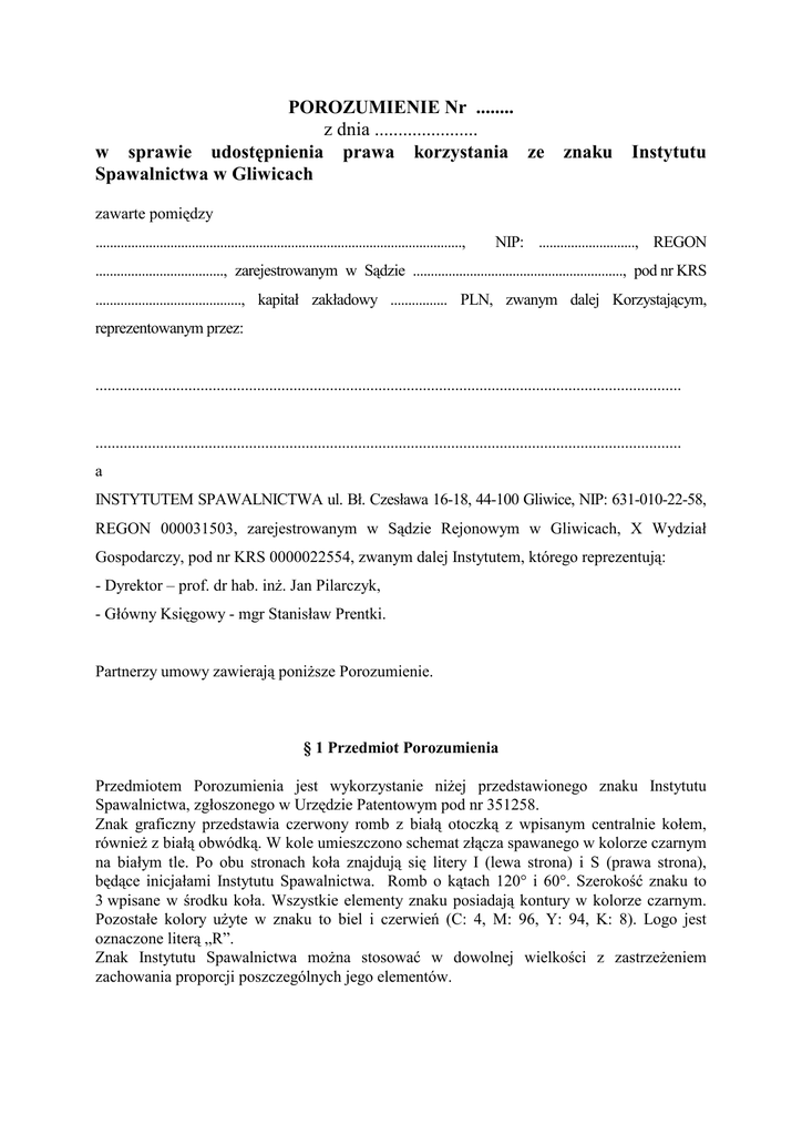 POROZUMIENIE Nr ........ z dnia ...................... w sprawie udostępnienia prawa korzystania ze Spawalnictwa w Gliwicach znaku Instytutu zawarte pomiędzy ......................................................................................................., NIP: ..........................., REGON ...................................., zarejestrowanym w Sądzie ..........................................................., pod nr KRS ........................................., kapitał zakładowy ................ PLN, zwanym dalej Korzystającym, reprezentowanym przez: ................................................................................................................................................. ................................................................................................................................................. a INSTYTUTEM SPAWALNICTWA ul. Bł. Czesława 16-18, 44-100 Gliwice, NIP: 631-010-22-58, REGON 000031503, zarejestrowanym w Sądzie Rejonowym w Gliwicach, X Wydział Gospodarczy, pod nr KRS 0000022554, zwanym dalej Instytutem, którego reprezentują: - Dyrektor – prof. dr hab. inŜ. Jan Pilarczyk, - Główny Księgowy - mgr Stanisław Prentki. Partnerzy umowy zawierają poniŜsze Porozumienie. § 1 Przedmiot Porozumienia Przedmiotem Porozumienia jest wykorzystanie niŜej przedstawionego znaku Instytutu Spawalnictwa, zgłoszonego w Urzędzie Patentowym pod nr 351258. Znak graficzny przedstawia czerwony romb z białą otoczką z wpisanym centralnie kołem, równieŜ z białą obwódką. W kole umieszczono schemat złącza spawanego w kolorze czarnym na białym tle. Po obu stronach koła znajdują się litery I (lewa strona) i S (prawa strona), będące inicjałami Instytutu Spawalnictwa. Romb o kątach 120° i 60°. Szerokość znaku to 3 wpisane w środku koła. Wszystkie elementy znaku posiadają kontury w kolorze czarnym. Pozostałe kolory uŜyte w znaku to biel i czerwień (C: 4, M: 96, Y: 94, K: 8). Logo jest oznaczone literą „R”. Znak Instytutu Spawalnictwa moŜna stosować w dowolnej wielkości z zastrzeŜeniem zachowania proporcji poszczególnych jego elementów. INSTYTUT SPAWALNICTWA w Gliwicach INSTYTUT SPAWALNICTWA w Gliwicach ® ® ŚWIADECTWO KWALIFIKACYJNE NR ................... ŚWIADECTWO KWALIFIKACYJNE NR .......................... § 2 Świadczenia Instytutu Spawalnictwa Instytut Spawalnictwa wyraŜa zgodę na korzystanie ze znaku Instytutu dla celów reklamowych i marketingowych (pisma, prospekty, oferty itp.). § 3 Zakres prawa korzystania ze znaku Instytutu Spawalnictwa 1. Zgoda na korzystanie ze znaku Instytutu przedstawionego w § 1 jest waŜna wówczas, kiedy Korzystający posiada waŜne Świadectwo Kwalifikacyjne Instytutu. 2. Korzystający moŜe stosować znak Instytutu tylko łącznie z numerem Świadectwa Kwalifikacyjnego. 3. Kontrola sposobu wykorzystania znaku Instytutu na pismach, materiałach reklamowych itp. przeprowadzana będzie podczas wizytacji przedstawiciela Komisji Kwalifikowania Zakładów Przemysłowych Instytutu Spawalnictwa u Korzystającego, związanych z przedłuŜaniem waŜności Świadectwa Kwalifikacyjnego. 4. Prawo korzystania ze znaku Instytutu dotyczy tylko Korzystającego, posiadającego Świadectwo Kwalifikacyjne Instytutu Spawalnictwa i nie moŜe być przekazywane innym firmom (np. dostawcom). 5. Znak Instytutu moŜe być stosowany tylko przez Korzystającego razem z jego nazwą lub znakiem firmowym. Znak Instytutu nie moŜe być nanoszony na wyroby lub opakowania wyrobów Korzystającego. § 4 Odpowiedzialność Instytut nie bierze odpowiedzialności za nieograniczone wykorzystanie znaku Instytutu do celów reklamowych. § 5 Wygaśnięcie prawa korzystania ze znaku Instytutu Spawalnictwa Prawo korzystania ze znaku Instytutu przedstawionego w § 1 niniejszego porozumienia wygasa natychmiast kiedy: zmiany zachodzące u Korzystającego powodujące uniewaŜnienie Świadectwa Kwalifikacyjnego, nie zostaną zgłoszone do Komisji Kwalifikowania Zakładów Przemysłowych, Świadectwo Kwalifikacyjne z waŜnych powodów zostanie uniewaŜnione lub nie zostanie przedłuŜone przez Komisję Kwalifikowania Zakładów Przemysłowych, znak Instytutu zostanie wykorzystany niezgodnie z niniejszym Porozumieniem, Korzystający zrezygnuje z posiadania Świadectwa Kwalifikacyjnego. § 6 Opłata Wysokość opłaty za prawo korzystania ze znaku Instytutu wynosi 600,- zł (słownie złotych sześćset) + 22% VAT (opłata jednorazowa). § 7 Czasokres waŜności Porozumienia 1. Niniejsze Porozumienie jest waŜne po jego podpisaniu przez kaŜdą ze Stron do czasu waŜności Świadectwa Kwalifikacyjnego oraz po jego przedłuŜeniu wraz z aktualnym numerem Świadectwa Kwalifikacyjnego. 2. Obie Strony zastrzegają sobie prawo wcześniejszego wypowiedzenia Porozumienia. § 8 Postanowienia końcowe 1. Zmiany lub uzupełnienia do niniejszego Porozumienia wymagają formy pisemnej. 2. JeŜeli którekolwiek z ustaleń niniejszego Porozumienia częściowo lub w całości straci waŜność, pozostała część Porozumienia pozostaje aktualna, przy czym obie Strony zobowiązane są do bezzwłocznej jego aktualizacji. 3. Sprawy sporne podlegają rozstrzygnięciu przez Sąd właściwy dla siedziby Instytutu Spawalnictwa. INSTYTUT SPAWALNICTWA KORZYSTAJĄCY .................................................................. .............................................................. ................................................................. ...............................................................