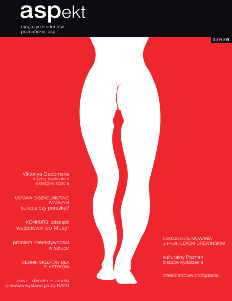 magazyn studentów poznańskiej asp 0|04|09 Viktoriya Gadomska między poznaniem a rzeczywistością USTAWA O SZKOLNICTWIE WYŻSZYM sukces czy porażka? KONKURS: zdobądź wejściówki do Muzy! problem interaktywności w sztuce CENNIK SKLEPÓW DLA PLASTYKÓW pożar - dziecko = zapałki pierwsza wystawa grupy HAPS LEKCJA ODEJMOWANIA Z PROF. LEXEM DREWIŃSKIM kulturalny Poznań bieżące wydarzenia czekoladowe pożądanie Fundusze Europejskie szansą w dobie kryzysu podyskutuj na forum zadaj pytanie ekspertowi przeczytaj przewodnik Partnerzy Społeczni a Fundusze Europejskie" " weź udział w konferencjach Czas na Fundusze Europejskie i Polskę marzeń" " Projekt realizowany przez Komisję Krajową NSZZ Solidarność" w ramach dotacji przyznanej przez Ministerstwo Rozwoju Regionalnego. Partnerzy projektu: Niezależne Zrzeszenie Studentów Stowarzyszenie Instytut Promocji Nauczycieli „Solidarność" Tysol Sp. z o.o. na warsztacie: na okładce: Lex Drewiński, plakat do sztuki Antoniusz i Kleopatra 4 Galeria Przychodnia � nowy adres na kulturalnej mapie Poznania 6 Z wyższej półki: Problem z interaktywnością współczesnych dzieł sztuki 8 Artysta numeru: LEX DREWIŃSKI 12 Wywiad z autorką nowego logo ASP Viktoriyą Gadomską 14 Ku harmonii Dalekiego Wschodu � wystawa Konstancji Pleskaczyńskiej 15 Lepiej być nie może � nowa ustawa o szkolnictwie wyższym 16 Śladami wielkich � fascynujące psychozy Ingmara Bergmana 18 Sexy Chocolate czyli o rozpuście podniebienia 20 bieżące wystawy, koncerty, kino, spektakle, festiwale THE RIGHT OF SPRING 21 marca. Początek kalendarzowej wiosny, najbardziej optymistycznej pory roku. Słońce nieśmiało spogląda zza chmur, rozleniwiony długim zimowym snem świat wystawia swe przemarznięte lędźwie na pierwsze ciepłe promienie, nabierając sił przed wydaniem na świat kolejnego potomstwa o niezliczonej ilości barw, zapachów i smaków. W ten magiczny czas z głowami pełnymi pomysłów i ambitnych planów studenci Akademii Sztuk Pięknych ruszają z nowym przedsięwzięciem � MAGAZYNEM O NAS I DLA NAS. Wiele czasu upłynęło zanim udalo nam się powołać do życia ASPekt i zdajemy sobie sprawę, jak wielu rzeczy musimy się jeszcze nauczyć. Ale mamy nadzieję, że będzie to gazetka, która stanie się dla Was polem do popisów dziennikarsko - felietonistycznych, możliwością zaistnienia w środowisku studencko-artystycznym (co miesiąc będziemy umieszczać na łamach ASPektu Wasze prace) oraz sposobem na nudę w trakcie czekania na kolejną korektę;) Jesteśmy otwarci na współpracę oraz wszelkie sugestie, przesyłajcie swoje pomysły, informacje o planowanych wydarzeniach kulturalno-rozrywkowych, artykuły, felietony itp. Czekamy z niecierpliością. Miłej lektury, redaktor naczelna Karolina Gumienna [email protected] Kto za tym stoi - redakcja ASPektu: |redaktor naczelna| Karolina Gumienna |projekt graficzny| Karolina Gumienna Zofia Kuligowska, |autorzy artykułów| 22 Ostatki student studentowi czyli wymiana dóbr (nie tylko) materialnych Zuza Arkuszyńska, Katarzyna Czarnecka, Robert Bodnar, Marta Bosowska, Karolina Gumienna, Zofia Krzykawska, Milena Sobolewska, Jarosław 23 W obronie studenckiego portfela � cennik sklepów dla plastyków Umiński, Barbara Wnęk, Emilia Zięba pożar - dziecko = zapałki bunt przeciw sztuce typu stereo (czyt. stereotypu) Nie jest łatwo w piątkę wymyślić tytuł pierwszej wystawy w nowo powstającej galerii. To akurat wiedzieliśmy od zawsze. Usiedliśmy więc i zaczęliśmy rozmawiać. Każdy wymieniał tematy, o jakich chciałby opowiedzieć, gdyby przygotowywał tę wystawę sam. Wszyscy jednak podkreślaliśmy kontekst miejsca i tego, że takie zespołowe działanie jest dla nas eksperymentem. Swobodny i rozrywkowy charakter przestrzeni klubu Eskulap wydał nam się szczególnie ciekawy w kontekście odbioru sztuki. Ulokowanie galerii wewnątrz klubu, ale jednocześnie pozostawienie jej w odrębnej i bezpiecznej przestrzeni, do której przenikają jedynie dźwięki i obraz z zewnątrz � to wszystko wydało nam się tym, co poza interaktywnym charakterem prac mogłoby prowokować do nieskrępowanego odbioru, czyli dotykania, tańczenia, czy zbliżania się do prezentowanych tam dzieł. Od dawna marzyliśmy o takim obchodzeniu się ze sztuką, zwłaszcza z pracami operującymi nowymi mediami, realizacjami prowokującymi bardziej namacalny, czasem intymny wręcz, kontakt. Właśnie, skąd ten utarty schemat zachowania w muzeum? Skąd to „nie dotykać!” ? Postanowiliśmy więc to zmienić, choć nie mieliśmy i nie mamy zamiaru na siłę dokonywać wielkiego przewrotu. Preferujemy rewolucje, które dokonują się od wewnątrz, krok po kroku. Tu właśnie pojawiło się pole do działania. W naszych dyskusjach kilkakrotnie przewinął się problem ambiwalencji dobra i zła, więc postanowiliśmy wykorzystać jedno z utartych haseł, które każdy z nas nosi zakodowane w podświadomości, takie przysłowie i ostrzeżenie w jednym, gwarant bezpieczeństwa. Na pewno to znacie: DZIECKO + ZAPAŁKI = POŻAR. Od razu przypomnieliśmy sobie różne formułki, na przykład taką, że równanie jest spełnione, jeśli wartości lewej i prawej strony są równe. Nasze zdanie o dziecku i zapałkach jest przecież równaniem matematycznym, z wpojoną nam niepodważalnością bliską szkolnemu 2+2=4. Podobnie działają też ostrzeżenia starszych, rodziców i dziadków formułowane właśnie w taki przyczynowo-skutkowy sposób. Jeśli więc założymy, że myjąc zęby po kazdym posiłku, uchronimy się przed próchnicą, 004 a przechodząc zawsze na zielonym swietle, nie przejedzie nas samochód, dostajemy wynik w postaci przeświadczenia, że postępujemy właściwie. Po prostu czujemy się dobrze i jesteśmy spokojni, wydaje się nam, że panujemy nad biegiem wydarzeń. Nas interesuje niejednoznaczność takiego uważanego za właściwe postępowania, dającego poczucie bezpiecze