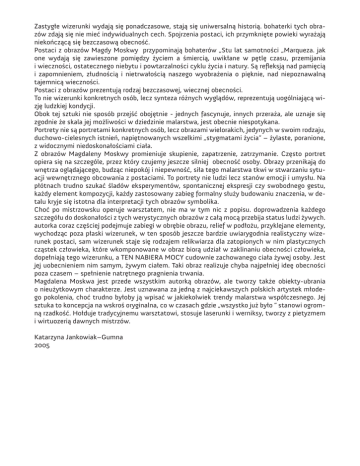 Zastygłe wizerunki wydają się ponadczasowe, stają się uniwersalną historią. bohaterki tych obrazów zdają się nie mieć indywidualnych cech. Spojrzenia postaci, ich przymknięte powieki wyrażają niekończącą się bezczasową obecność. Postaci z obrazów Magdy Moskwy przypominają bohaterów „Stu lat samotności „Marqueza. jak one wydają się zawieszone pomiędzy życiem a śmiercią, uwikłane w pętlę czasu, przemijania i wieczności, ostatecznego niebytu i powtarzalności cyklu życia i natury. Są refleksją nad pamięcią i zapomnieniem, złudnością i nietrwałością naszego wyobrażenia o pięknie, nad niepoznawalną tajemnicą wieczności. Postaci z obrazów prezentują rodzaj bezczasowej, wiecznej obecności. To nie wizerunki konkretnych osób, lecz synteza różnych wyglądów, reprezentują uogólniającą wizję ludzkiej kondycji. Obok tej sztuki nie sposób przejść obojętnie - jednych fascynuje, innych przeraża, ale uznaje się zgodnie że skala jej możliwości w dziedzinie malarstwa, jest obecnie niespotykana. Portrety nie są portretami konkretnych osób, lecz obrazami wielorakich, jedynych w swoim rodzaju, duchowo-cielesnych istnień, napiętnowanych wszelkimi „stygmatami życia” – żylaste, poranione, z widocznymi niedoskonałościami ciała. Z obrazów Magdaleny Moskwy promieniuje skupienie, zapatrzenie, zatrzymanie. Często portret opiera się na szczególe, przez który czujemy jeszcze silniej obecność osoby. Obrazy przenikają do wnętrza oglądającego, budząc niepokój i niepewność, siła tego malarstwa tkwi w stwarzaniu sytuacji wewnętrznego obcowania z postaciami. To portrety nie ludzi lecz stanów emocji i umysłu. Na płótnach trudno szukać śladów eksperymentów, spontanicznej ekspresji czy swobodnego gestu, każdy element kompozycji, każdy zastosowany zabieg formalny służy budowaniu znaczenia, w detalu kryje się istotna dla interpretacji tych obrazów symbolika. Choć po mistrzowsku operuje warsztatem, nie ma w tym nic z popisu. doprowadzenia każdego szczegółu do doskonałości z tych werystycznych obrazów z całą mocą przebija status ludzi żywych. autorka coraz częściej podejmuje zabiegi w obrębie obrazu, relief w podłożu, przyklejane elementy, wychodząc poza płaski wizerunek, w ten sposób jeszcze bardzie uwiarygodnia realistyczny wizerunek postaci, sam wizerunek staje się rodzajem relikwiarza dla zatopionych w nim plastycznych cząstek człowieka, które wkomponowane w obraz biorą udział w zaklinaniu obecności człowieka, dopełniają tego wizerunku, a TEN NABIERA MOCY cudownie zachowanego ciała żywej osoby. Jest jej uobecnieniem nim samym, żywym ciałem. Taki obraz realizuje chyba najpełniej ideę obecności poza czasem – spełnienie natrętnego pragnienia trwania. Magdalena Moskwa jest przede wszystkim autorką obrazów, ale tworzy także obiekty-ubrania o nieużytkowym charakterze. Jest uznawana za jedną z najciekawszych polskich artystek młodego pokolenia, choć trudno byłoby ją wpisać w jakiekolwiek trendy malarstwa współczesnego. Jej sztuka to koncepcja na wskroś oryginalna, co w czasach gdzie „wszystko już było ” stanowi ogromną rzadkość. Hołduje tradycyjnemu warsztatowi, stosuje laserunki i werniksy, tworzy z pietyzmem i wirtuozerią dawnych mistrzów. Katarzyna Jankowiak–Gumna 2005