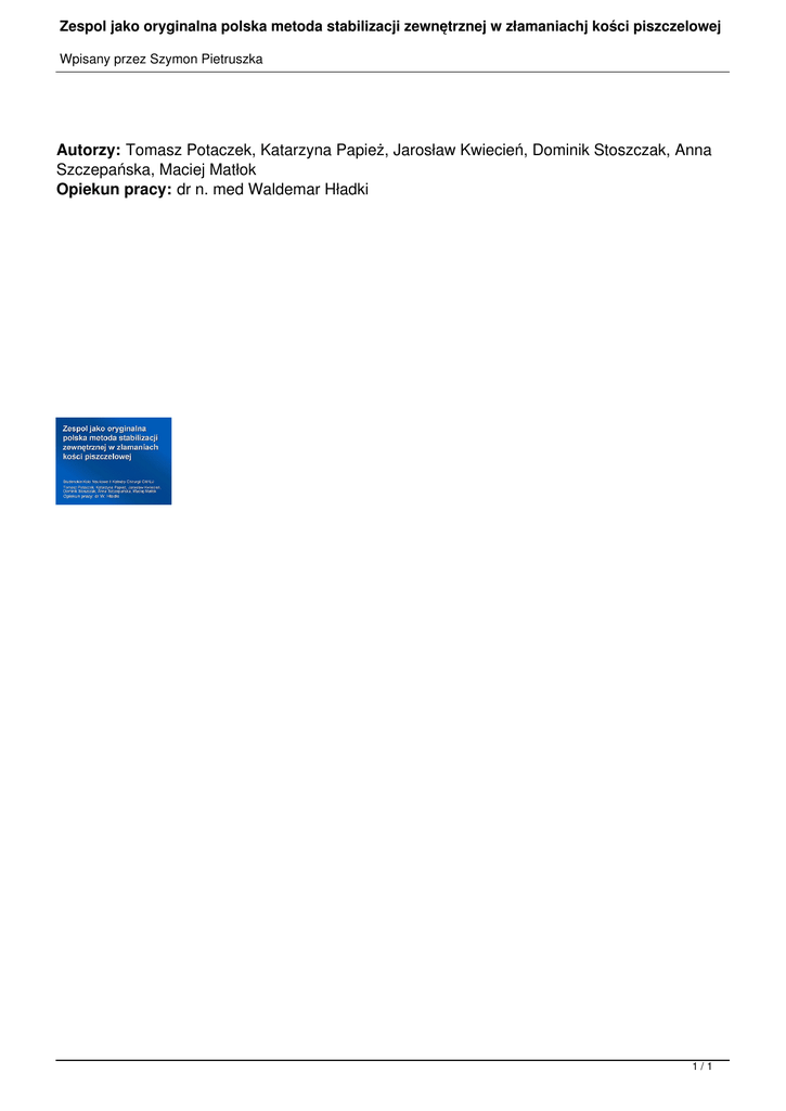 Zespol jako oryginalna polska metoda stabilizacji zewnętrznej w złamaniachj kości piszczelowej Wpisany przez Szymon Pietruszka Autorzy: Tomasz Potaczek, Katarzyna Papież, Jarosław Kwiecień, Dominik Stoszczak, Anna Szczepańska, Maciej Matłok Opiekun pracy: dr n. med Waldemar Hładki 1/1
