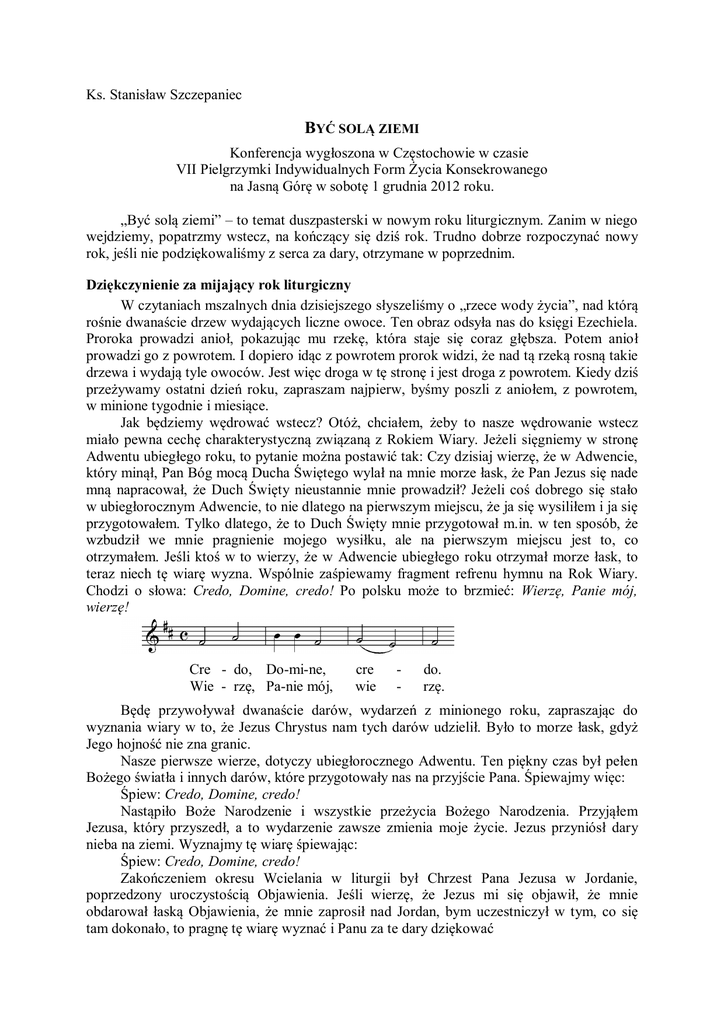 Ks. Stanisław Szczepaniec BYĆ SOLĄ ZIEMI Konferencja wygłoszona w Częstochowie w czasie VII Pielgrzymki Indywidualnych Form Życia Konsekrowanego na Jasną Górę w sobotę 1 grudnia 2012 roku. „Być solą ziemi” – to temat duszpasterski w nowym roku liturgicznym. Zanim w niego wejdziemy, popatrzmy wstecz, na kończący się dziś rok. Trudno dobrze rozpoczynać nowy rok, jeśli nie podziękowaliśmy z serca za dary, otrzymane w poprzednim. Dziękczynienie za mijający rok liturgiczny W czytaniach mszalnych dnia dzisiejszego słyszeliśmy o „rzece wody życia”, nad którą rośnie dwanaście drzew wydających liczne owoce. Ten obraz odsyła nas do księgi Ezechiela. Proroka prowadzi anioł, pokazując mu rzekę, która staje się coraz głębsza. Potem anioł prowadzi go z powrotem. I dopiero idąc z powrotem prorok widzi, że nad tą rzeką rosną takie drzewa i wydają tyle owoców. Jest więc droga w tę stronę i jest droga z powrotem. Kiedy dziś przeżywamy ostatni dzień roku, zapraszam najpierw, byśmy poszli z aniołem, z powrotem, w minione tygodnie i miesiące. Jak będziemy wędrować wstecz? Otóż, chciałem, żeby to nasze wędrowanie wstecz miało pewna cechę charakterystyczną związaną z Rokiem Wiary. Jeżeli sięgniemy w stronę Adwentu ubiegłego roku, to pytanie można postawić tak: Czy dzisiaj wierzę, że w Adwencie, który minął, Pan Bóg mocą Ducha Świętego wylał na mnie morze łask, że Pan Jezus się nade mną napracował, że Duch Święty nieustannie mnie prowadził? Jeżeli coś dobrego się stało w ubiegłorocznym Adwencie, to nie dlatego na pierwszym miejscu, że ja się wysiliłem i ja się przygotowałem. Tylko dlatego, że to Duch Święty mnie przygotował m.in. w ten sposób, że wzbudził we mnie pragnienie mojego wysiłku, ale na pierwszym miejscu jest to, co otrzymałem. Jeśli ktoś w to wierzy, że w Adwencie ubiegłego roku otrzymał morze łask, to teraz niech tę wiarę wyzna. Wspólnie zaśpiewamy fragment refrenu hymnu na Rok Wiary. Chodzi o słowa: Credo, Domine, credo! Po polsku może to brzmieć: Wierzę, Panie mój, wierzę! Cre - do, Do-mi-ne, Wie - rzę, Pa-nie mój, cre wie - do. rzę. Będę przywoływał dwanaście darów, wydarzeń z minionego roku, zapraszając do wyznania wiary w to, że Jezus Chrystus nam tych darów udzielił. Było to morze łask, gdyż Jego hojność nie zna granic. Nasze pierwsze wierze, dotyczy ubiegłorocznego Adwentu. Ten piękny czas był pełen Bożego światła i innych darów, które przygotowały nas na przyjście Pana. Śpiewajmy więc: Śpiew: Credo, Domine, credo! Nastąpiło Boże Narodzenie i wszystkie przeżycia Bożego Narodzenia. Przyjąłem Jezusa, który przyszedł, a to wydarzenie zawsze zmienia moje życie. Jezus przyniósł dary nieba na ziemi. Wyznajmy tę wiarę śpiewając: Śpiew: Credo, Domine, credo! Zakończeniem okresu Wcielania w liturgii był Chrzest Pana Jezusa w Jordanie, poprzedzony uroczystością Objawienia. Jeśli wierzę, że Jezus mi się objawił, że mnie obdarował łaską Objawienia, że mnie zaprosił nad Jordan, bym uczestniczył w tym, co się tam dokonało, to pragnę tę wiarę wyznać i Panu za te dary dziękować Śpiew: Credo, Domine, credo! Weszliśmy w Wielki Post, w wielki wysiłek, trud, czterdziestu dni. Czy dość w tym przeżyciu i spojrzeniu na miniony Wielki Post podziękowaliśmy Panu za to, co On w nas uczynił przez ten Wielki Post? Na ile potrafimy zobaczyć Jego działanie w naszym życiu, Jego Ducha, który nas prowadził? Na ile potrafimy zobaczyć Ojca, który właśnie o nas się troszczył? Im bardziej nasza wiara sięga tej obecności i potęgi działania Bożego tym bardziej wdzięcznym sercem śpiewajmy: Śpiew: Credo, Domine, credo! Triduum Paschalne jest w wymiarze Roku Liturgicznego szczytem i źródłem, czymś co, jest największe. Ku temu zmierzamy i tam żeśmy się narodzili i tam zaczynamy dalszą wędrówkę. Ktokolwiek wierzy, że na Golgocie Jezus Chrystus zanurzył go w swoją Mękę i wprowadził w Zmartwychwstanie i że to się stało w tym roku na nowo i głębiej niech śpiewa z wiarą: Śpiew: Credo, Domine, credo! Okres Wielkanocny jest w Liturgii najbardziej wyróżnionym okresem. Tam jesteśmy najbardziej tymi, którymi Chrystus nas uczynił. Czyli odkupionymi uczestnikami Zmartwychwstania Chrystusa, którzy zostali napełnieni Duchem Świętym tak jak apostołowie w dzień Pięćdziesiątnicy. Wyznajmy wspólnie wiarę w to, że czas paschalny był pełen łask, które Zmartwychwstały nam ofiarował: Śpiew: Credo, Domine, credo! Z czasu okresu zwykłego popatrzmy na inne dary. Wspomnieliśmy już o sześciu związanych z kolejnymi etapami roku liturgicznego. Wyznajemy także wiarę w to, że każdego dnia otrzymywaliśmy zwyczajne dary, wypełniające kolejne dni i tygodnie: Śpiew: Credo, Domine, credo! Popatrzmy teraz na sakramenty pokuty, które przeżyliśmy w tym roku. Na to, co Jezus dokonał w nas przez sakrament pokuty, przez każdy z nich. Czy wierzę, że mimo, iż mam wrażenie, że się mało poprawiam to jednak On się napracował nade mną. To w duchu wdzięczności wyznajmy tę wiarę. Śpiew: Credo, Domine, credo! Przyjęliśmy tyle razy dar Komunii Świętej, niektórzy codziennie. Nie było takiego dnia, żeby nie było sakramentalnego zjednoczenia z Jezusem. Czy wierzę, że za każdym razem dokonywał się cud, że to nie jest bezowocne? Śpiew: Credo, Domine, credo! Nosimy w sobie dar konsekracji, a kandydatki do przyjęcia tego daru się przygotowują. Jeśli wierzę, że łaska konsekracji nadaje każdej chwili mego życia, każdej modlitwie, każdemu cierpieniu, każdej walce, nadaje nowy wymiar. Coś niezwykłego, co od Boga pochodzi, to wyznajmy te wiarę. Śpiew: Credo, Domine, credo! Z perspektywy roku można powiedzieć, że skierowaliśmy do Boga tysiące próśb. Tak wiele łask potrzebowaliśmy dla siebie i dla innych. Czy wierzymy, że wysłuchał? Śpiew: