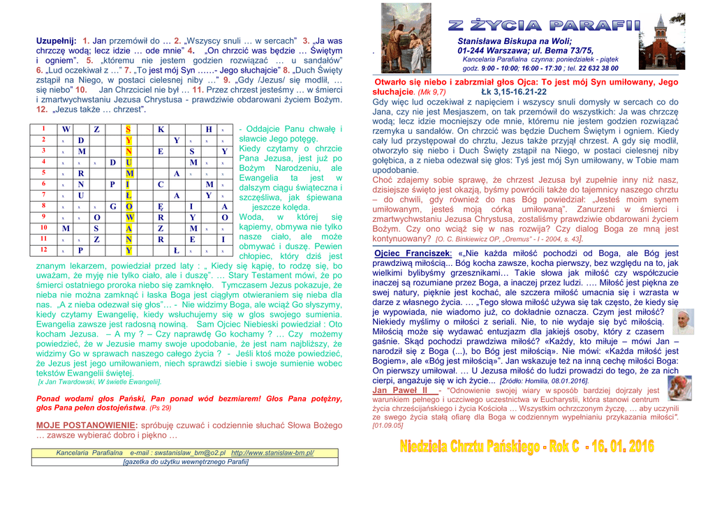 Uzupełnij: 1. Jan przemówił do … 2. „Wszyscy snuli … w sercach” 3. „Ja was chrzczę wodą; lecz idzie … ode mnie” 4. „On chrzcić was będzie … Świętym i ogniem”. 5. „któremu nie jestem godzien rozwiązać … u sandałów” 6. „Lud oczekiwał z …” 7. „To jest mój Syn ……- Jego słuchajcie” 8. „Duch Święty zstąpił na Niego, w postaci cielesnej niby …” 9. „Gdy /Jezus/ się modlił, … się niebo” 10. Jan Chrzciciel nie był … 11. Przez chrzest jesteśmy … w śmierci i zmartwychwstaniu Jezusa Chrystusa - prawdziwie obdarowani życiem Bożym. 12. „Jezus także … chrzest”. 1 W Z S Y N U M I Ł O W A N Y K H x x x - Oddajcie Panu chwałę i sławcie Jego potęgę. x E S Y Kiedy czytamy o chrzcie Pana Jezusa, jest już po 4 x x x x D M x Bożym Narodzeniu, ale 5 x x x R A x Ewangelia ta jest w 6 x N P C M x dalszym ciągu świąteczna i 7 x U A Y x szczęśliwa, jak śpiewana 8 x x x G Ę I A jeszcze kolęda. 9 x x w której się O R Y O Woda, kąpiemy, obmywa nie tylko 10 x x M S Z M nasze ciało, ale może 11 x x Z R E I obmywać i duszę. Pewien 12 x x x P Ł x chłopiec, który dziś jest znanym lekarzem, powiedział przed laty : „ Kiedy się kąpię, to rodzę się, bo uważam, że myję nie tylko ciało, ale i duszę”. … Stary Testament mówi, że po śmierci ostatniego proroka niebo się zamknęło. Tymczasem Jezus pokazuje, że nieba nie można zamknąć i łaska Boga jest ciągłym otwieraniem się nieba dla nas. „A z nieba odezwał się głos”… - Nie widzimy Boga, ale wciąż Go słyszymy, kiedy czytamy Ewangelię, kiedy wsłuchujemy się w glos swojego sumienia. Ewangelia zawsze jest radosną nowiną. Sam Ojciec Niebieski powiedział : Oto kocham Jezusa. – A my ? – Czy naprawdę Go kochamy ? … Czy możemy powiedzieć, że w Jezusie mamy swoje upodobanie, że jest nam najbliższy, że widzimy Go w sprawach naszego całego życia ? - Jeśli ktoś może powiedzieć, że Jezus jest jego umiłowaniem, niech sprawdzi siebie i swoje sumienie wobec tekstów Ewangelii świętej. 2 3 x D M Y x [x Jan Twardowski, W świetle Ewangelii]. Ponad wodami głos Pański, Pan ponad wód bezmiarem! Głos Pana potężny, głos Pana pełen dostojeństwa. (Ps 29) MOJE POSTANOWIENIE: spróbuję czuwać i codziennie słuchać Słowa Bożego … zawsze wybierać dobro i piękno … Kancelaria Parafialna e-mail : [email protected] http://www.stanislaw-bm.pl/ [gazetka do użytku wewnętrznego Parafii] . ‘ Stanisława Biskupa na Woli; 01-244 Warszawa; ul. Bema 73/75, Kancelaria Parafialna czynna: poniedziałek - piątek godz. 9:00 - 10:00; 16:00 - 17:30 ; tel. 22 632 38 00 Otwarło się niebo i zabrzmiał głos Ojca: To jest mój Syn umiłowany, Jego słuchajcie. (Mk 9,7) Łk 3,15-16.21-22 Gdy więc lud oczekiwał z napięciem i wszyscy snuli domysły w sercach co do Jana, czy nie jest Mesjaszem, on tak przemówił do wszystkich: Ja was chrzczę wodą; lecz idzie mocniejszy ode mnie, któremu nie jestem godzien rozwiązać rzemyka u sandałów. On chrzcić was będzie Duchem Świętym i ogniem. Kiedy cały lud przystępował do chrztu, Jezus także przyjął chrzest. A gdy się modlił, otworzyło się niebo i Duch Święty zstąpił na Niego, w postaci cielesnej niby gołębica, a z nieba odezwał się głos: Tyś jest mój Syn umiłowany, w Tobie mam upodobanie. Choć zdajemy sobie sprawę, że chrzest Jezusa był zupełnie inny niż nasz, dzisiejsze święto jest okazją, byśmy powrócili także do tajemnicy naszego chrztu – do chwili, gdy również do nas Bóg powiedział: „Jesteś moim synem umiłowanym, jesteś moją córką umiłowaną”. Zanurzeni w śmierci i zmartwychwstaniu Jezusa Chrystusa, zostaliśmy prawdziwie obdarowani życiem Bożym. Czy ono wciąż się w nas rozwija? Czy dialog Boga ze mną jest kontynuowany? [O. C. Binkiewicz OP, „Oremus” - I - 2004, s. 43]. Ojciec Franciszek: «„Nie każda miłość pochodzi od Boga, ale Bóg jest prawdziwą miłością... Bóg kocha zawsze, kocha pierwszy, bez względu na to, jak wielkimi bylibyśmy grzesznikami… Takie słowa jak miłość czy współczucie inaczej są rozumiane przez Boga, a inaczej przez ludzi. …. Miłość jest piękna ze swej natury, pięknie jest kochać, ale szczera miłość umacnia się i wzrasta w darze z własnego życia. … „Tego słowa miłość używa się tak często, że kiedy się je wypowiada, nie wiadomo już, co dokładnie oznacza. Czym jest miłość? Niekiedy myślimy o miłości z seriali. Nie, to nie wydaje się być miłością. Miłością może się wydawać entuzjazm dla jakiejś osoby, który z czasem gaśnie. Skąd pochodzi prawdziwa miłość? «Każdy, kto miłuje – mówi Jan – narodził się z Boga (...), bo Bóg jest miłością». Nie mówi: «Każda miłość jest Bogiem», ale «Bóg jest miłością»”. Jan wskazuje też na inną cechę miłości Boga: On pierwszy umiłował. … U Jezusa miłość do ludzi prowadzi do tego, że za nich cierpi, angażuje się w ich życie... [Źródło: Homilia, 08.01.2016]. Jan Paweł II - "Odnowienie swojej wiary w sposób bardziej dojrzały jest warunkiem pełnego i uczciwego uczestnictwa w Eucharystii, która stanowi centrum życia chrześcijańskiego i życia Kościoła … Wszystkim ochrzczonym życzę, … aby uczynili ze swego życia stałą ofiarę dla Boga w codziennym wypełnianiu przykazania miłości". [01.09.05] OGŁOSZENIA DUSZPASTERSKIE Niedziela Chrztu Pańskiego – 10 Stycznia 2016r. . Stefan Kardynał Wyszyński - Całym sercem życzę Wam, Dzieci Najmilsze, aby rok, który zaczynacie, był dla Was dalszym krokiem pogłębiającym waszą miłość ku Bogu i waszą wierność łasce. Aby Was zbliżał do wspaniałego progu Tysiąclecia … [DZIEŁA ZEBRANE TOM VIII, styczeń–lipiec 1962 s.12-13]. Kontempluj Ewangelię według Lectio Divina; I – Lectio - Czytaj z wiarą i uważnie święty tekst Ewangelii, jak gdyby dyktował dla ciebie 