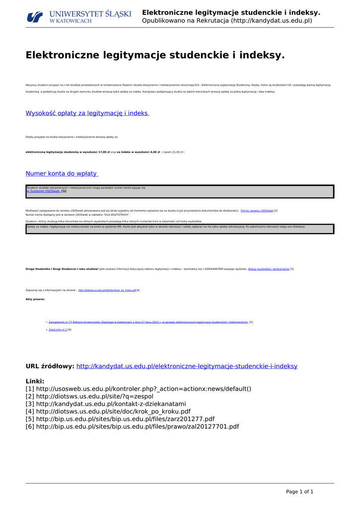 Elektroniczne legitymacje studenckie i indeksy. Opublikowano na Rekrutacja (http://kandydat.us.edu.pl) Elektroniczne legitymacje studenckie i indeksy. Wszyscy studenci przyjęci na I rok studiów prowadzonych w Uniwersytecie Śląskim (studia stacjonarne i niestacjonarne) otrzymają ELS - Elektroniczną Legitymację Studencką. Osoby, które są studentami UŚ i posiadają ważną legitymację studencką, a podejmują studia na drugim kierunku studiów wnoszą tylko opłatę za indeks. Kandydaci podejmujący studia na dwóch kierunkach wnoszą opłatę za jedną legitymację i dwa indeksy. Wysokość opłaty za legitymację i indeks Osoby przyjęte na studia stacjonarne i niestacjonarne wnoszą opłaty za elektroniczną legitymację studencką w wysokości 17,00 zł oraz za indeks w wysokości 4,00 zł ( razem 21,00 zł ) Numer konta do wpłaty Studenci studiów stacjonarnych i niestacjonarnych mogą sprawdzić numer konta logując się w Systemie USOSweb. [1] Możliwość zalogowania do serwisu USOSweb aktywowana jest po około tygodniu od momentu wpisania się na studia (czyli przyniesienia dokumentów do dziekanatu). Pomoc serwisu USOSweb [2] Numer konta dostępny jest w serwisie USOSweb w zakładce "DLA WSZYSTKICH". Studenci, którzy studiują kilka kierunków na różnych wydziałach posiadają kilka różnych numerów kont w zależności od liczby wydziałów. Opłaty za indeks i legitymację nie można wnosić na konto w systemie IRK. Konto jest aktywne tylko w okresie rekrutacji i należy wpłacać na nie tylko opłatę rekrutacyjną. Po zakończeniu rekrutacji ulega ono likwidacji. Droga Studentko i Drogi Studencie I roku studiów! Jeśli szukasz informacji dotyczącej odbioru legitymacji i indeksu - skontaktuj się z DZIEKANATEM swojego wydziału. Wykaz wydziałów i dziekanatów [3]. Zapoznaj się z informacjami na stronie : http://diotsws.us.edu.pl/site/doc/krok_po_kroku.pdf [4] Akty prawne: Zarządzenie nr 77 Rektora Uniwersytetu Śląskiego w Katowicach z dnia 17 lipca 2012 r. w sprawie elektronicznych legitymacji studenckich i doktoranckich [5] Załacznik nr 1 [6] URL źródłowy: http://kandydat.us.edu.pl/elektroniczne-legitymacje-studenckie-i-indeksy Linki: [1] http://usosweb.us.edu.pl/kontroler.php?_action=actionx:news/default() [2] http://diotsws.us.edu.pl/site/?q=zespol [3] http://kandydat.us.edu.pl/kontakt-z-dziekanatami [4] http://diotsws.us.edu.pl/site/doc/krok_po_kroku.pdf [5] http://bip.us.edu.pl/sites/bip.us.edu.pl/files/zarz201277.pdf [6] http://bip.us.edu.pl/sites/bip.us.edu.pl/files/prawo/zal20127701.pdf Page 1 of 1