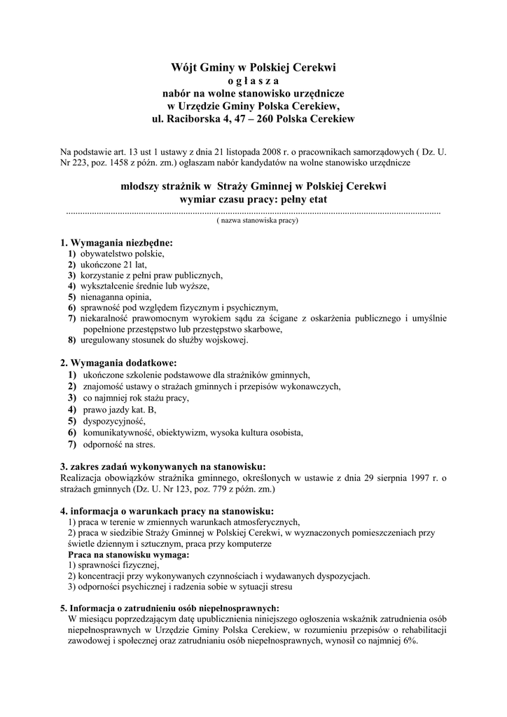 Wójt Gminy w Polskiej Cerekwi ogłasza nabór na wolne stanowisko urzędnicze w Urzędzie Gminy Polska Cerekiew, ul. Raciborska 4, 47 – 260 Polska Cerekiew Na podstawie art. 13 ust 1 ustawy z dnia 21 listopada 2008 r. o pracownikach samorządowych ( Dz. U. Nr 223, poz. 1458 z późn. zm.) ogłaszam nabór kandydatów na wolne stanowisko urzędnicze młodszy strażnik w Straży Gminnej w Polskiej Cerekwi wymiar czasu pracy: pełny etat ................................................................................................................................................................ ( nazwa stanowiska pracy) 1. Wymagania niezbędne: 1) 2) 3) 4) 5) 6) 7) obywatelstwo polskie, ukończone 21 lat, korzystanie z pełni praw publicznych, wykształcenie średnie lub wyższe, nienaganna opinia, sprawność pod względem fizycznym i psychicznym, niekaralność prawomocnym wyrokiem sądu za ścigane z oskarżenia publicznego i umyślnie popełnione przestępstwo lub przestępstwo skarbowe, 8) uregulowany stosunek do służby wojskowej. 2. Wymagania dodatkowe: 1) ukończone szkolenie podstawowe dla strażników gminnych, 2) znajomość ustawy o strażach gminnych i przepisów wykonawczych, 3) co najmniej rok stażu pracy, 4) prawo jazdy kat. B, 5) dyspozycyjność, 6) komunikatywność, obiektywizm, wysoka kultura osobista, 7) odporność na stres. 3. zakres zadań wykonywanych na stanowisku: Realizacja obowiązków strażnika gminnego, określonych w ustawie z dnia 29 sierpnia 1997 r. o strażach gminnych (Dz. U. Nr 123, poz. 779 z późn. zm.) 4. informacja o warunkach pracy na stanowisku: 1) praca w terenie w zmiennych warunkach atmosferycznych, 2) praca w siedzibie Straży Gminnej w Polskiej Cerekwi, w wyznaczonych pomieszczeniach przy świetle dziennym i sztucznym, praca przy komputerze Praca na stanowisku wymaga: 1) sprawności fizycznej, 2) koncentracji przy wykonywanych czynnościach i wydawanych dyspozycjach. 3) odporności psychicznej i radzenia sobie w sytuacji stresu 5. Informacja o zatrudnieniu osób niepełnosprawnych: W miesiącu poprzedzającym datę upublicznienia niniejszego ogłoszenia wskaźnik zatrudnienia osób niepełnosprawnych w Urzędzie Gminy Polska Cerekiew, w rozumieniu przepisów o rehabilitacji zawodowej i społecznej oraz zatrudnianiu osób niepełnosprawnych, wynosił co najmniej 6%. 6. Wymagane dokumenty: a) kwestionariusz osobowy dla osoby ubiegającej się o zatrudnienie (Dz. U. z 2009 r. Nr 115, poz. 971), b) życiorys (CV), c) list motywacyjny, d) kserokopie dokumentów poświadczające wykształcenie, e) kserokopie innych dokumentów potwierdzających posiadane kwalifikacje i umiejętności, f) kserokopie świadectw pracy potwierdzające wymagany staż pracy lub zaświadczenia o zatrudnieniu w przypadku pozostawania w stosunku pracy, g) kserokopia książeczki wojskowej potwierdzająca uregulowany stosunek do służby wojskowej, h) oświadczenie o niekaralności za ścigane z oskarżenia publicznego i umyślnie popełnione przestępstwo lub przestępstwo skarbowe, zawierające adnotację o świadomości odpowiedzialności karnej za składanie fałszywych zeznań zgodnie z art. 233 kodeksu karnego). Wybrany kandydat zobowiązuje się przedłożenia zaświadczenia o niekaralności. i) oświadczenie o posiadaniu pełnej zdolności do czynności prawnych oraz o posiadaniu pełni praw publicznych 7. Termin i miejsce składania dokumentów: Wymagane dokumenty aplikacyjne należy składać w zamkniętej kopercie osobiście w sekretariacie Urzędu Gminy lub pocztą na adres Urzędu tj. ul. Raciborska 4, 47-260 Polska Cerekiew z dopiskiem „Dotyczy naboru na stanowisko młodszego strażnika w Straży Gminnej w Polskiej Cerekwi” w terminie do dnia 29 stycznia 2013 r. do godz. 15.15. Decyduje data wpływu oferty do Urzędu. Aplikacje, które wpłyną do Urzędu po określonym terminie nie będą rozpatrywane. Informacja o wyniku naboru będzie umieszczona na stronie internetowej Biuletynu Informacji Publicznej oraz na tablicy ogłoszeń w Urzędzie Gminy. Złożone dokumenty powinny być opatrzone klauzulą: Wyrażam zgodę na przetwarzanie moich danych osobowych zawartych w ofercie pracy dla potrzeb niezbędnych do realizacji procesu rekrutacji zgodnie z ustawą z dnia 29 sierpnia 1997r. o ochronie danych osobowych oraz na przeprowadzenie wywiadu środowiskowego w dotychczasowych miejscach mojej pracy i nauki w celu potwierdzenia spełniania warunku posiadania przeze mnie nieposzlakowanej opinii, Polska Cerekiew, 18.01.2013 r. Wójt Gminy Polska Cerekiew Krystyna Helbin