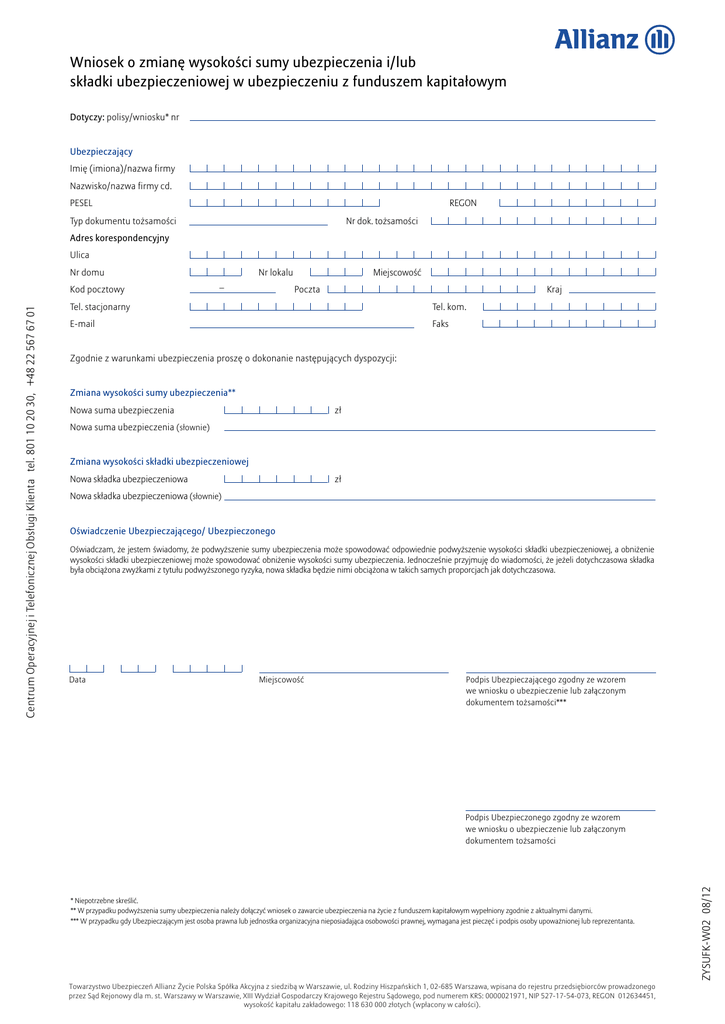 Wniosek o zmianę wysokości sumy ubezpieczenia i/lub składki ubezpieczeniowej w ubezpieczeniu z funduszem kapitałowym Dotyczy: polisy/wniosku* nr Ubezpieczający Imię (imiona)/nazwa firmy Nazwisko/nazwa firmy cd. REGON PESEL Nr dok. tożsamości Typ dokumentu tożsamości Adres korespondencyjny Ulica Nr domu Miejscowość Poczta Kraj Tel. stacjonarny Tel. kom. E-mail Faks Zgodnie z warunkami ubezpieczenia proszę o dokonanie następujących dyspozycji: Zmiana wysokości sumy ubezpieczenia** Nowa suma ubezpieczenia zł Nowa suma ubezpieczenia (słownie) Zmiana wysokości składki ubezpieczeniowej Nowa składka ubezpieczeniowa zł Nowa składka ubezpieczeniowa (słownie) Oświadczenie Ubezpieczającego/ Ubezpieczonego Oświadczam, że jestem świadomy, że podwyższenie sumy ubezpieczenia może spowodować odpowiednie podwyższenie wysokości składki ubezpieczeniowej, a obniżenie wysokości składki ubezpieczeniowej może spowodować obniżenie wysokości sumy ubezpieczenia. Jednocześnie przyjmuję do wiadomości, że jeżeli dotychczasowa składka była obciążona zwyżkami z tytułu podwyższonego ryzyka, nowa składka będzie nimi obciążona w takich samych proporcjach jak dotychczasowa. Data Miejscowość Podpis Ubezpieczającego zgodny ze wzorem we wniosku o ubezpieczenie lub załączonym dokumentem tożsamości*** Podpis Ubezpieczonego zgodny ze wzorem we wniosku o ubezpieczenie lub załączonym dokumentem tożsamości * Niepotrzebne skreślić. ** W przypadku podwyższenia sumy ubezpieczenia należy dołączyć wniosek o zawarcie ubezpieczenia na życie z funduszem kapitałowym wypełniony zgodnie z aktualnymi danymi. *** W przypadku gdy Ubezpieczającym jest osoba prawna lub jednostka organizacyjna nieposiadająca osobowości prawnej, wymagana jest pieczęć i podpis osoby upoważnionej lub reprezentanta. Towarzystwo Ubezpieczeń Allianz Życie Polska Spółka Akcyjna z siedzibą w Warszawie, ul. Rodziny Hiszpańskich 1, 02-685 Warszawa, wpisana do rejestru przedsiębiorców prowadzonego przez Sąd Rejonowy dla m. st. Warszawy w Warszawie, XIII Wydział Gospodarczy Krajowego Rejestru Sądowego, pod numerem KRS: 0000021971, NIP 527-17-54-073, REGON 012634451, wysokość kapitału zakładowego: 118 630 000 złotych (wpłacony w całości). ZYSUFK-W02 08/12 Centrum Operacyjnej i Telefonicznej Obsługi Klienta tel. 801 10 20 30, +48 22 567 67 01 Kod pocztowy Nr lokalu –