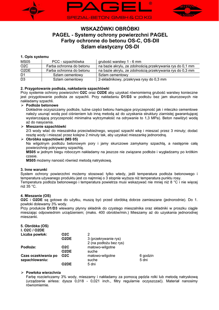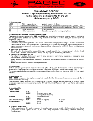 WSKAZÓWKI OBRÓBKI PAGEL - Systemy ochrony powierzchni PAGEL Farby ochronne do betonu OS-C, OS-DII Szlam elastyczny OS-DI 1. Opis systemu MS05 PCC - szpachlówka O2C Farba ochronna do betonu O2DE Farba ochronna do betonu D1 Szlam cementowy D3 Szlam cementowy grubość warstwy 1 - 6 mm na bazie akrylu, ze zdolnością przekrywania rys do 0,1 mm na bazie akrylu, ze zdolnością przekrywania rys do 0,3 mm Szlam cementowy 2-składnikowy, przekrywa rysy do 0,3 mm 2. Przygotowanie podłoża, nakładanie szpachlówki Przy systemie ochrony powierzchni O2C oraz O2DE aby uzyskać równomierną grubość warstwy konieczne jest przygotowanie podłoża ze szpachli. Przy nakładaniu D1/D3 w podłożu bez jam skurczowych nie nakładamy szpachli. Podłoże betonowe Dokładnie oczyszczamy podłoże, luźne części betonu hamujące przyczepność jak i mleczko cementowe należy usunąć wodą pod ciśnieniem lub inną metodą aż do uzyskania struktury ziarnistej gwarantującej wystarczającą przyczepność minimalna wytrzymałość na odrywanie to 1,3 MPa). Beton nawilżyć wodą aż do nasycenia. Mieszanie szpachlówki 2/3 wody wlać do mieszalnika przeciwbieżnego, wsypać szpachl wkę i mieszać przez 3 minuty; dodać resztę wody i mieszać przez kolejne 2 minuty tak, aby uzyskać mieszankę jednorodną. Obróbka szpachlówki (MS 05) Na wilgotnym podłożu betonowym pory i jamy skurczowe zamykamy szpachlą, a następnie całą powierzchnię pokrywamy szpachlą. MS05 w jednym biegu roboczym nakładamy na jeszcze nie związane podłoże i wygładzamy po krótkim czasie. MS05 możemy nanosić również metodą natryskową. 3. Inne warunki System ochrony powierzchni możemy stosować tylko wtedy, jeśli temperatura podłoża betonowego i temperatura używanego produktu jest co najmniej o 3 stopnie wyższa niż temperatura punktu rosy. Temperatura podłoża betonowego i temperatura powietrza musi wskazywać nie mniej niż 8 °C i nie więcej niż 35 °C. 4. Mieszanie (OS) O2C i O2DE są gotowe do użytku, muszą być przed obróbką dobrze zamieszane (jednorodnie). Do 1. powłoki dolewamy 3% wody. Przy produkcie D1/D3 wlewamy płynny składnik do czystego mieszalnika oraz składniki w proszku ciągle mieszając odpowiednim urządzeniem; (maks. 400 obrotów/min.) Mieszamy aż do uzyskania jednorodnej mieszanki. 5. Obróbka (OS) I. O2C / O2DE Liczba powłok: Podłoże: Czas oczekiwania po szpachlowaniu: O2C O2DE O2C O2DE O2C O2DE 2 3 (przekrywanie rys) 2 (na podłożu bez rys) matowo-wilgotne suche matowo-wilgotne suche 5 dni 6 godzin 5 dni Powłoka wierzchnia Farbę rozcieńczamy 3% wody, mieszamy i nakładamy za pomocą pędzla rolki lub metodą natryskową (urządzenie airless: dysza 0,018 - 0,021 inch., filtry regularnie oczyszczać). Materiał nanosimy równomiernie. Czas oczekiwania pomiędzy nałożeniem każdej warstwy to 24 godziny. Pokrycie powierzchni Pokrycie powierzchni po przerwie technologicznej aplikacja jak w przypadku pierwszej warstwy. czas suszenia: po ok. 5 godzinach odporność na deszcz: po ok. 5 godzinach II. D1 / D3 Liczba powłok: Podłoże: Czas oczekiwania po szpachlowaniu: 2 (każdorazowo minimum 1 mm) każdy bieg roboczy 1,8 - 2 kg/m2 matowo-wilgotne 6 godzin Pierwsza warstwa Szlam cementowy nałożyć kielnią, pędzlem lub szczotką równomiernie na odpowiednio przygotowanej powierzchni. D1/D3 można nałożyć metodą natryskową - np. pompą Strob i dyszą do szpachli. Czas oczekiwania między 1. i 2. pokryciem powierzchni wynosi ok. 5 godzin. Druga warstwa Po przerwie technologicznej należy postępować jak przy 1 powłoce wierzchniej. D1/D3-powierzchnię po ok. 10 minutach (20°C) wygładzić lekko nawilżoną miękką szczotką, aby uzyskać jednakową strukturę powierzchni. czas suszenia: po ok. 3 godzinach odporność na deszcz: po ok. 5 godzinach D1/D3 można po ok. 24 godzinach pokryć 2-krotnie O2DE jeśli chcemy uzyskać końcowy efekt w wybranym kolorze. 6. Ochrona przed działaniem czynników atmosferycznych Przy normalnych warunkach pogodowych nie jest konieczna pielęgnacja. Przy mocnym nasłonecznieniu lub wietrze świeżo pokrywane powierzchnie należy chronić i nakryć np. folią.