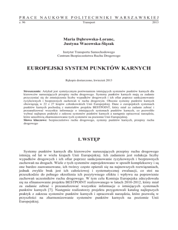 PRACE NAUKOWE POLITECHNIKI WARSZAWSKIEJ z. 96 Transport 2013 Maria D browska-Loranc, Justyna Wacowska-lzak Instytut Transportu Samochodowego Centrum Bezpieczestwa Ruchu Drogowego EUROPEJSKI SYSTEM PUNKTÓW KARNYCH Rkopis dostarczono, kwiecie 2013 Streszczenie: Artyku jest syntetycznym porównaniem istniejcych systemów punktów karnych dla kierowców naruszajcych przepisy ruchu drogowego. Systemy punktów karnych maj za zadanie przyczynia si do zmniejszenia liczby wypadków drogowych i ich ofiar poprzez sankcjonowanie ryzykownych i bezprawnych zachowa w ruchu drogowym. Obecnie systemy punktów karnych obowizuj w 22 z 27 krajów czonkowskich Unii Europejskiej. Dane o europejskich systemach punktów karnych pochodz z materiaów projektu BESTPOINT, który mia za zadanie zebra i przeanalizowa wszystkie informacje o istniejcych systemach punktów karnych, co pozwolio wybra najlepsze praktyki z zakresu systemów punktów karnych a nastpnie opracowa narzdzia, które umoliwi zharmonizowanie tych systemów na poziomie Unii Europejskiej. Sowa kluczowe: bezpieczestwo ruchu drogowego, systemy punktów karnych, przepisy ruchu drogowego 1. WSTP Systemy punktów karnych dla kierowców naruszajcych przepisy ruchu drogowego istniej od lat w wielu krajach Unii Europejskiej. Ich zadaniem jest redukcja liczby wypadków drogowych i ich ofiar poprzez sankcjonowanie ryzykownych i bezprawnych zachowa na drogach. Wiele z tych systemów zaprojektowano w sposób kompleksowy i s one bardzo zaawansowane, ich twórcy czsto opierali si na najnowszych rozwizaniach, jednak zwykle brak jest ich caociowej i systematycznej ewaluacji, co stoi na przeszkodzie do penego okrelenia ich pozytywnego efektu i wpywu na poprawienie zachowa uczestników ruchu drogowego. W tym celu Komisja Europejska zdecydowaa si na sfinansowanie projektu BESTPOINT realizowanego w latach 2010-2012, który mia za zadanie zebra i przeanalizowa wszystkie informacje o istniejcych systemach punktów karnych [7]. Nastpnie realizatorzy projektu przygotowali katalog najlepszych praktyk z zakresu systemów punktów karnych i opracowali narzdzia, które pozwol w przyszoci na zharmonizowanie systemów punktów karnych na poziomie Unii Europejskiej. 128 Maria Dbrowska-Loranc, Justyna Wacowska-lzak 2. EUROPEJSKIE SYSTEMY PUNKTÓW KARNYCH Obecnie systemy punktów karnych obowizuj w nastpujcych krajach: Austria, Bugaria, Cypr, Czechy, Dania, Finlandia, Francja, Grecja, Hiszpania, Holandia, Irlandia, Luksemburg, otwa, Malta, Niemcy, Polska, Rumunia, Sowacja, Sowenia, Wgry, Wielka Brytania, Wochy, czyli w 22 z 27 krajów czonkowskich Unii Europejskiej [2]. Uznaje si, e system punktów karnych jest elementem uzupeniajcym tradycyjny nadzór policyjny, koncentruje si na uczestnikach ruchu drogowego, którzy wielokrotnie ami przepisy, skutkuje przydzieleniem punktów karnych a zebranie ich wikszej, okrelonej przepisami liczby (w zdefiniowanym okresie czasu) powoduje dalsze represje z odebraniem prawa jazdy wcznie. Systemy punktów karnych maj trzy efektywne cele: prewencja, selekcja, poprawa. Efekt prewencji zawiera si w ryzyku utraty prawa jazdy przy powtarzajcych si wykroczeniach. Jest to dodatkowy powód do przestrzegania przepisów ruchu drogowego. Mamy tu do czynienia z kilkoma efektami tego rodzaju prewencji. Efekt bardzo ogólny to zmniejszenie liczby wykrocze u wszystkich kierowców; jed oni ostroniej, aby unikn punktów karnych. Bardziej profilowany efekt prewencyjny to zmniejszenie liczby wykrocze u tych kierowców, którzy ju wczeniej „wpadli” w system punktów karnych i teraz s ostroniejsi, poniewa nie chc otrzyma kolejnych punktów. Efekt selekcji polega na tym, e system moe wyeliminowa z ruchu drogowego kierowców zachowujcych si niebezpiecznie zanim jeszcze spowoduj wypadek drogowy. Wyeliminowanie takiego kierowcy ma znaczenie dla bezpieczestwa ruchu drogowego przede wszystkim wtedy, gdy odbywa si to we waciwym czasie – natychmiastowa kara. Efekt poprawy opiera si na tym elemencie systemu, który pozwala kierowcy na zmniejszenie liczby punktów karnych poprzez udzia w kursie doszkalajcym. Efekt edukacyjny przeplata si wówczas z elementem korekcyjnym – poprawy. Dla systemu punktów karnych z punktu widzenia efektywnoci takich szkole wane jest, aby byy nastawione na zmian niewaciwych postaw i zachowa oraz na ograniczenie powrotu do takich zachowa. Realizatorzy Projektu BESTPOINT skupili si na nastpujcych elementach systemu punktów karnych, które powinny by zawarte w ogólnoeuropejskim systemie: Ogólne zaoenia: lista wykrocze skutkujca przydzieleniem punktów karnych, wydzielenie grup uczestników ruchu drogowego objtych systemem, liczba punktów karnych skutkujca odebraniem/zatrzymaniem prawa jazdy; rodki prewencyjne i reedukacyjno-rehabilitacyjne (listy ostrzegawcze, szkolenia obowizkowe dla kierowców naruszajcych przepisy); Warunki odzyskania uprawnie do kierowania; Kwestie administracyjne i organizacyjne. Europejski system punktów karnych 129 3. WYKROCZENIA I PUNKTY KARNE 3.1. KATALOG WYKROCZE Ogóln zasad systemów punktów karnych jest przyznawanie punktów za konkretne wykroczenia. Jeli w wyznaczonym przez przepisy czasie kierowca uzyska pewn liczb punktów podejmuje si okrelone w prawie dziaania: zwykle zaczyna si od wysania listu informacyjnego/ostrzegajcego, potem jest uczestnictwo w kursie doszkalajcym a na koniec, jeli poprzednie rodki zawiody odbiera si prawo jazdy. Kwesti, która podlegaa dyskusji specjalistów byo to, jakie wykroczenia naley wczy do listy wykrocze skutkujcych punktami karnymi. Obecnie w Europie punkty karne przyznawane s za wikszo wykrocze – ich liczba zaley od wagi wykroczenia, niebezpieczestwa i konsekwencji, jakie ono za sob niesie. W niektórych krajach na licie punktów karnych s wszystkie wykroczenia – jak np. w Polsce, a w innych tylko wybrana lista tych uznanych za najbardziej niebezpieczne. Realizatorzy projektu BESTPOINT uznali, na podstawie analizy literatury przedmiotu oraz dostpnych wyników bada 