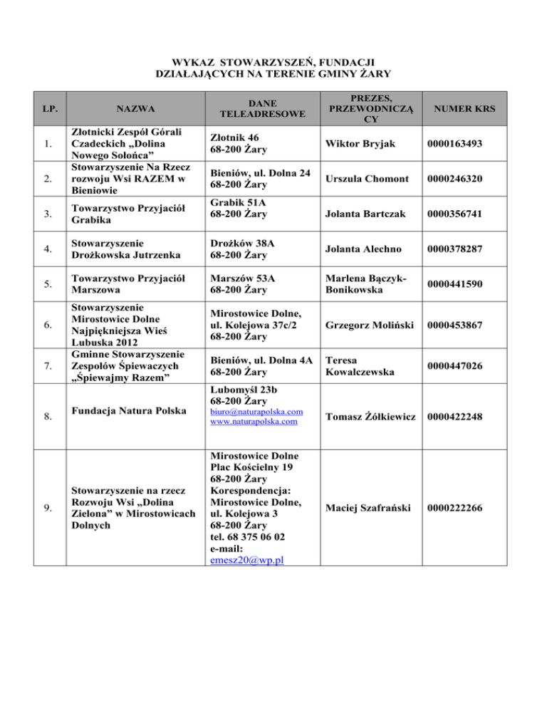 WYKAZ STOWARZYSZEŃ, FUNDACJI DZIAŁAJĄCYCH NA TERENIE GMINY ŻARY LP. 1. 2. NAZWA Złotnicki Zespół Górali Czadeckich „Dolina Nowego Sołońca” Stowarzyszenie Na Rzecz rozwoju Wsi RAZEM w Bieniowie DANE TELEADRESOWE PREZES, PRZEWODNICZĄ CY NUMER KRS Złotnik 46 68-200 Żary Wiktor Bryjak 0000163493 Bieniów, ul. Dolna 24 68-200 Żary Urszula Chomont 0000246320 Jolanta Bartczak 0000356741 Grabik 51A 68-200 Żary 3. Towarzystwo Przyjaciół Grabika 4. Stowarzyszenie Drożkowska Jutrzenka Drożków 38A 68-200 Żary Jolanta Alechno 0000378287 5. Towarzystwo Przyjaciół Marszowa Marszów 53A 68-200 Żary Marlena BączykBonikowska 0000441590 Mirostowice Dolne, ul. Kolejowa 37c/2 68-200 Żary Grzegorz Moliński 0000453867 Bieniów, ul. Dolna 4A 68-200 Żary Teresa Kowalczewska 0000447026 [email protected] www.naturapolska.com Tomasz Żółkiewicz 0000422248 Mirostowice Dolne Plac Kościelny 19 68-200 Żary Korespondencja: Mirostowice Dolne, ul. Kolejowa 3 68-200 Żary tel. 68 375 06 02 e-mail: [email protected] Maciej Szafrański 0000222266 6. 7. Stowarzyszenie Mirostowice Dolne Najpiękniejsza Wieś Lubuska 2012 Gminne Stowarzyszenie Zespołów Śpiewaczych „Śpiewajmy Razem” Lubomyśl 23b 68-200 Żary 8. 9. Fundacja Natura Polska Stowarzyszenie na rzecz Rozwoju Wsi „Dolina Zielona” w Mirostowicach Dolnych
