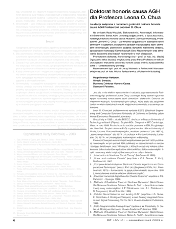log, uniwersytet jest idealnym miejscem obcowania nauczycieli, zdolnych dzieliæ siê sw¹ wiedz¹ i wyposa¿onych w odpowiednie narzêdzia jej rozwijania przez badania i wdro¿enia, oraz studentów, maj¹cych prawo, mo¿liwoœci i chêæ wzbogacania t¹ wiedz¹ swoich umys³ów. 4. Uniwersytet – jako instytucja odpowiedzialna za utrwalanie europejskiej tradycji humanistycznej – stale dba o tworzenie wiedzy uniwersalnej, a realizuj¹c swoje powo³anie, przenika granice geograficzne i polityczne oraz potwierdza koniecznoœæ poznawania i wzajemnego oddzia³ywania na siebie ró¿nych kultur. Œrodki Osi¹gniêcie zamierzonych celów zgodnie z powy¿szymi zasadami wymaga skutecznych œrodków, odpowiadaj¹cych istniej¹cym warunkom. 1. Dla zachowania swobody badañ naukowych i kszta³cenia, wszyscy cz³onkowie spo³ecznoœci akademickiej musz¹ byæ wyposa¿eni w odpowiednie narzêdzia umo¿liwiaj¹ce korzystanie z tej swobody. 2. Zasady i tryb zatrudniania nauczycieli akademickich oraz uregulowania dotycz¹ce ich statusu musz¹ byæ podporz¹dkowane zasadzie, ¿e praca dydaktyczna i badania naukowe s¹ nieroz³¹czne. 3. Ka¿dy uniwersytet musi – wyj¹wszy szczególne okolicznoœci – zapewniæ swoim studentom swobody akademickie oraz zagwarantowaæ warunki sprzyjaj¹ce rozwojowi kulturalnemu i zawodowemu studentów, zgodnie z ich oczekiwaniami. 4. Uniwersytety – szczególnie europejskie – za warunek sta³ego postêpu wiedzy uwa¿aj¹ wymianê informacji i dokumentów, a tak¿e wspólne projekty sprzyjaj¹ce postêpom w nauczaniu. Dlatego, tak jak w pocz¹tkowym okresie swojej historii, uniwersytety wspieraj¹ wymianê nauczycieli i studentów; co wiêcej, uwa¿aj¹ ogóln¹ zasadê równowa¿noœci stanowisk, dyplomów, wyników egzaminów oraz standardów pracy naukowej jako podstawow¹ zasadê warunkuj¹c¹ spe³nienie ich misji w obecnie panuj¹cych warunkach. Ni¿ej podpisani rektorzy, w imieniu swoich Uniwersytetów, podejmuj¹ siê uczyniæ wszystko, co jest w ich mocy, aby zachêciæ poszczególne pañstwa, a tak¿e zainteresowane organizacje miêdzynarodowe, do konsekwentnego kszta³towania swojej polityki w oparciu o niniejszy dokument (Magna Charta), wyra¿aj¹cy jednomyœlnie, w sposób nieskrêpowany ustalone i przekazane do publicznej wiadomoœci przes³anie Uniwersytetów. Bolonia, 18 wrzeœnia 1988 r. Sygnatariusze Karty Boloñskiej – 2003 1. Cypr, University of Cyprus, prof. Stavros A. Zenios – Rector, Nicosia 2. Czechy, Masaryk University, prof. Jiri Zlatuska – Rector, Brno 3. Czechy, Mendel University of Agriculture and Forestry, prof. Ing. Stanislav Prochazka – Rector, Brno 4. Czechy, Palacky University Olomuc, prof. Miroslav Maslan – delegat Rektora, O³omuniec 5. Francja, Université de la Polynesie Française, prof. Sylvie Andre – President, FAA'A Tahiti 6. Wêgry, University of Miskolc, prof. Lajos Besenyei – Rektor, Miszkolc 7. W³ochy, Universita degli Studi del Molise, prof. Giovanni Cannata – Rektor, Campobasso 8. Kazakhstan, Al-Farabi Kazakh National University, prof. Tolegen Abdisagiyevich Kozhamkulov – Rektor, A³maata 9. Kosovo, University of Pristina, prof. Zejnel Kelmendi – Rektor, Prishtinë 10. Litwa, Law University of Lithuania, prof. Alvydas Pumputis – Rector, Wilno 11. Polska, AGH University of Science and Technology, prof. Ryszard Tadeusiewicz – Rektor, Kraków 12. Portugalia, Universidade de Averio, prof. Francisco Vaz – Vice Rektor, Averio 13. Rumunia, Universitatea de Medicina si Farmacie din Tigru-Mures, prof. dr Marius Sabau – Rektor, Tigru-Mures 14. Rosja, Modern University for the Humanities, Dr Michail P. Karpenko – Rekotr, Moskwa 15. Szkocja, University of Paisley, prof. John Macklin – Rektor, Paisley 16. S³owacja, Slovak Medical University, prof. dr Jan Stncl – Rektor, Bratys³awa 17. Hiszpania, Universidad de la Coruna, prof. José Meilán Gil – Rektor, La Coruna 18. Hisypania, Universidad San Pablo – CEU, prof. Luis Escobar de la Serena – Rector, Madryt 19. Szwecja, Malmö University, prof. Lennart Olausson – Rektor, Malmö 20. Szwecja, Stockholm School of Economic, prof. Leif Lindmark – President, Sztokholm 21. Szwecja, Växjö University, prof. Johan Sterte – Rektor, Växjö 22. Ukraina, National Technical University of Ukraine, Mykhailo Zgurovsky – Rektor, Kijew 56 23. Ukraina, Odessa I.I. Mechanikov National University, prof. Valentin A. Smyntyna – Rektor, Odessa 24. Wielka Brytania, London Metropolitan University, prof. Roderick Floud – Vice-Chancellor, Londyn 25. Wenezuela, Universidad Central de Venezuela (UCV), prof. Orlando Albornoz – Delegate of the Rector, Caracas 4 Doktorat honoris causa AGH dla Profesora Leona O. Chua Laudacja zwi¹zana z nadaniem godnoœci doktora honoris causa AGH Profesorowi Leonowi O. Chua Na wniosek Rady Wydzia³u Elektrotechniki, Automatyki, Informatyki i Elektroniki, Senat AGH, uchwa³¹ podjêt¹ w dniu 2 lipca 2003 roku, nada³ tytu³ doktora honoris causa Akademii Górniczo-Hutniczej, Profesorowi Leonowi O. Chua – za wybitne osi¹gniêcia w dziedzinie teorii obwodów i systemów, stworzenie podstaw nowoczesnej teorii obwodów nieliniowych, pionierskie badania dynamiki nieliniowej chaosu, opracowanie koncepcji Komórkowych Sieci Neuronowych oraz stworzenie œwiatowej sieci badañ naukowych w tych obszarach. Promotorem doktoratu honorowego by³ – prof. dr hab. in¿. Maciej Ogorza³ek (tekst laudacji wyg³oszonej przez Pana Profesora w trakcie uroczystoœci wrêczenia doktoratu honoris causa w dniu 3 paŸdziernika 2003 r. – przedstawiamy poni¿ej). Recenzentami byli: prof. dr Jerzy Wsiowski z Politechniki Warszawskiej oraz prof. dr hab. Micha³ Tadeusiewicz z Politechniki £ódzkiej. Magnificencjo Rektorze, Wysoki Senacie, Dostojny Doktorze Honoris Causa Szanowni Pañstwo, Jest dla mnie wielkim wyró¿nieniem i radoœci¹ zaprezentowanie Pañstwu osi¹gniêæ profesora Leona Chuy uczonego, który wywar³ ogromny wp³yw na rozwój n