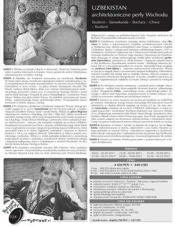 UZBEKISTAN architektoniczne perły Wschodu Taszkent – Samarkanda – Buchara – Chiwa – Taszkent Odpoczynek i zakupy na pobliskim bazarze Siab. Przejazd autobusem do Buchary. Po przyjeździe zakwaterowanie w hotelu. DZIEŃ 1 Zbiórka na lotnisku Okęcie w Warszawie. Wylot do Taszkentu przez jeden z portów lotniczych w Europie. Nocny przylot do stolicy Uzbekistanu, zakwaterowanie w hotelu i nocleg. DZIEŃ 5 Całodniowe zwiedzanie świętego miasta Uzbekistanu. Stara Buchara to jedno z najcenniejszych zespołów architektonicznych Orientu w Środkowej Azji. Wizyta w kompleksie Liabi Chauz, w medresie Ulugbek i Kukeldasz. Spacer i zakupy pod kopułami zabytkowego bazaru z XVI w. Dodatkowo możliwość targowania się z miejscowymi handlarzami podczas wymiany banknotów na słynnym targu Sarrafon. Docieramy do ChachmaAjub słynącego ze swego uzdrawiającego źródła gdzie zwiedzamy grobowiec Samanidesa, uznawany za „Perłę Orientu” i najstarszy zabytek islamu w Azji Środkowej. Poszukiwanie symbolu miasta - Wielkiego Minaretu Kalyana (XII w.) z bocianim gniazdem na szczycie. Nieopodal niego znajduje się medresa Chor-Minor z czterema malowniczymi minaretami. Wizyta w meczecie Magoki Attari z ornamentami świątyni buddyjskiej. Odwiedziny również Cytadeli Ark, kiedyś była to siedziba chanów, obecnie znajduje się tam Muzeum Historyczno-Etnograficzne. Z murów cytadeli rozpościera się jeden z najpiękniejszych widoków na miasto. Kolacja i powrót na nocleg do hotelu. DZIEŃ 2 Pobudka, po śniadaniu wyruszamy na zwiedzanie Taszkentu. W starej części miasta zwiedzanie największej medresy wybudowanej w stylu niespotykanym dla krajów muzułmańskich, na zlecenie wezyra Kukeldasz. Odwiedziny w sercu miasta - na placu Imama. Zwiedzanie meczetu Tilla DZIEŃ 6 Po śniadaniu wyjazd autobusem i przejazd przez rozległe obszary pustynne - wzdłuż trasy, którą podążały karawany kupców „jedwabnego Shayh, medresy Barak Khana, która jest centrum administracyjnym mufti szlaku”. Przyjazd do Chiwy - niewielkiego miasta „jedwabnego szlaku”, leoficjalnego przywódcy islamu oraz w mauzoleum słynnego filozofa i poety żącego w delcie rzeki Amu-Darii. Zakwaterowanie w hotelu, kolacja i czas Islamu Kafal Sashiego. Przejazd do placu Niepodległości, zwiedzanie Teatru wolny na wieczorne wędrówki po starożytnym mieście. Opery i Baletu oraz placu Emira Timura. Po południu wyruszamy do Samarkandy - najsłynniejszego miasta „jedwabnego szlaku”. Po przyjeździe zakwa- DZIEŃ 7 Otwarci na nowe wrażenia wyruszamy po śniadaniu na wędrówkę po mieście. Zwiedzanie starego miasta otoczonego XVI-wiecznymi murami terowanie w hotelu, kolacja i nocleg. obronnymi, w obrębie których znajduje się liczące 2,5 tys. lat stare miaDZIEŃ 3 Po śniadaniu całodniowe zwiedzanie imperium Timura, którego posto Ichan-Kala, (znajduje się na liście UNESCO). Odwiedziny w starej cyczątki sięgają VI w. p.n.e. Samarkanda jest do tej pory jednym z najsłyntadeli Kunya-Ark i mauzoleum Pachlwan-Mahmud oraz meczecie Dżuma niejszych ośrodków kultury, nauki i sztuki Islamu. Wizyta na placu Registan (X w.). Podziwianie minaretów Kalta Minar i Islam Khodja. Zwiedzamy także obejmującym medresy Uług-Bega, Szir Dar i Tillja Kori. Dalsze zwiedzanie medresy Allskuli-Chana i Amin-Chana oraz pałac Tasz Chauli. Spragnieni nie zabytków starego miasta, które swój niezapomniany urok zyskało za panowatylko wrażeń udajemy się skosztować zielonej herbaty z orientalnymi słodynia Uług Bega, wnuka Timura Wielkiego i astronoma, który wybudował słynczami i na pokaz tradycyjnych tańców. Kolacja i powrót do hotelu na nocleg. ne obserwatorium – obecnie cały kompleks znajduje się na liście UNESCO. Zwiedzanie mauzoleum Gur Emira i zespołu architektonicznego Szaki-Zinda DZIEŃ 8 Śniadanie w hotelu i transfer na lotnisko do Urgencz, lot do Taszkentu. Zakwaterowanie w hotelu, odpoczynek i czas wolny. Ostatnie zawraz z najbardziej czczonym miejscem pochówku kuzyna Mahometa, który kupy pamiątek na bazarze Chorsu - największym targowisku w Taszkencie, sprowadził islam w te strony. Oglądanie wykopalisk i muzeum ze słynnym które oferuje najwspanialsze i najbardziej wonne przyprawy Azji Środkowej. freskiem z VII w. na wzgórzu Afrosiab. Odwiedziny w fabryce papieru wyWieczorna uroczysta kolacja pożegnalna. Czas na przygotowanie do wylotu. rabianego z jedwabiu. Wizyta w studio jedwabiu połączona z prezentacją tradycyjnych wyrobów z jedwabiu i narodowych strojów. Możliwość zakupu DZIEŃ 9 Transfer na lotnisko. Przelot przez jeden z portów lotniczych w Eui degustacji najlepszego wina w Uzbekistanie z winiarni Hovrienko. W droropie do Warszawy. dze do hotelu kolacja. Nocleg w hotelu. DZIEŃ 4 Po śniadaniu zwiedzanie meczetu Bibi Chanum, który zaskakuje swoim ogromem i niepowtarzalną muzułmańską średniowieczną architekturą. Meczet otrzymał swoje imię na cześć ulubionej żony Timura Wielkiego. TERMINY 28.03 – 05.04.2013 27.04 – 05.05.2013* 25.05 - 02.06.2013 10.06 – 19.06.2013 21.09 – 29.09.2013 12.10 – 20.10.2013 CENA 4 450 PLN + 840 USD I rata: 800 PLN płatna przy zapisie II rata: 4 450 PLN płatne na 35 dni przed imprezą (minus I rata) III rata: 840 USD uczestnik zabiera ze sobą CENA ZAWIERA · · · · · · · przeloty na trasach: Warszawa - Taszkent - Warszawa; Urgench-Taszkent zakwaterowanie: hotele 3***/4**** pokoje 2-os. wyżywienie: śniadania i kolacje na całej trasie wewnętrzny transport: mikrobus lub autokar z klimatyzacją opiekę polskiego pilota na całej trasie opiekę lokalnego przewodnika ubezpieczenie Europa (KL 30 000 EUR i NNW 3 000 EUR) · · · · · opłat lotniskowych i biletów wstępu: 60 USD wizy do Uzbekistanu: 70 USD zwyczajowych napiwków: ok. 30 USD dopłaty do pokoju 1-osobowego: 160 USD opłat za filmowanie i fotografowanie CENA NIE ZAWIERA 124 * wysoki sezon – dopłata 780 PLN + 150 USD