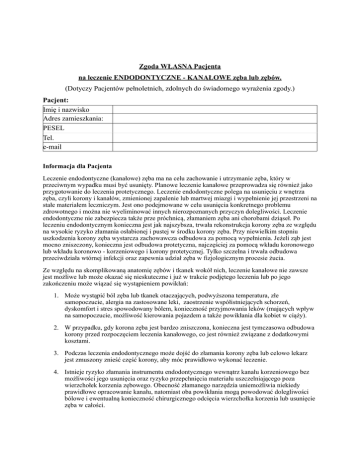 Zgoda WŁASNA Pacjenta na leczenie ENDODONTYCZNE - KANAŁOWE zęba lub zębów. (Dotyczy Pacjentów pełnoletnich, zdolnych do świadomego wyrażenia zgody.) Pacjent: Imię i nazwisko Adres zamieszkania: PESEL Tel. e-mail Informacja dla Pacjenta Leczenie endodontyczne (kanałowe) zęba ma na celu zachowanie i utrzymanie zęba, który w przeciwnym wypadku musi być usunięty. Planowe leczenie kanałowe przeprowadza się również jako przygotowanie do leczenia protetycznego. Leczenie endodontyczne polega na usunięciu z wnętrza zęba, czyli korony i kanałów, zmienionej zapalenie lub martwej miazgi i wypełnienie jej przestrzeni na stałe materiałem leczniczym. Jest ono podejmowane w celu usunięcia konkretnego problemu zdrowotnego i można nie wyeliminować innych nierozpoznanych przyczyn dolegliwości. Leczenie endodontyczne nie zabezpiecza także prze próchnicą, złamaniem zęba ani chorobami dziąseł. Po leczeniu endodontycznym konieczna jest jak najszybsza, trwała rekonstrukcja korony zęba ze względu na wysokie ryzyko złamania osłabionej i pustej w środku korony zęba. Przy niewielkim stopniu uszkodzenia korony zęba wystarcza zachowawcza odbudowa za pomocą wypełnienia. Jeżeli ząb jest mocno zniszczony, konieczna jest odbudowa protetyczna, najczęściej za pomocą wkładu koronowego lub wkładu koronowo - korzeniowego i korony protetycznej. Tylko szczelna i trwała odbudowa przeciwdziała wtórnej infekcji oraz zapewnia udział zęba w fizjologicznym procesie żucia. Ze względu na skomplikowaną anatomię zębów i tkanek wokół nich, leczenie kanałowe nie zawsze jest możliwe lub może okazać się nieskuteczne i już w trakcie podjętego leczenia lub po jego zakończeniu może wiązać się wystąpieniem powikłań: 1. Może wystąpić ból zęba lub tkanek otaczających, podwyższona temperatura, złe samopoczucie, alergia na zastosowane leki, zaostrzenie współistniejących schorzeń, dyskomfort i stres spowodowany bólem, konieczność przyjmowania leków (mających wpływ na samopoczucie, możliwość kierowania pojazdem a także powikłania dla kobiet w ciąży). 2. W przypadku, gdy korona zęba jest bardzo zniszczona, konieczna jest tymczasowa odbudowa korony przed rozpoczęciem leczenia kanałowego, co jest również związane z dodatkowymi kosztami. 3. Podczas leczenia endodontycznego może dojść do złamania korony zęba lub celowo lekarz jest zmuszony znieść część korony, aby móc prawidłowo wykonać leczenie. 4. Istnieje ryzyko złamania instrumentu endodontycznego wewnątrz kanału korzeniowego bez możliwości jego usunięcia oraz ryzyko przepchnięcia materiału uszczelniającego poza wierzchołek korzenia zębowego. Obecność złamanego narzędzia uniemożliwia niekiedy prawidłowe opracowanie kanału, natomiast oba powikłania mogą powodować dolegliwości bólowe i ewentualną konieczność chirurgicznego odcięcia wierzchołka korzenia lub usunięcie zęba w całości. 5. W trakcie leczenia kanałowego zęba z założoną koroną protetyczną dochodzi do nieodrwacalnego uszkodzenia tej korony lub zachodzi konieczność jej świadomego usunięcia. 6. Istnieje ryzyko niemożności opracowania kanału w całości na skutek jego zwapnienia lub wcześniejszego nieprawidłowego leczenia. 7. Istnieje niebezpieczeństwo perforacji (przedziurawianie) ściany kanału lub korony miazgi zęba, czego następstwem może być konieczność dodatkowego zabiegu zamknięcia perforacji, a w razie jego nieskuteczności – usunięcie zęba. 8. Mogą wystąpić: zaostrzenie stanu zapalnego, dolegliwości bólowe, obrzęk, przetoka lub ropień. Może okazać się konieczna antybiotykoterapia i/lub interwencja chirurgiczna. 9. Korona zęba może ulec złamaniu, czego konsekwencją będzie konieczność zastosowania leczenia protetycznego (tj. wkład koronowo – korzeniowy i korona protetyczna) lub chirurgicznego (tj usunięcie zęba, jeśli szpara złamania przebiega w sposób uniemożliwiający leczenia protetyczne). 10. W przypadku leczenia zębów ze zmianami okołowierzchołkowymi istnieje ryzyko, że mimo prawidłowo przeprowadzonego leczenia, zmiany te nie ulegną wygojeniu, postępowanie w takich przypadkach polega na usunięciu wierzchołka korzenia wraz ze zmianami lub usunięciu całego korzenia lub połowy zęba (dotyczy zębów wielokorzeniowych) lub zęba w całości. 11. W przypadku kanałów o skomplikowanej anatomii, nietypowym przebiegu, kanałów niedrożnych lub zębów leczonych w przeszłości istnieje dodatkowe zwiększone ryzyko powikłań. 12. Warunkiem powodzenia leczenia kanałowego jest oprócz szczelnego wypełnienia kanału także szczelne wypełnienie ubytku, a jeśli nie jest to możliwe ze względu na duże zniszczenie zęba, wykonanie wkładu koronowo – korzeniowego i korony protetycznej, co jest również związane z dodatkowymi kosztami. 13. W trakcie leczenia endodontyczego istnieje konieczność wykonania kilku zdjęć rentgenowskich (nie mniej niż 2). 14. Po zakończeniu leczenia Pacjent jest zobowiązany do wizyt kontrolnych wraz ze zdjęciami RTG w terminach zaleconych przez lekarza 15. Niekiedy trzeba przeprowadzić rewizję leczenia endodontycznego czyli ponowne leczenie kanałowe w sytuacji występowania dolegliwości bólowych ze strony zęba leczonego kanałowo, widocznego na zdjęciu rentgenowskim nieprawidłowego wypełnienia kanałów korzeniowych, gdy ząb jest przeznaczony do leczenia protetycznego (korony protetyczne, wkłady koronowo -korzeniowy, mosty) , występowanie widocznych na zdjęciu rentgenowskim zmian w kości, które nie wygoiły się po leczeniu kanałowym. Leczenie powtórne jest zawsze trudniejsze i nie w każdym przypadku można je wykonać jedynie zachowawczą, mało inwazyjną metodą leczenia. Jest też obciążone większym ryzykiem powikłań czy niepowodzeń. W pewnych sytuacjach leczony ząb może wymagać, zabiegu chirurgii endodontycznej lub usunięcia. 16. Ząb leczony kanałow