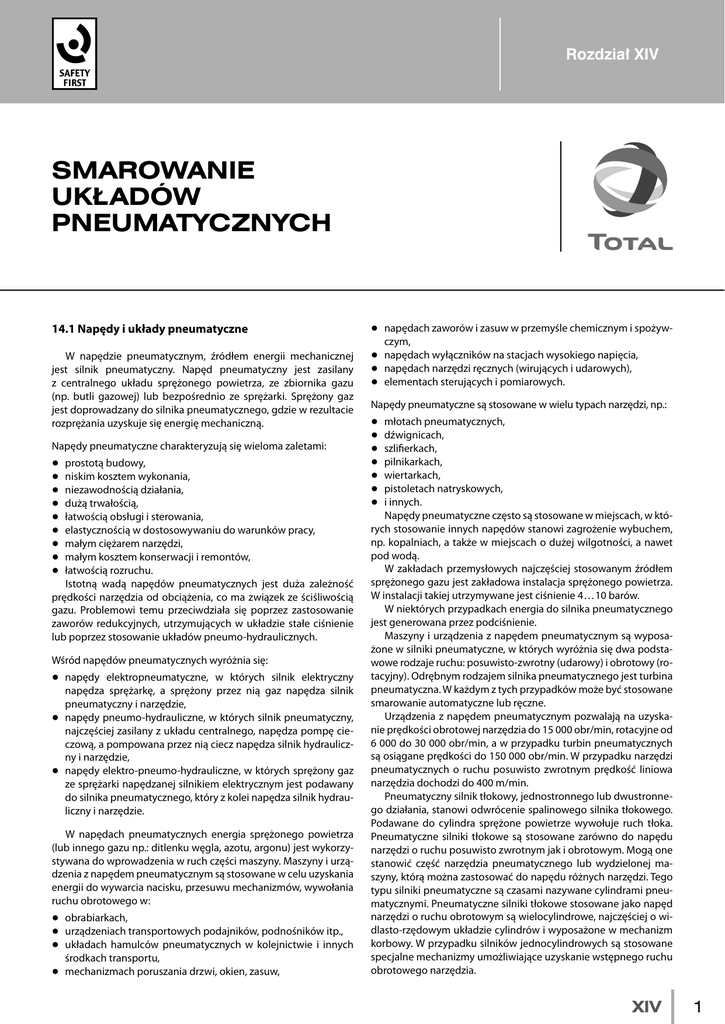 Rozdział XIV: Smarowanie układów pneumatycznych Rozdział XIV SMAROWANIE UKŁADÓW PNEUMATYCZNYCH 14.1 Napędy i układy pneumatyczne W napędzie pneumatycznym, źródłem energii mechanicznej jest silnik pneumatyczny. Napęd pneumatyczny jest zasilany z centralnego układu sprężonego powietrza, ze zbiornika gazu (np. butli gazowej) lub bezpośrednio ze sprężarki. Sprężony gaz jest doprowadzany do silnika pneumatycznego, gdzie w rezultacie rozprężania uzyskuje się energię mechaniczną. Napędy pneumatyczne charakteryzują się wieloma zaletami: prostotą budowy, niskim kosztem wykonania, niezawodnością działania, dużą trwałością, łatwością obsługi i sterowania, elastycznością w dostosowywaniu do warunków pracy, małym ciężarem narzędzi, małym kosztem konserwacji i remontów, łatwością rozruchu. Istotną wadą napędów pneumatycznych jest duża zależność prędkości narzędzia od obciążenia, co ma związek ze ściśliwością gazu. Problemowi temu przeciwdziała się poprzez zastosowanie zaworów redukcyjnych, utrzymujących w układzie stałe ciśnienie lub poprzez stosowanie układów pneumo-hydraulicznych. q q q q q q q q q Wśród napędów pneumatycznych wyróżnia się: q napędy elektropneumatyczne, w których silnik elektryczny napędza sprężarkę, a sprężony przez nią gaz napędza silnik pneumatyczny i narzędzie, q napędy pneumo-hydrauliczne, w których silnik pneumatyczny, najczęściej zasilany z układu centralnego, napędza pompę cieczową, a pompowana przez nią ciecz napędza silnik hydrauliczny i narzędzie, q napędy elektro-pneumo-hydrauliczne, w których sprężony gaz ze sprężarki napędzanej silnikiem elektrycznym jest podawany do silnika pneumatycznego, który z kolei napędza silnik hydrauliczny i narzędzie. W napędach pneumatycznych energia sprężonego powietrza (lub innego gazu np.: ditlenku węgla, azotu, argonu) jest wykorzystywana do wprowadzenia w ruch części maszyny. Maszyny i urządzenia z napędem pneumatycznym są stosowane w celu uzyskania energii do wywarcia nacisku, przesuwu mechanizmów, wywołania ruchu obrotowego w: q obrabiarkach, q urządzeniach transportowych podajników, podnośników itp., q układach hamulców pneumatycznych w kolejnictwie i innych środkach transportu, q mechanizmach poruszania drzwi, okien, zasuw, q napędach zaworów i zasuw w przemyśle chemicznym i spożywczym, q napędach wyłączników na stacjach wysokiego napięcia, q napędach narzędzi ręcznych (wirujących i udarowych), q elementach sterujących i pomiarowych. Napędy pneumatyczne są stosowane w wielu typach narzędzi, np.: młotach pneumatycznych, dźwignicach, szlifierkach, pilnikarkach, wiertarkach, pistoletach natryskowych, i innych. Napędy pneumatyczne często są stosowane w miejscach, w których stosowanie innych napędów stanowi zagrożenie wybuchem, np. kopalniach, a także w miejscach o dużej wilgotności, a nawet pod wodą. W zakładach przemysłowych najczęściej stosowanym źródłem sprężonego gazu jest zakładowa instalacja sprężonego powietrza. W instalacji takiej utrzymywane jest ciśnienie 4 … 10 barów. W niektórych przypadkach energia do silnika pneumatycznego jest generowana przez podciśnienie. Maszyny i urządzenia z napędem pneumatycznym są wyposażone w silniki pneumatyczne, w których wyróżnia się dwa podstawowe rodzaje ruchu: posuwisto-zwrotny (udarowy) i obrotowy (rotacyjny). Odrębnym rodzajem silnika pneumatycznego jest turbina pneumatyczna. W każdym z tych przypadków może być stosowane smarowanie automatyczne lub ręczne. Urządzenia z napędem pneumatycznym pozwalają na uzyskanie prędkości obrotowej narzędzia do 15 000 obr/min, rotacyjne od 6 000 do 30 000 obr/min, a w przypadku turbin pneumatycznych są osiągane prędkości do 150 000 obr/min. W przypadku narzędzi pneumatycznych o ruchu posuwisto zwrotnym prędkość liniowa narzędzia dochodzi do 400 m/min. Pneumatyczny silnik tłokowy, jednostronnego lub dwustronnego działania, stanowi odwrócenie spalinowego silnika tłokowego. Podawane do cylindra sprężone powietrze wywołuje ruch tłoka. Pneumatyczne silniki tłokowe są stosowane zarówno do napędu narzędzi o ruchu posuwisto zwrotnym jak i obrotowym. Mogą one stanowić część narzędzia pneumatycznego lub wydzielonej maszyny, którą można zastosować do napędu różnych narzędzi. Tego typu silniki pneumatyczne są czasami nazywane cylindrami pneumatycznymi. Pneumatyczne silniki tłokowe stosowane jako napęd narzędzi o ruchu obrotowym są wielocylindrowe, najczęściej o widlasto-rzędowym układzie cylindrów i wyposażone w mechanizm korbowy. W przypadku silników jednocylindrowych są stosowane specjalne mechanizmy umożliwiające uzyskanie wstępnego ruchu obrotowego narzędzia. q q q q q q q XIV 1 14.1 Schemat przemysłowego układu pneumatycznego z tłokiem zawracanym sprężyną 1 – wlot powietrza, 2 – filtr, 3 – wkraplacz oleju, 4 – sprężarka, 5 – zbiornik sprężonego powietrza, 6 – manometr, 7 – zawór odstojnika, 8 – reduktor ciśnienia, 9 – rozdzielacz (zawór rozrządu), 10 – pneumatyczny silnik tłokowy, 11 – wylot powietrza, 12 – sprężyna zapewniająca powrót tłoka, 13 – narzędzie 14.4 Zasada działania pneumatycznego silnika zębatkowego 1 – wlot sprężonego powietrza, 2 – wylot powietrza, 3 – napędzane koła zębate, 4 – korpus silnika 14.2 Nitownica pneumatyczna I – komora powietrzna przed bijakiem, II – komora powietrzna za bijakiem; 1 – głowica nitująca, 2 – sprężyna powodująca powrót głowicy, 3 – bijak, 4 – lufa, 5 – suwak rozrządczy, 6 – kanał doprowadzający powietrze, 7 – kanał doprowadzający powietrze przed suwak rozrządczy oraz do komory powietrznej I, 8 – kanał doprowadzający powietrze za suwak rozrządczy i do komory powietrznej II gaz, który rozprężając się obraca wirnik. Rozprężony gaz jest wydalany na zewnątrz. Najczę