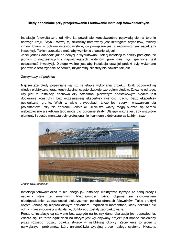 Błędy popełniane przy przojektowaniu i budowanie instalacji fotowoltaicznych Instalacje fotowoltaiczne od kilku lat powoli ale konsekwentnie pojawiają się na terenie naszego kraju. Szybki rozwój tej dziedziny hamowany jest szeregiem czynników, między innymi lukami w polskim ustawodawstwie, co powiązane jest z ekonomicznymi aspektami inwestycji. Takich przeszkód możnaby wymienić znacznie więcej. Jeżeli jednak dochodzi już do decyzji o wybudowaniu takiej instalacji to należy pamiętać, że jednym z najczęstszych i najważniejszych kryteriów, jakie musi być spełnione, jest opłacalność inwestycji. Dlatego ważne jest aby instalacja oraz jej projekt były wykonane poprawnie oraz zgodnie ze sztuką inżynierską. Niestety nie zawsze tak jest. Zaczynamy od projektu Najczęstsze błędy popełniane są już na etapie wykonania projektu. Brak odpowiedniej wiedzy elektrycznej oraz konstrukcyjnej często skutkuje szeregiem błędów. Zależnie od tego, czy jest to instalacja dachowa czy naziemna, pierwszym podstawowym błędem jest dobieranie konstrukcji bez wcześniejszej ekspertyzy nośności dachu bądź ekspertyzy geologicznej gruntu. Wiatr w wielu przypadkach także jest sporym wyzwaniem dla projektantów. Przy źle dobranej konstrukcji silniejsze wiatry mogą okazać się bardzo niebezpieczne a skutkiem tego mogą być ogromne straty. Dlatego ważne jest aby wszystkie elementy i sposób montażu były profesjonalnie i sumiennie dobierane za każdym razem. Źródło: www.google.pl Instalacja fotowoltaiczna to nic innego jak instalacja elektryczna łącząca ze sobą prądy i napięcia stałe ze zmiennymi. Nieznajomość różnic objawia się stosowaniem nieodpowiednich zabezpieczeń elektrycznych po obu stronach falowników. Takie praktyki często kończą się nieprawidłowym działaniem urządzeń w momentach, kiedy oczekuje się od nich niezawodności w działaniu, do którego zostały zaprojektowane. Ponadto, instalacje są stawiane bez względu na to, czy dana lokalizacja jest odpowiednia. Zdarza się, że teren bądź dach na którym jest wykonywany projekt jest mocno zacieniany przez różnego rodzaju obiekty stojące w najbliższej okolicy. Zecienienie to jeden z największych problemów, który uniemożliwia wydajną pracę całego systemu. Niestety, nawet zacienienie małej powierzchni może skutkować wyłączeniem z pracy całej lub części instalacji w zależności od wybranych rozwiązań projektowych. Producenci modułów fotowoltaicznych starają się temu przeciwdziałać stasując w swoich produktach diody bocznikujące, które pozwalają przepływać prądowi tylko przez część niezacienionych celek PV. Najlepsze produkty mają nawet do trzech takich diod, co daje możliwość pracy nawet 2/3 systemu przy zacienieniu do 1/3. Zdarza się że przy projektowaniu te rozwiązania nie są brane pod uwagę i moduły rozmieszczane są w ułożeniu pozwalającym na zacienianie fragmentu wszystkich obwodów zamiast tylko jednego. W przypadku, kiedy nie można wyeliminować przysłonięcia, można zastosować np. obwód na oddzielnym falowniku, który zostanie wyłączony z produkcji zamiast całej instalacji. Źródło: www.google.pl Zróżnicowane warunki atmosferyczne w dużym stopniu wpływają na produkcję energii elektrycznej ze słońca. Jeżeli klimat jest bardzo ciepły to sprawność instalacji spada, co przejawia się mniejszą produkcją. Także spadek temperatury ma wpływ na system - może nie bezpośrednio na produkcję energii, jednak podnosi napięcie na zaciskach modułów. Ważne jest aby uwzględnić to przy doborze falownika. W przeciwnym razie będzie on przeciążony, a w ekstremalnych przypadkach może zostać uszkodzony. Ważnym elementem jest projektowanie instalacji dokładnie na potrzeby Inwestora. W przypadku średnich i dużych elektrowni, projektowanych w celach zarobkowych, znaczenie mają tylko możliwości finansowe oraz przyłączeniowe. Małe przydomowe instalacje są niekiedy projektowane pod hasłem „ile się zmieści” co jest błędem. Każda instalacja powinna być przemyślana i wykonana dokładnie według potrzeb inwestora, w zależności od tego, czy energia ma być produkowana na własne potrzeby, czy będzie mozliwość odsprzedaży nadwyżek do sieci. Wykonanie Podczas samego montażu instalacji można zauważyć częste błędy popełniane przez wykonawców. Nasilającym się zaniedbaniem jest już samo niedbałe wykonanie, które mocno odbiega od standardów. Żródło: https://www.google.pl/search?q=photovoltaic+wrong&es_sm=93&source=lnms&tbm=isch&sa=X&ei=q4xnU6XUN ouI7AboyICICw&ved=0CAYQ_AUoAQ&biw=1810&bih=870#q=zle+wykonana+instalacja+fotowoltaiczna&tbm=isc h&facrc=_&imgdii=_&imgrc=9aAJjnJa4vRtgM%253A%3BjqAciaD3uQaK2M%3Bhttp%253A%252F%252Fobrazki .elektroda.pl%252F1119016700_1385068286.jpg%3Bhttp%253A%252F%252Fposzukaj.elektroda.pl%252Fszuk aj%252Clutowanie-instalacji.html%3B1832%3B3264 Podczas montażu na pierwszym miejscu stać powinno bezpieczeństwo oraz przestrzeganie przepisów BHP. W praktyce prace na wysokości bez zabezpieczenia oraz bez oznaczenia terenu podczas montażu mniejszych instalacji są ciągle praktykowane. Dzieje się tak ze względu na wprowadzane na każdym etapie oszczędności. Konsekwencją tego typu działań jest np. brak odpowiednich narzędzi do wykonania konkretnych prac. W wyniku czego stają się one trudniejsze do dokładnego i schludnego wykonania przez monterów. Nasila się wykorzystywanie elementów zamiennych, bez odpowiednich testów jakościowych popartych odpowiednimi certyfikatami, takich jak: okablowanie, zabezpieczenia, konstrukcje montażowe, itp. Źródło: https://www.google.pl/search?q=photovoltaic+mistakes&es_sm=93&source=lnms&tbm=isch&sa=X&ei=01ZrU5nQ CYqy7AbHyoGwCw&ved=0CAgQ_AUoAQ&biw=1904&bih=927#q=installation+pv+mistake&tbm=isch&facrc=_&i mgdii=_&imgrc=Igd0RDT3Q5QgIM%253A%3B6wR8YJAHqiGsQM%3Bhttp%253A%252F%252Flothianrenewabl es.co.uk%252Ffiles%252F2